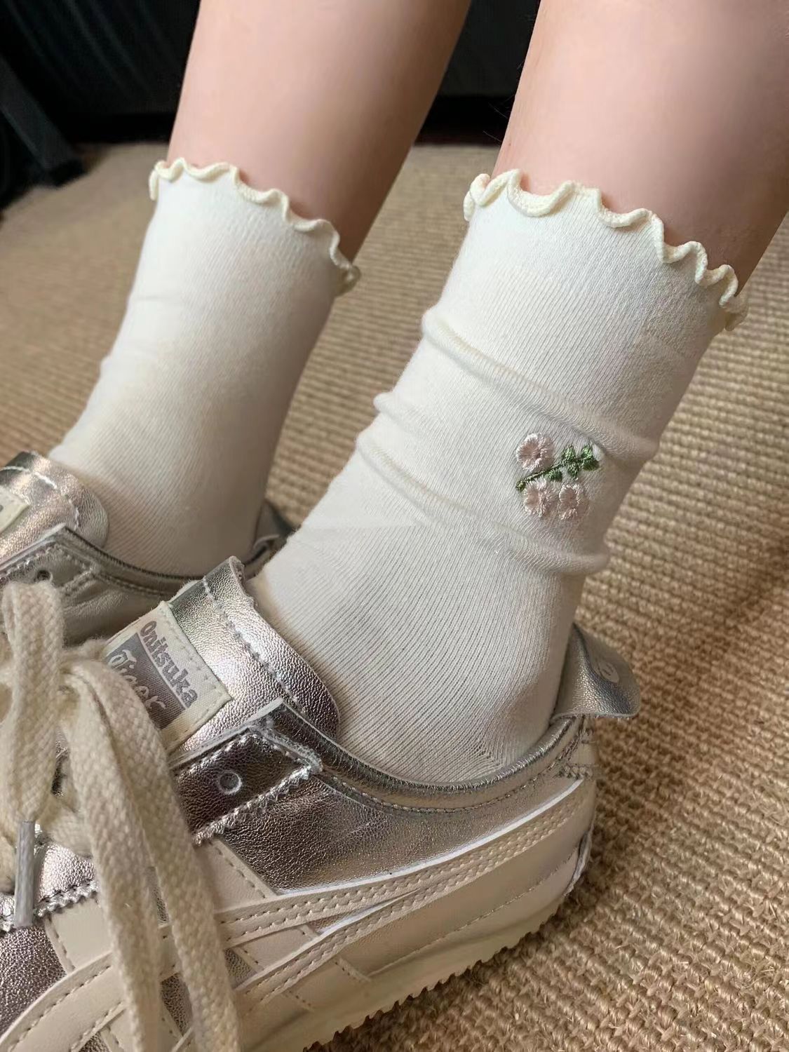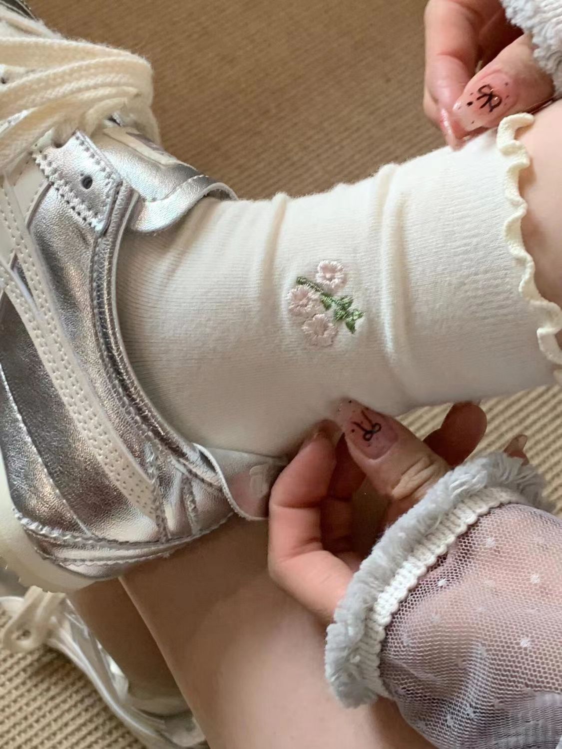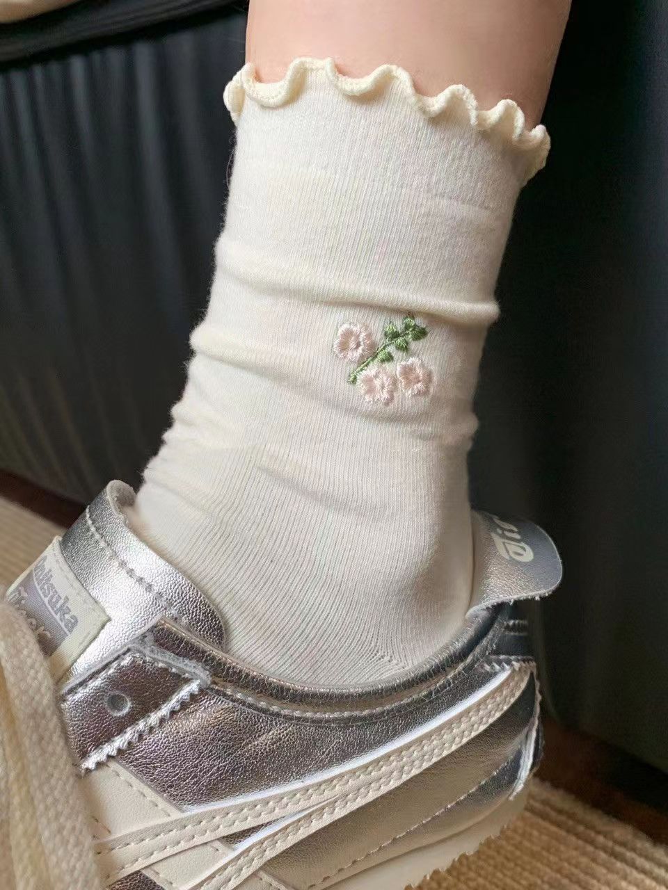 봄여름 꽃무늬 단색 컬 양말, 귀엽고 장난스러운 레이스 종아리 양말, 크림색 땀흡수 양말