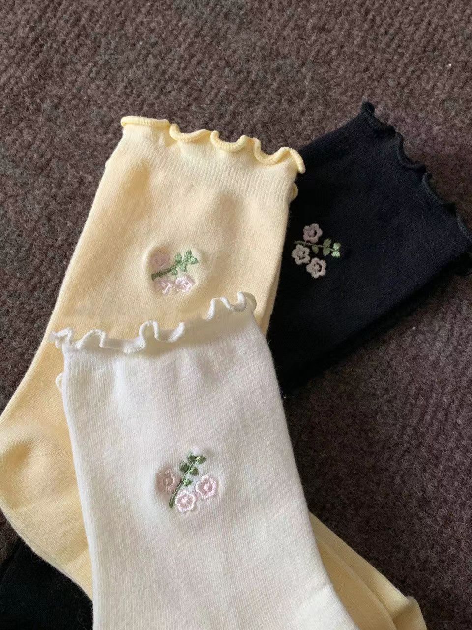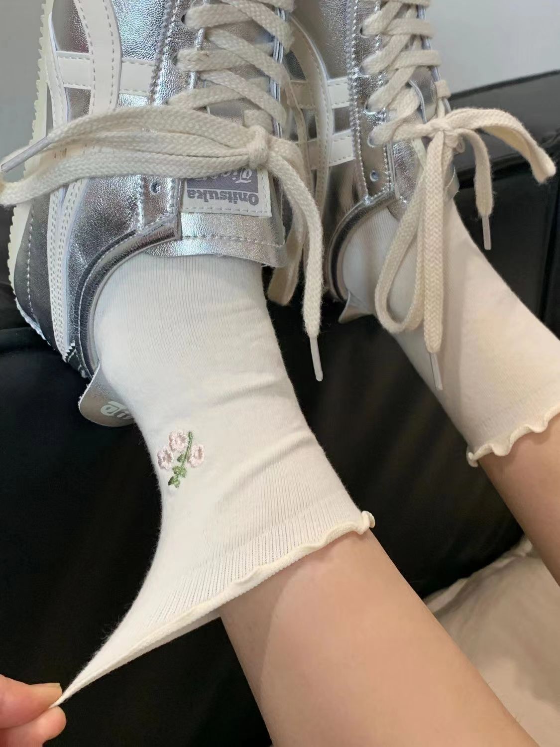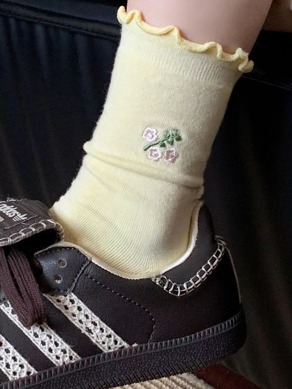 봄여름 꽃무늬 단색 컬 양말, 귀엽고 장난스러운 레이스 종아리 양말, 크림색 땀흡수 양말