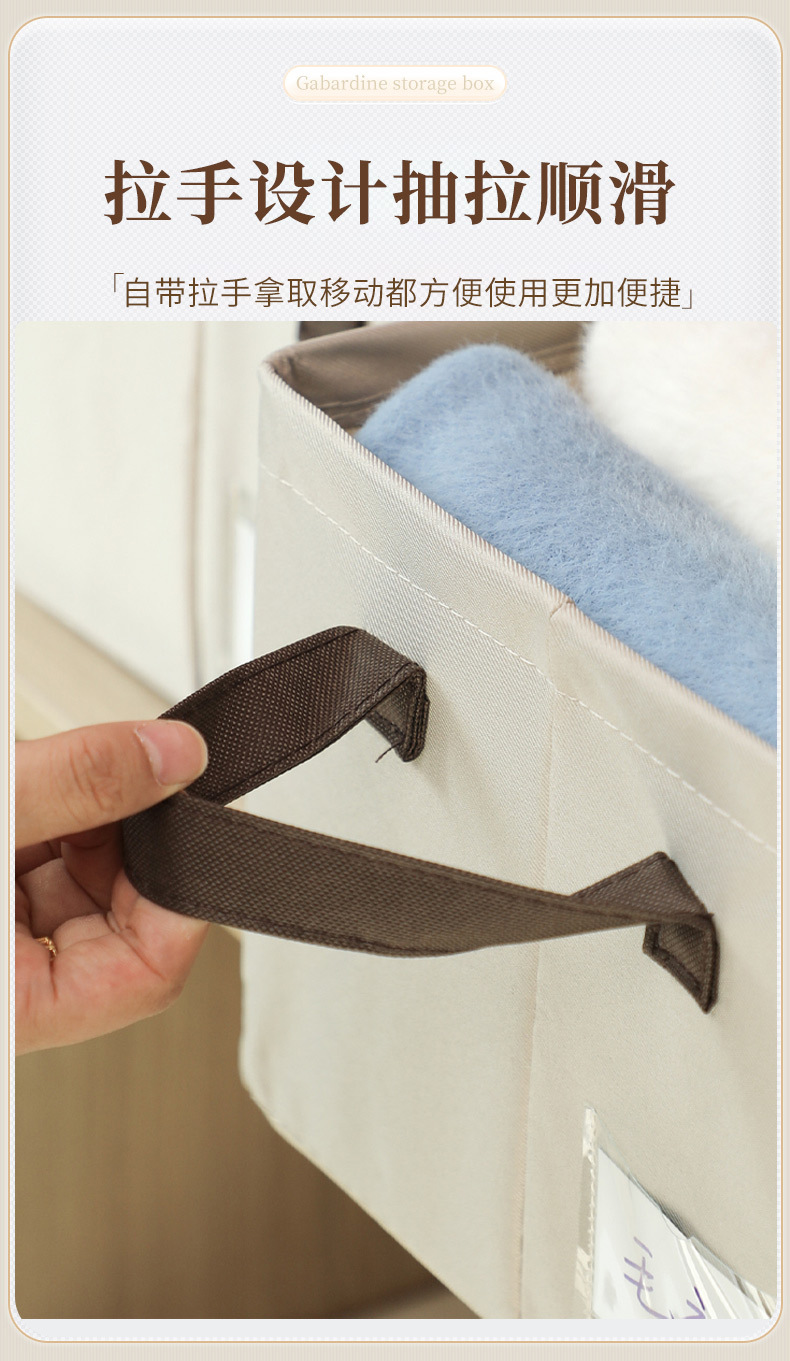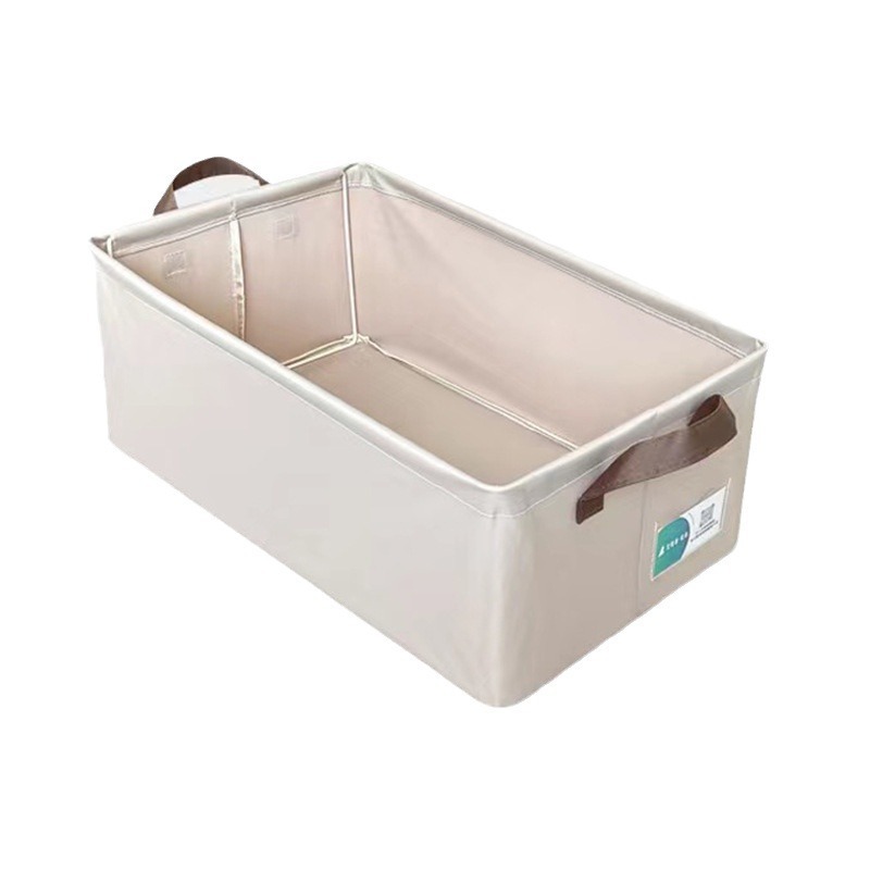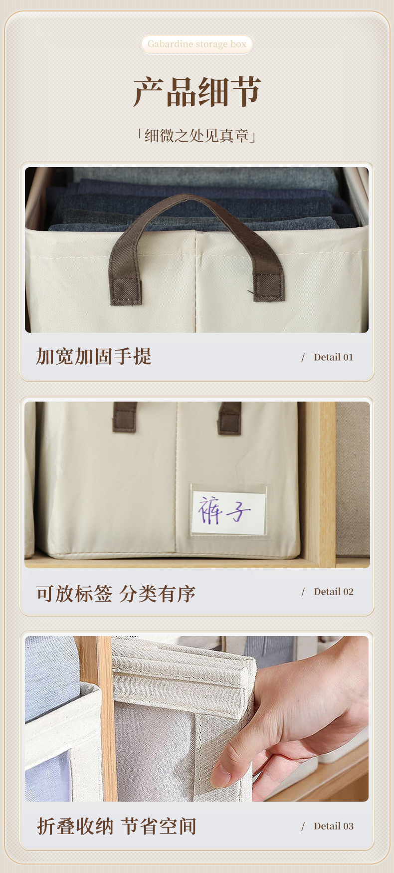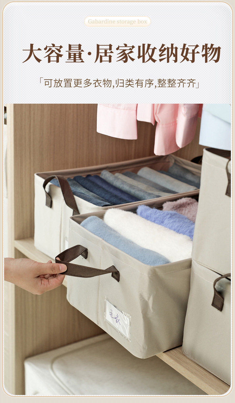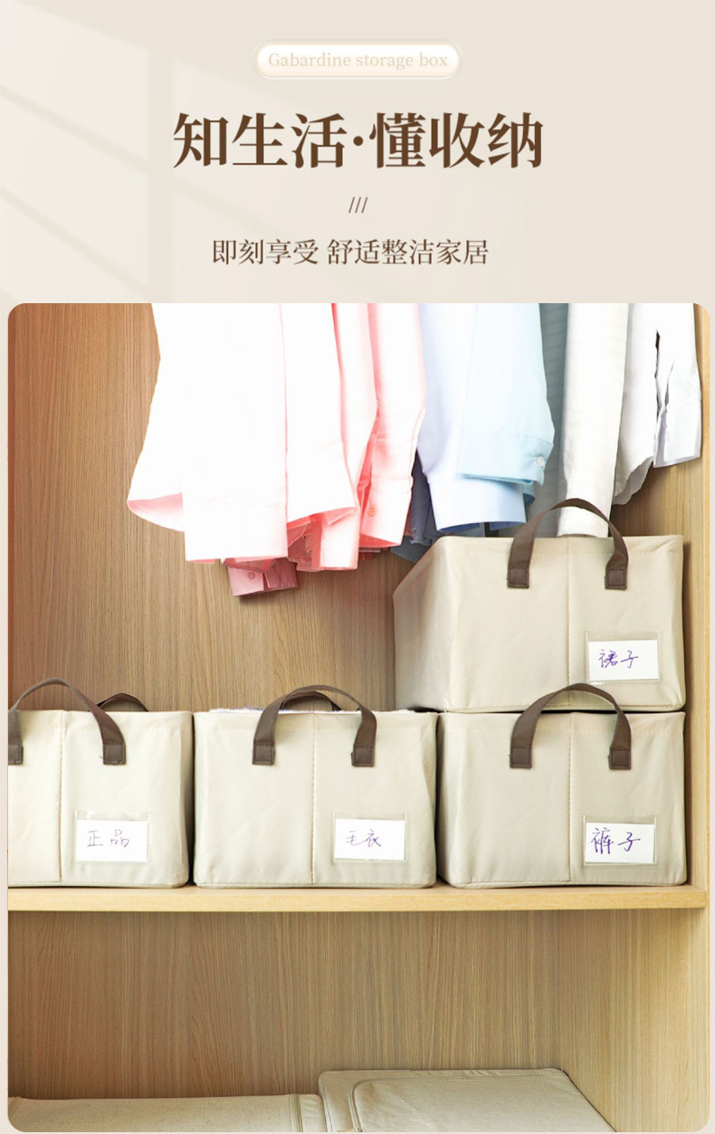 这款华达呢防水面料衣裤折叠收纳盒,尺寸:47X28X20CM;平时放于室内收纳衣物、裤子、书籍等一些生活用品;使房间内杂乱无章的场面瞬间整齐规划;同时平时难找的想穿的衣裤可以随时找到,方便生活,节省时间!材料是精致上档次的华达呢面料,里面带防水涂层、喷塑钢架,底部是结实牢固密度板,两边带喷塑钢架支撑;带结实的手提;不用时可以折叠存放,节省室内空间;整体质量牢固,经济实用,防水、耐脏、易打理;尤其价格实惠,欢迎选购!