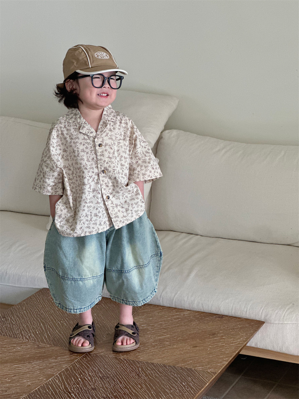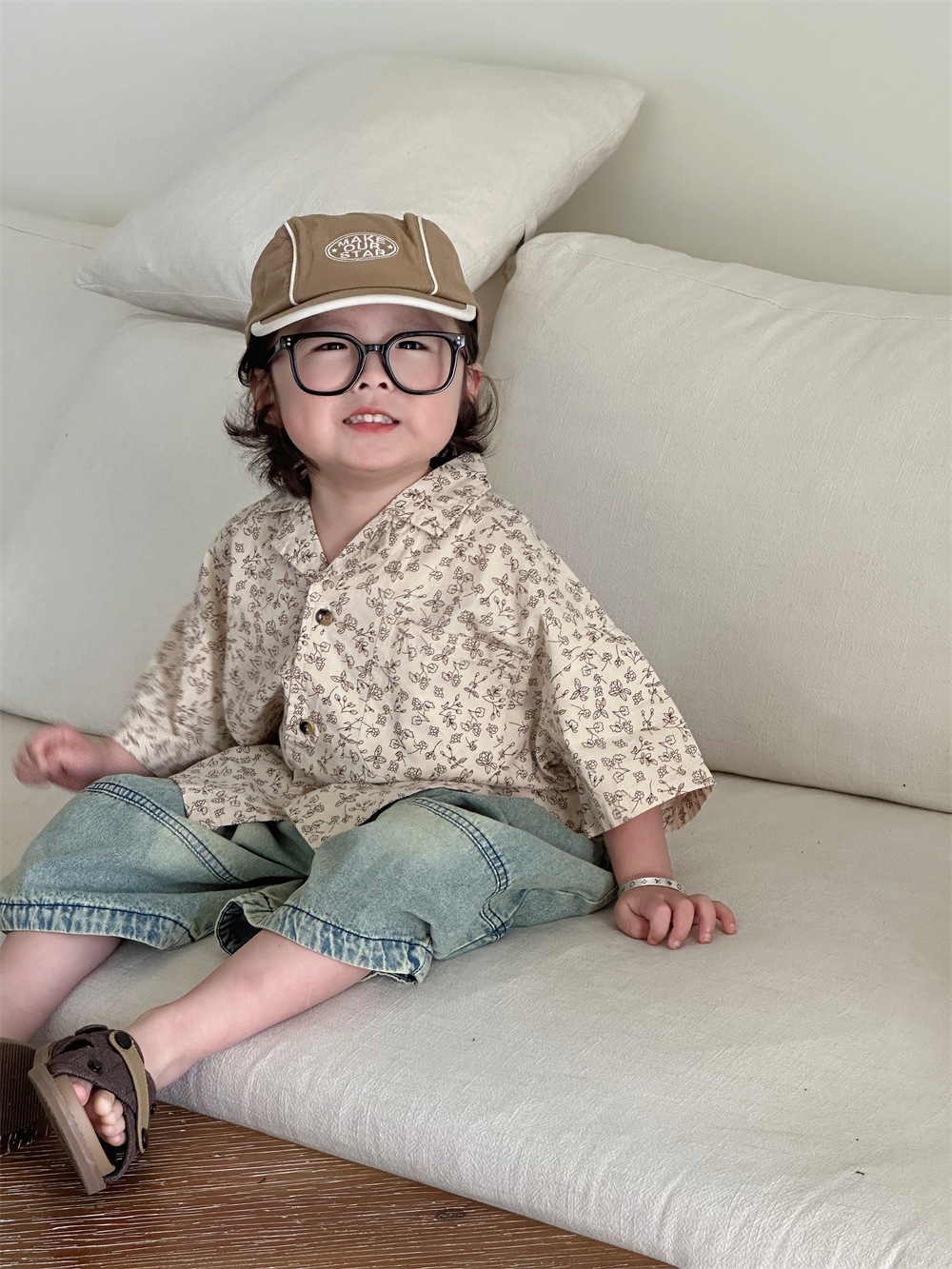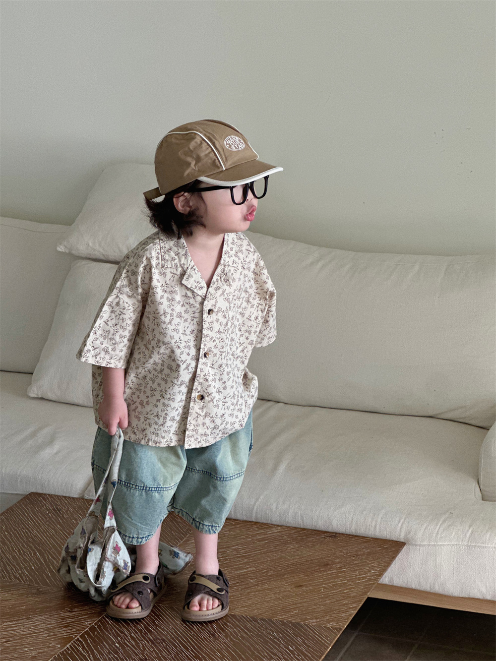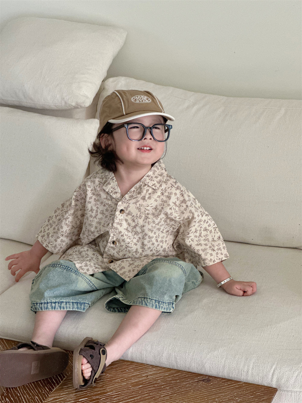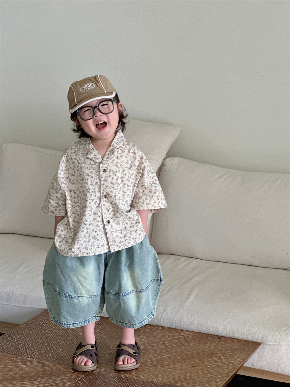 몽테뉴면 꽃 반팔 어린이 셔츠 2024 새로운 한국 스타일 소년 아동복 아기 캐주얼 팬 홍콩 스타일 탑스토어 가기