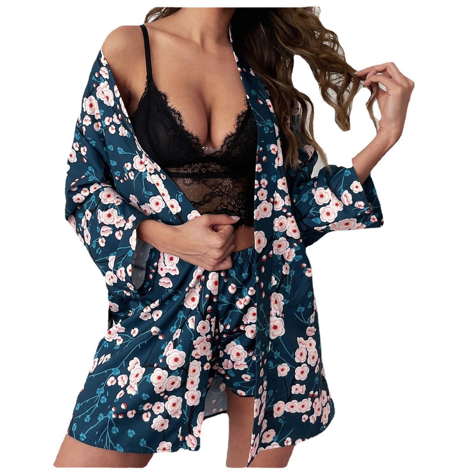 2023 새로운 유럽과 미국의 패션 모조 실크 대조 섹시한 세트 인쇄 카디건 여성 스팟은 머리카락 세대를 지원합니다.