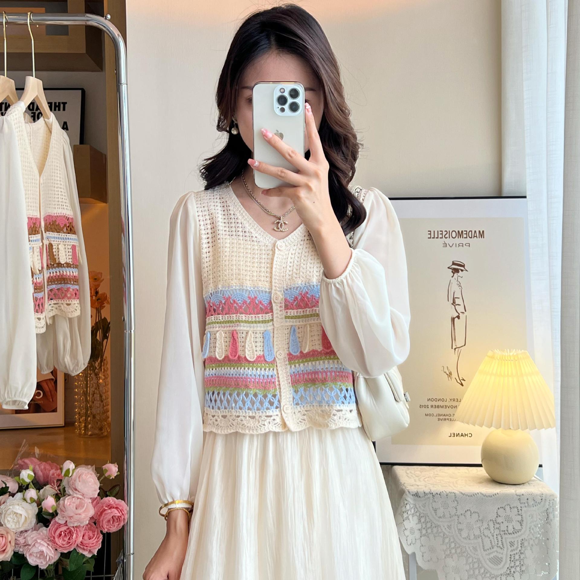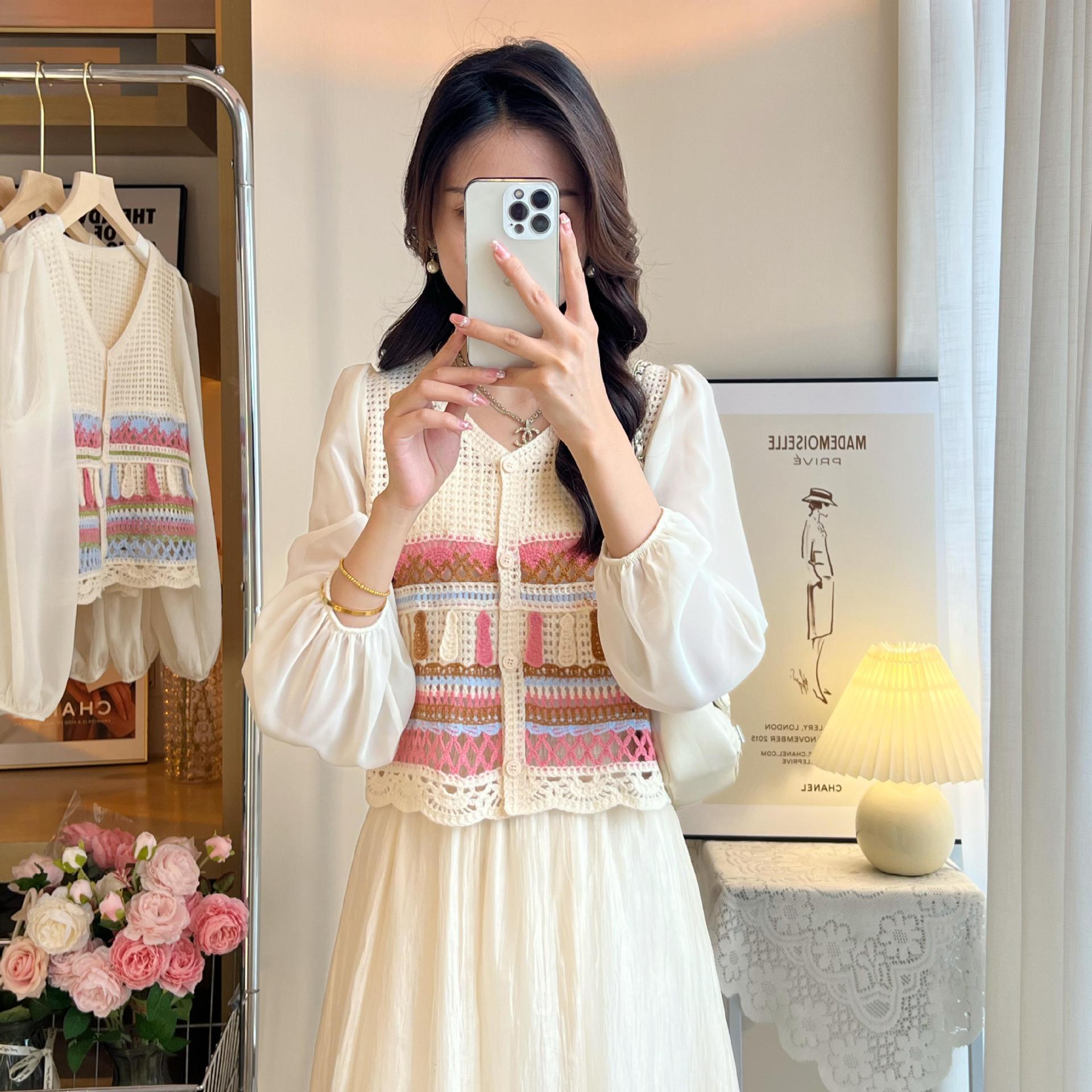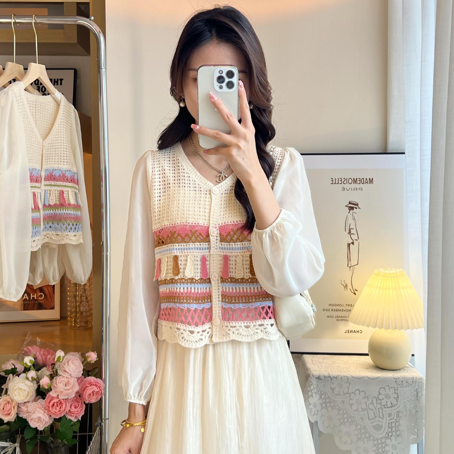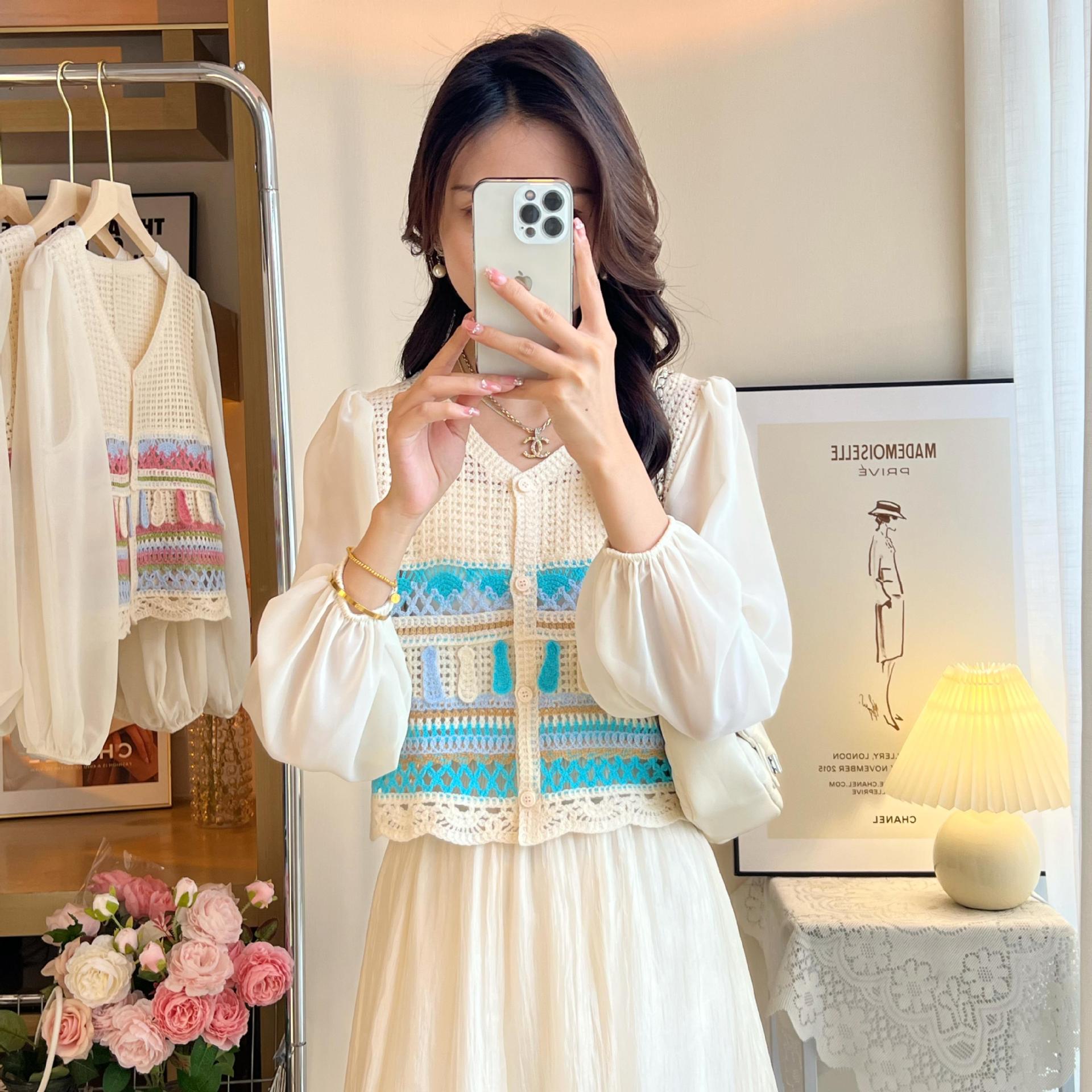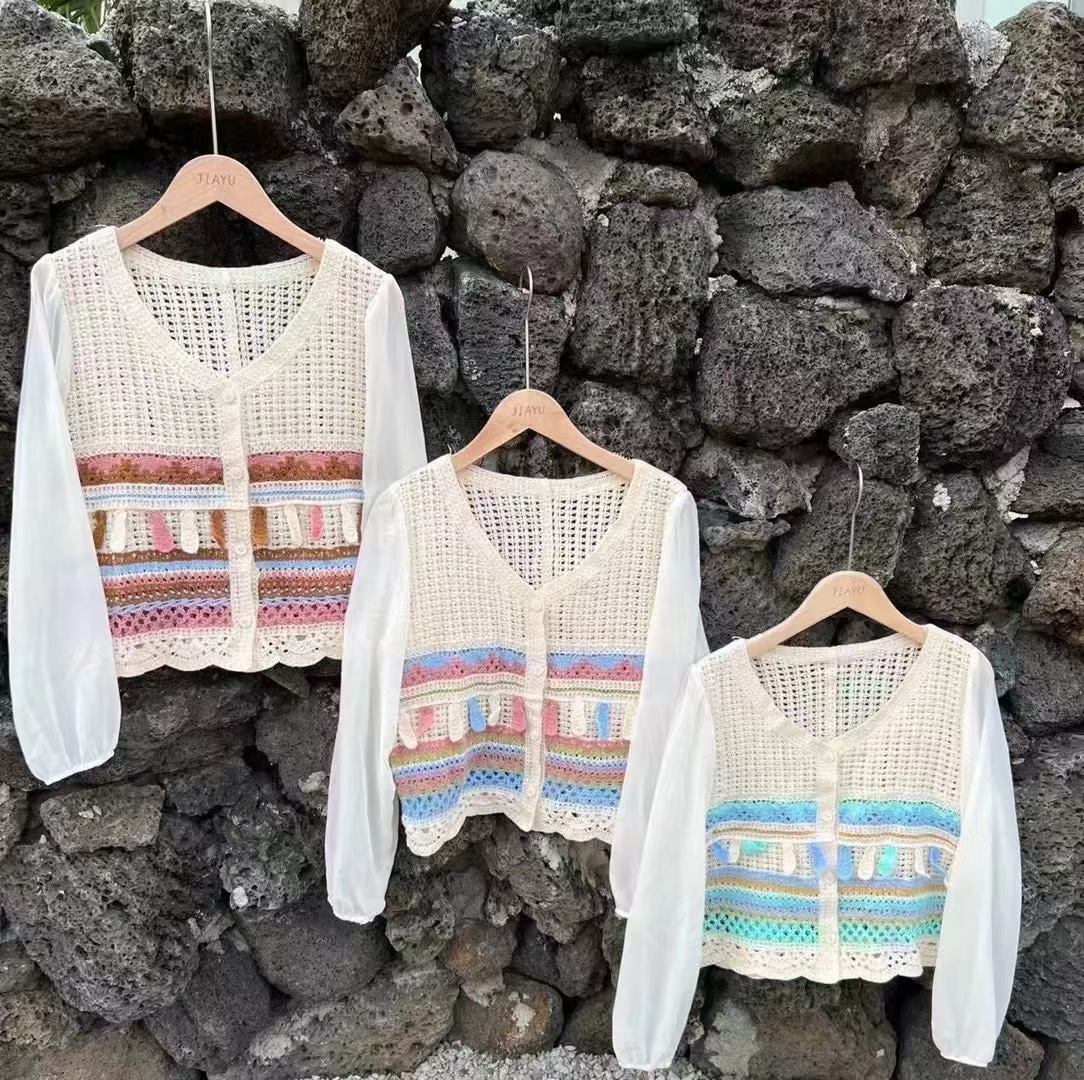 시폰 긴팔 바느질 V 넥 카디건 태양 보호 셔츠 여성의 여름 새로운 할로우 아웃 니트웨어 우아한 레이디