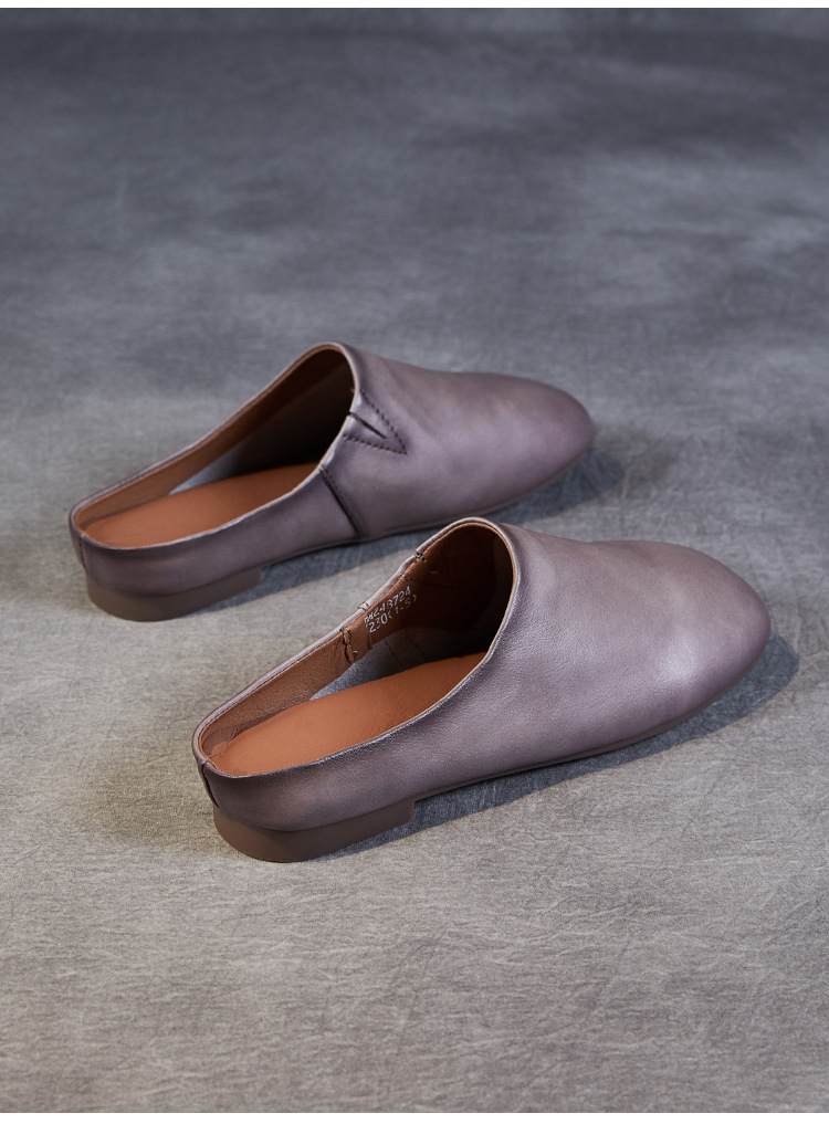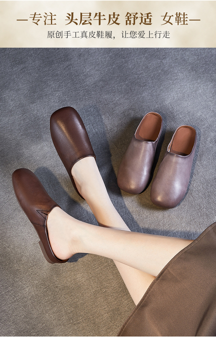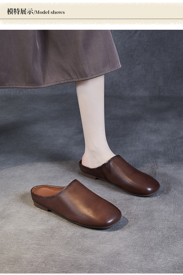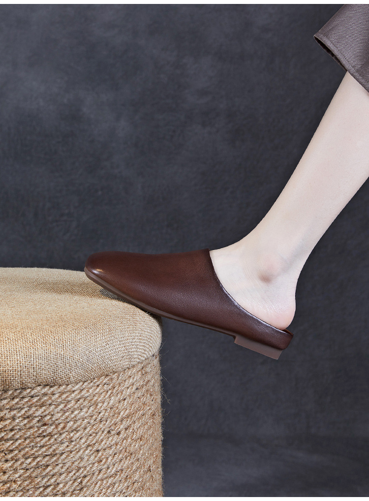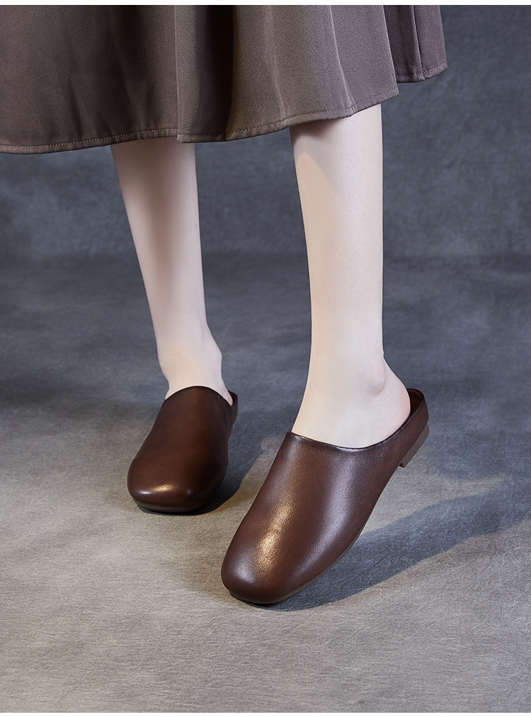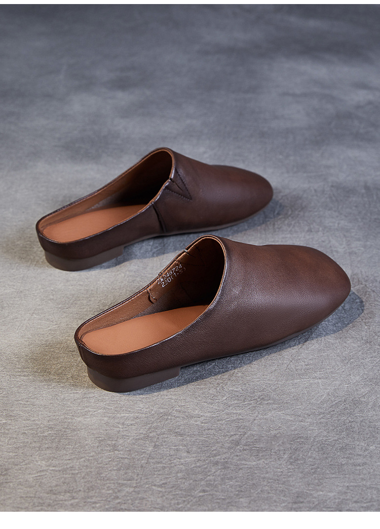 여름 2024 새로운 둥근 발가락 Cowhide 아웃웨어 샌들 로우 힐 소프트 가죽 플랫 밀크 신발 캐주얼 심플 올 매치 슬리퍼