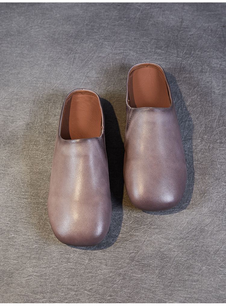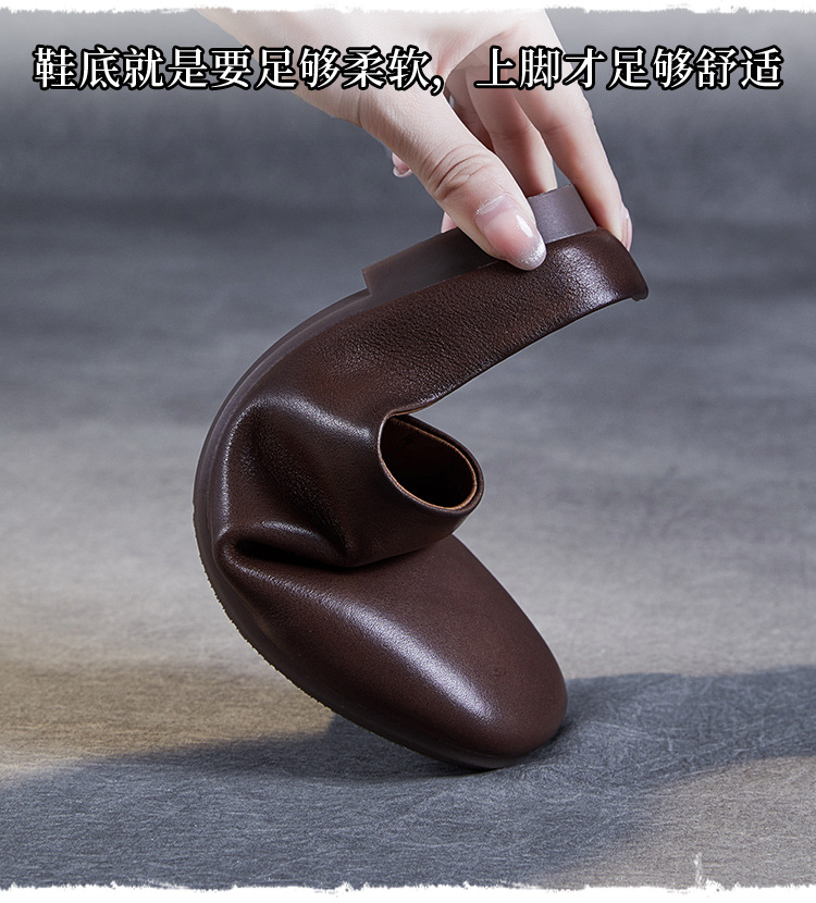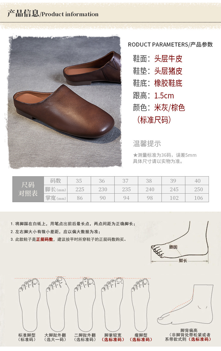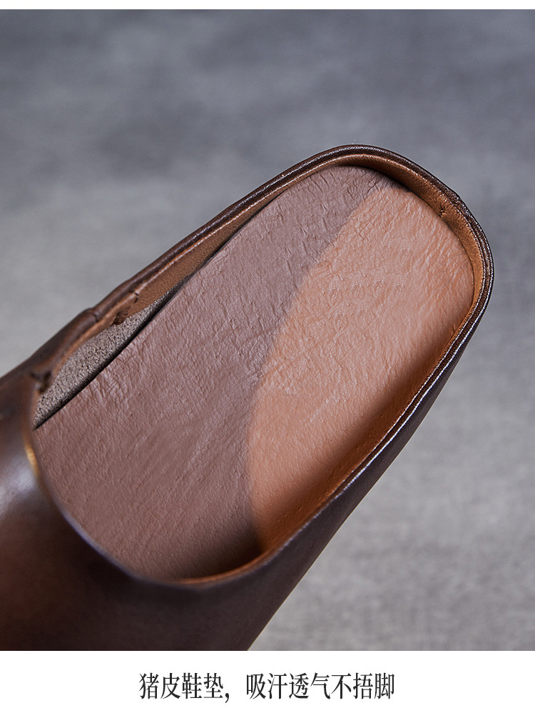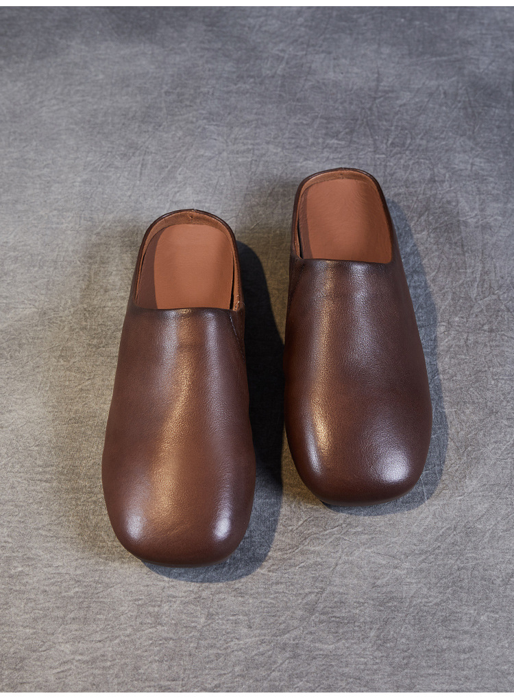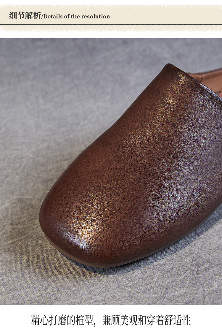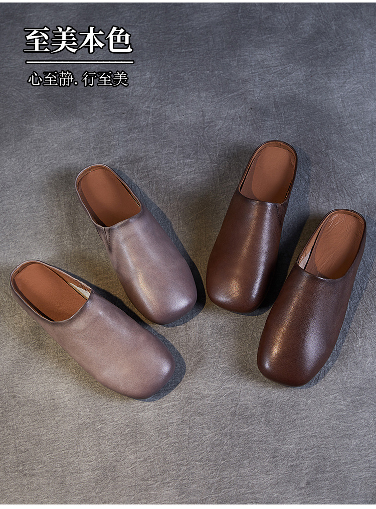 여름 2024 새로운 둥근 발가락 Cowhide 아웃웨어 샌들 로우 힐 소프트 가죽 플랫 밀크 신발 캐주얼 심플 올 매치 슬리퍼