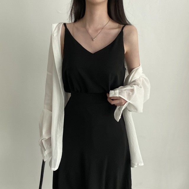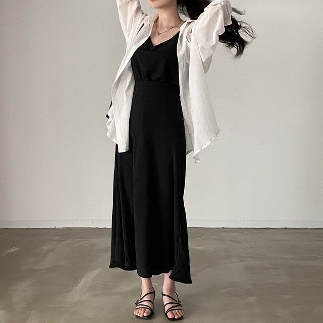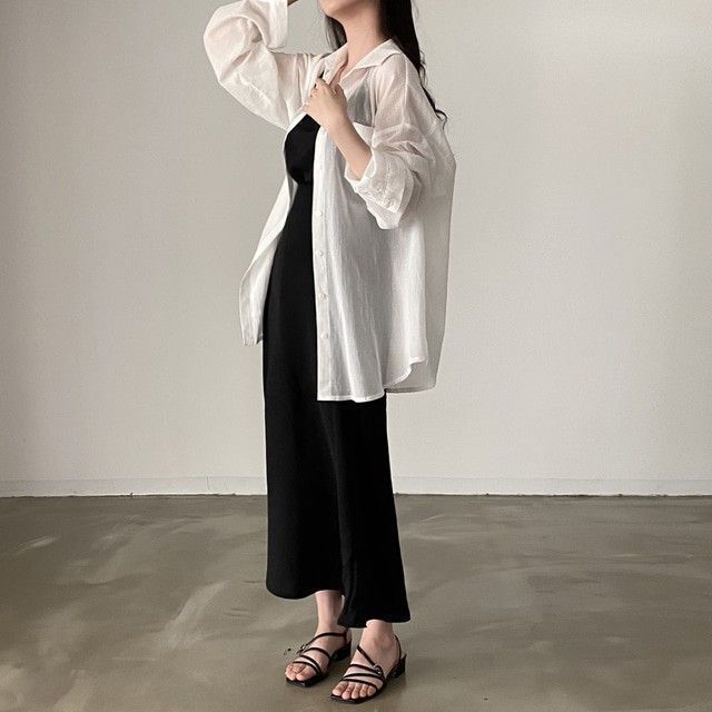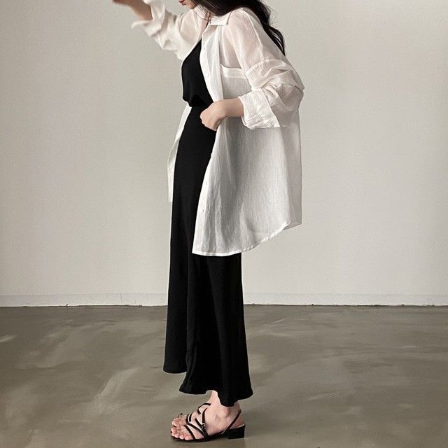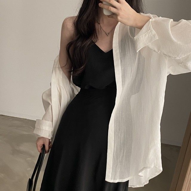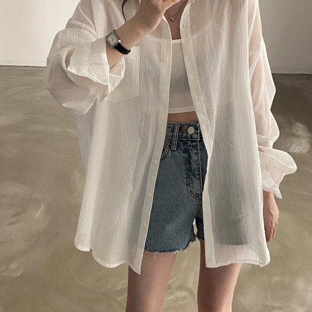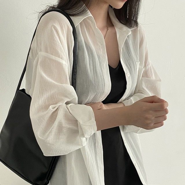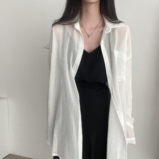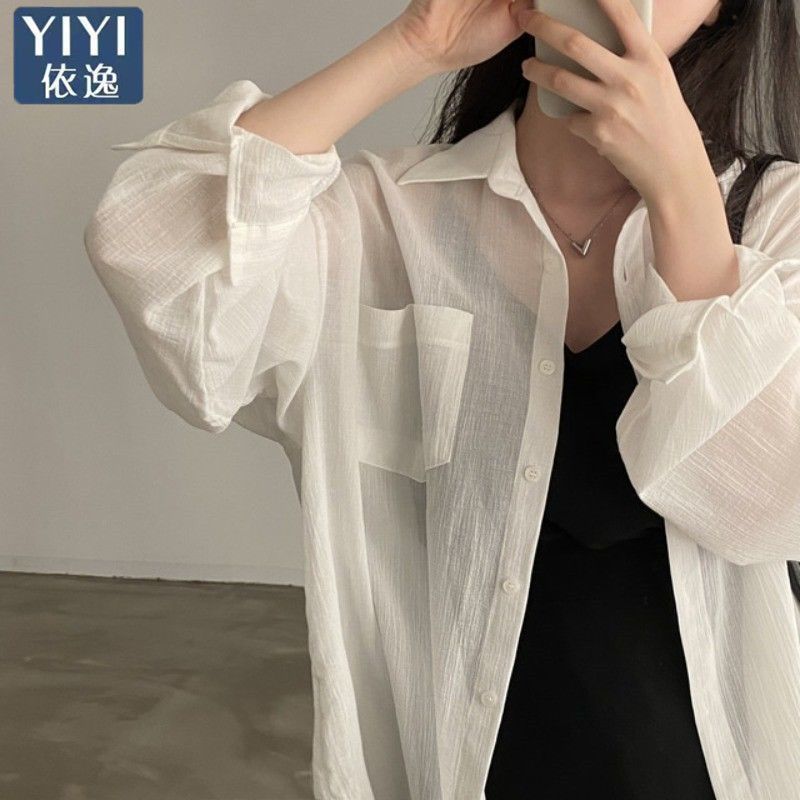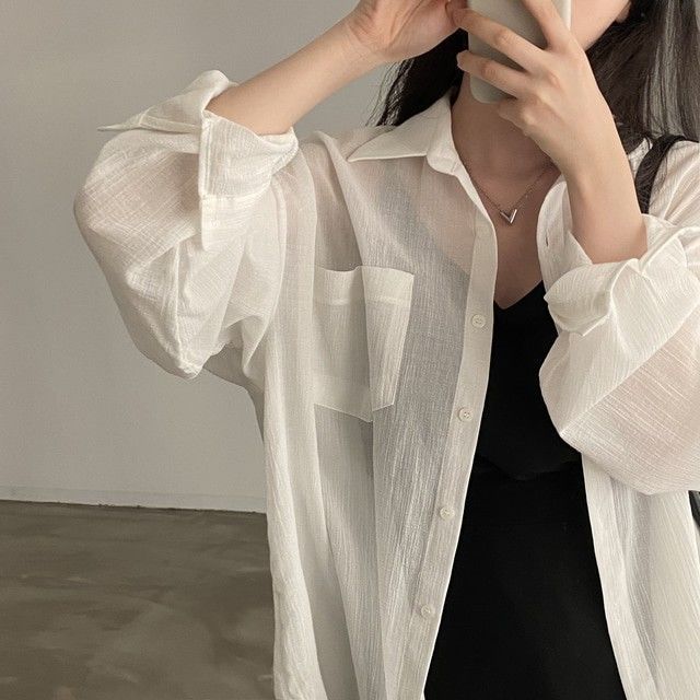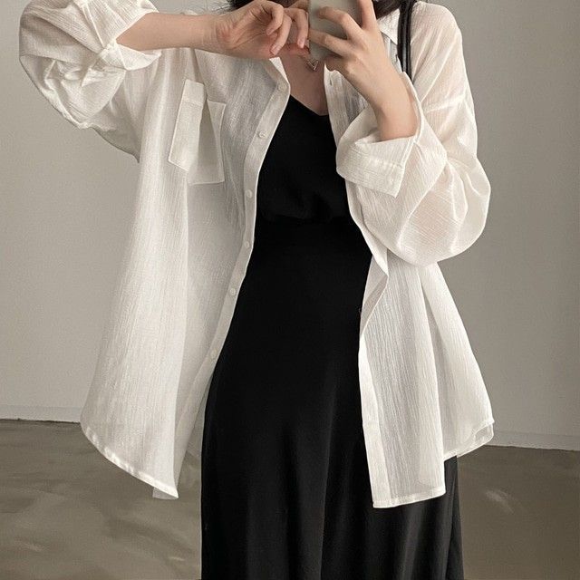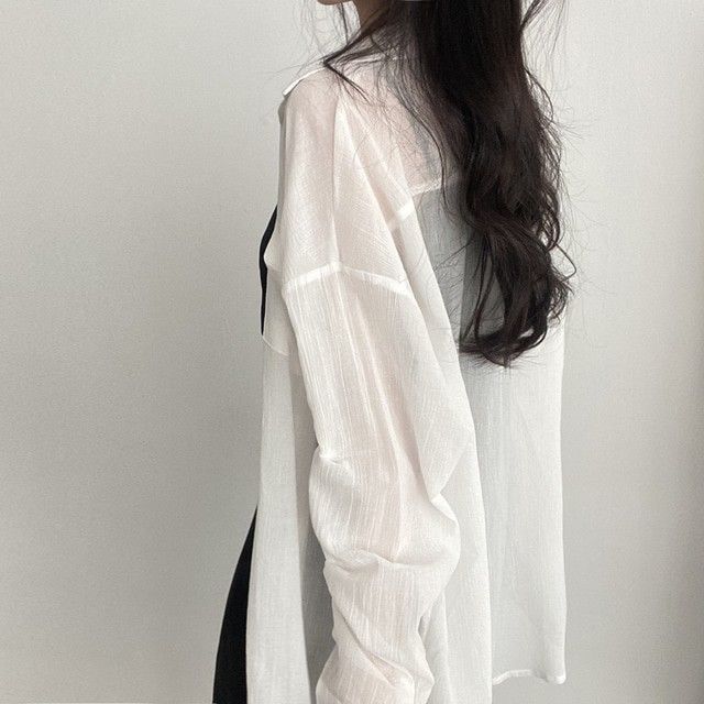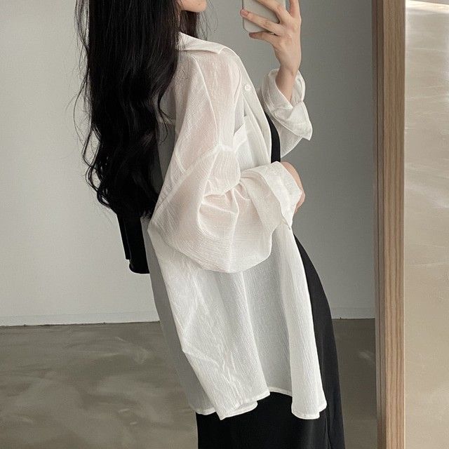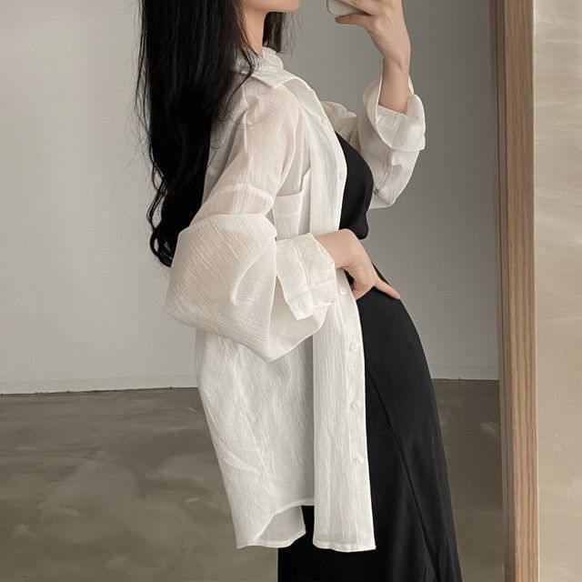 2024 봄과 여름 얇은 선 스크린 셔츠 여자 올 매치 아우터 착용 중간 길이 긴팔 쉬폰 유행 화이트 탑스토어 가기
