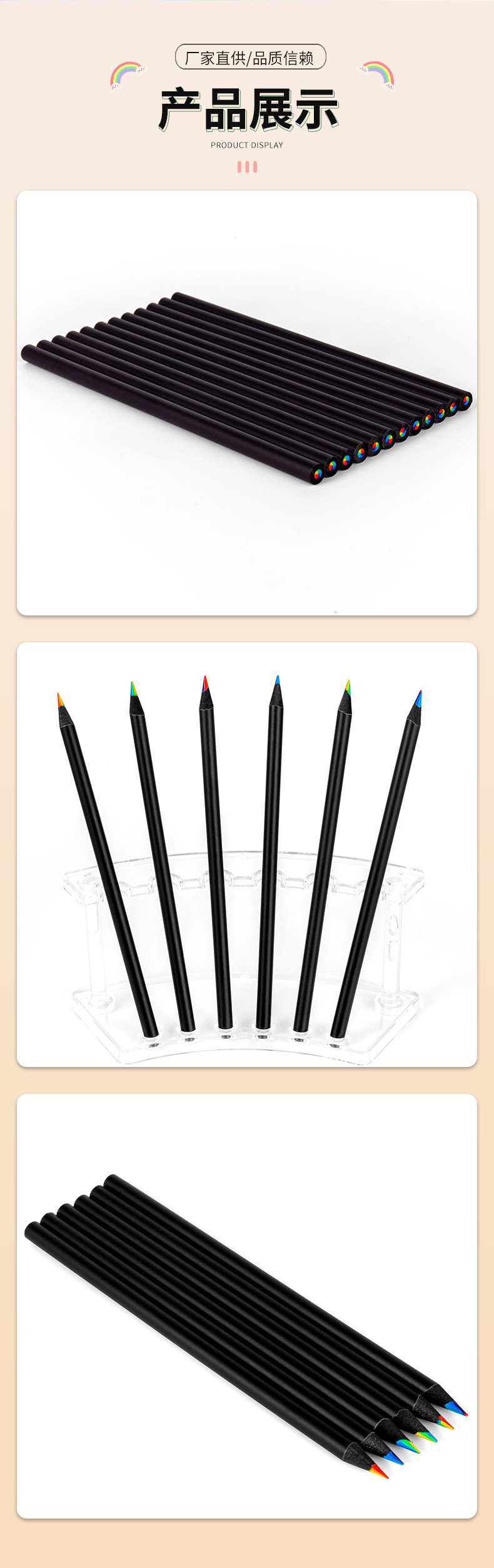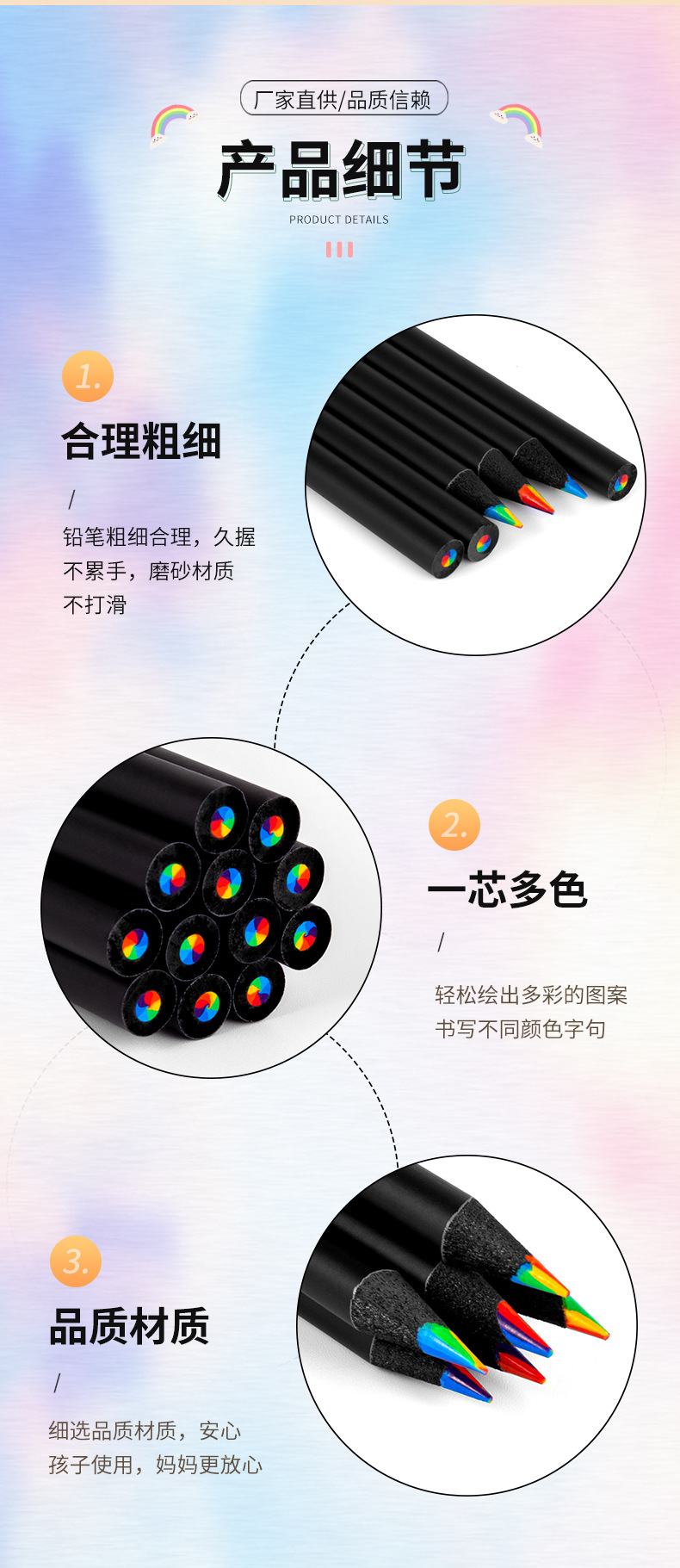 국경 간 공급 블랙 우드 7 색 코어 컬러 도매 폭발적인 무지개 어린이 그림 연필 3.3 코어