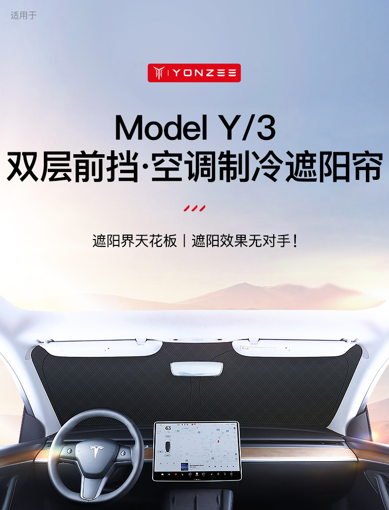 YZ는 새로운 버전의 Tesla ModelY/3 전면 방패 차양 유리 창 상단 단열재 자외선 차단제 액세서리에 적용됩니다.