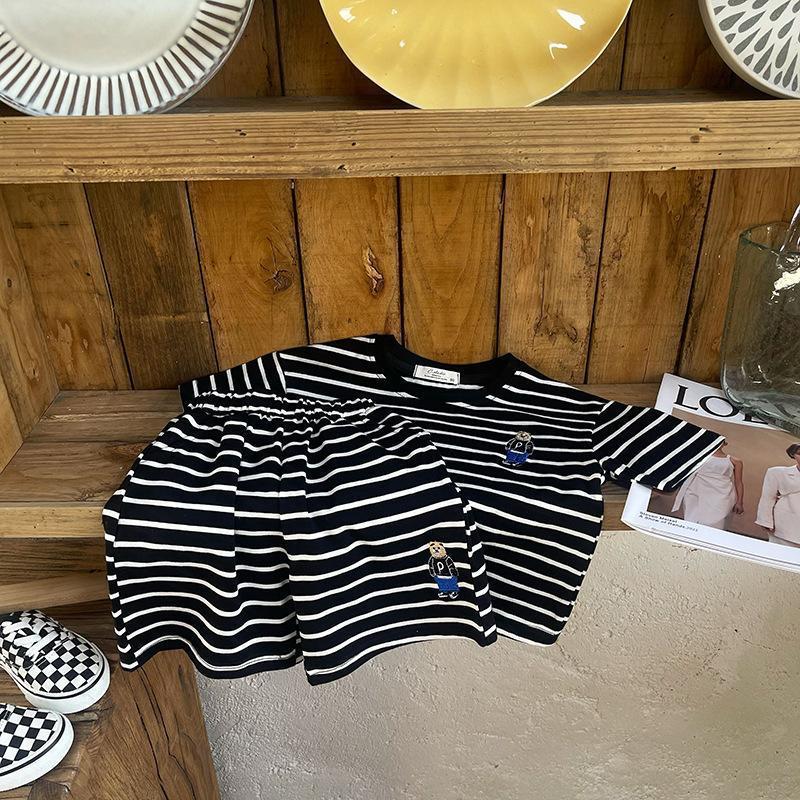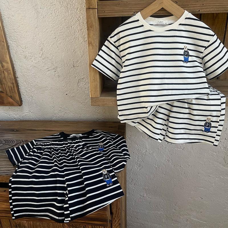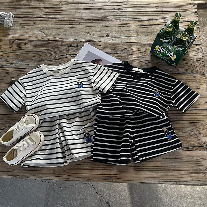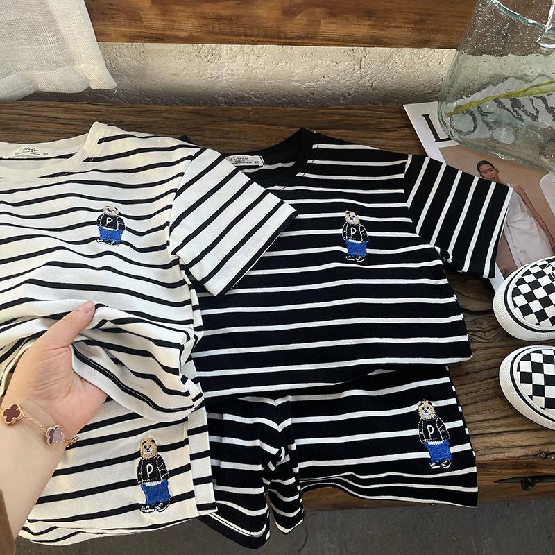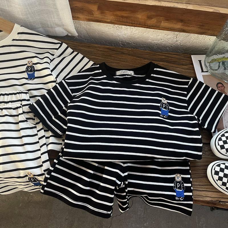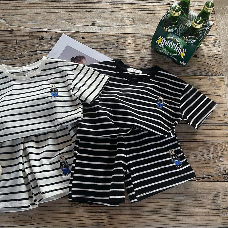 소년 줄무늬 티셔츠 반팔 세트 새로운 어린이 반바지 최고 옷 곰 자수 아기 T 여름 투피스 세트스토어 가기