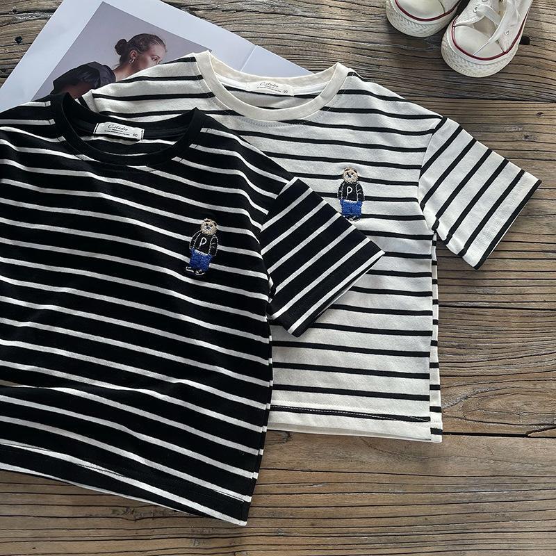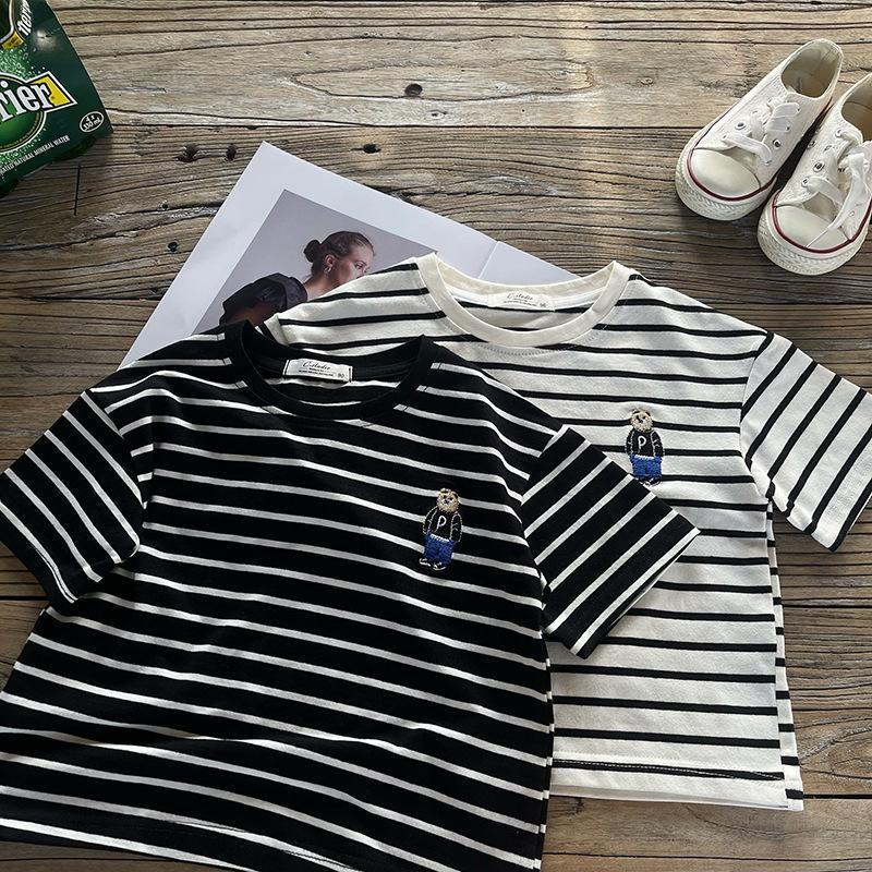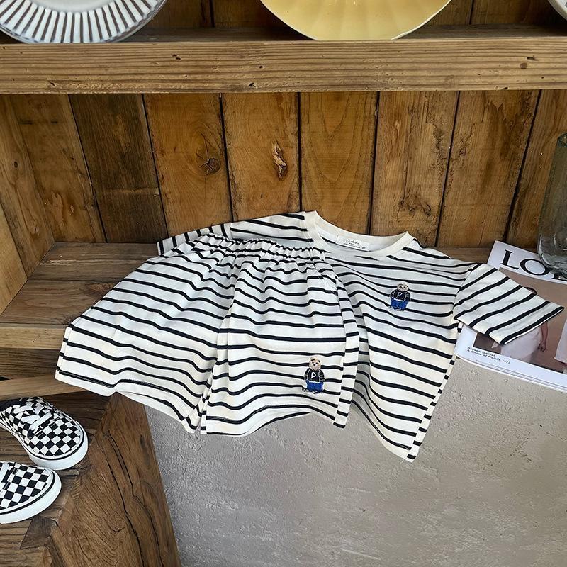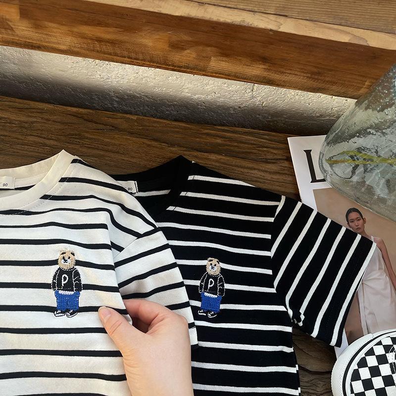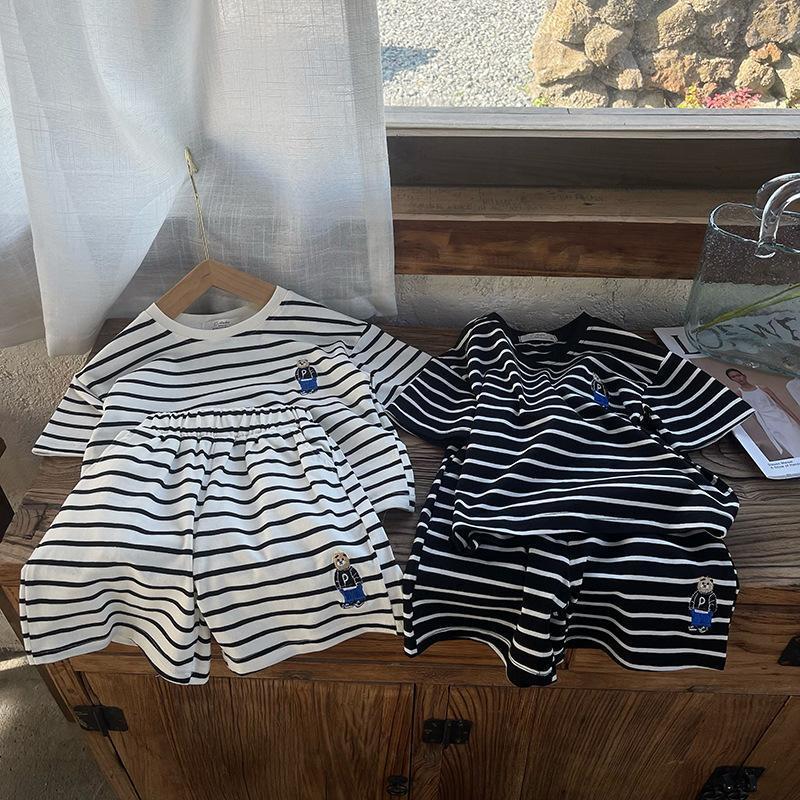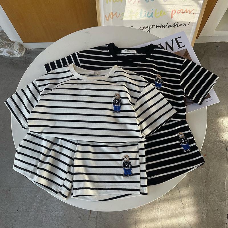 소년 줄무늬 티셔츠 반팔 세트 새로운 어린이 반바지 최고 옷 곰 자수 아기 T 여름 투피스 세트스토어 가기