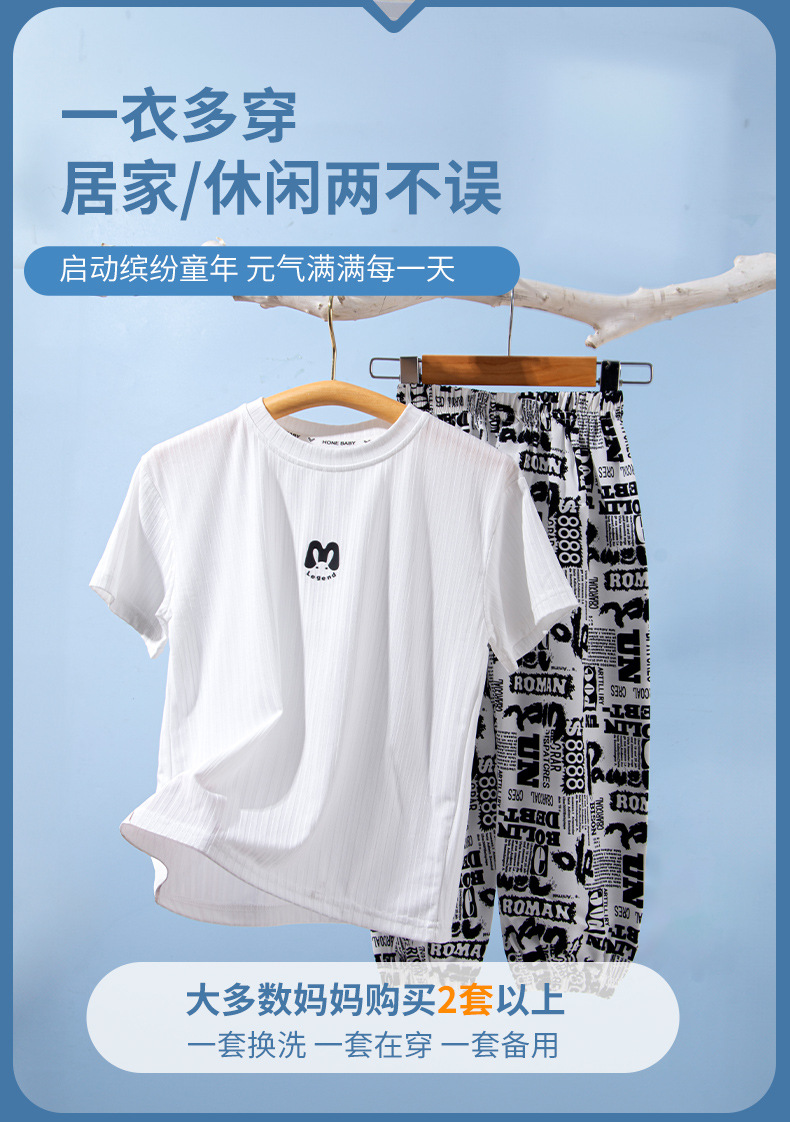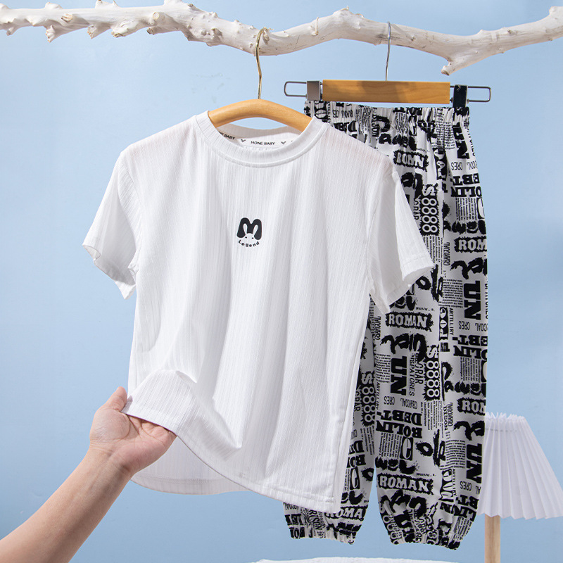 어린이 티셔츠 반팔 세트 여름 얇은 아이스 실크 반팔 자른 안티 모기 바지 투피스 세트 소년 소녀 티셔츠 세트스토어 가기