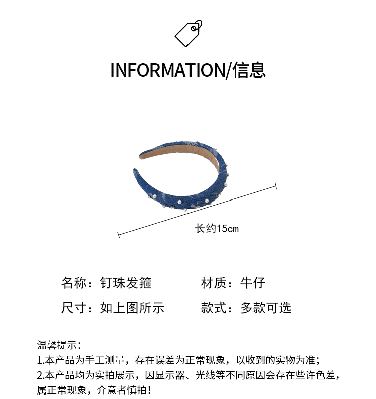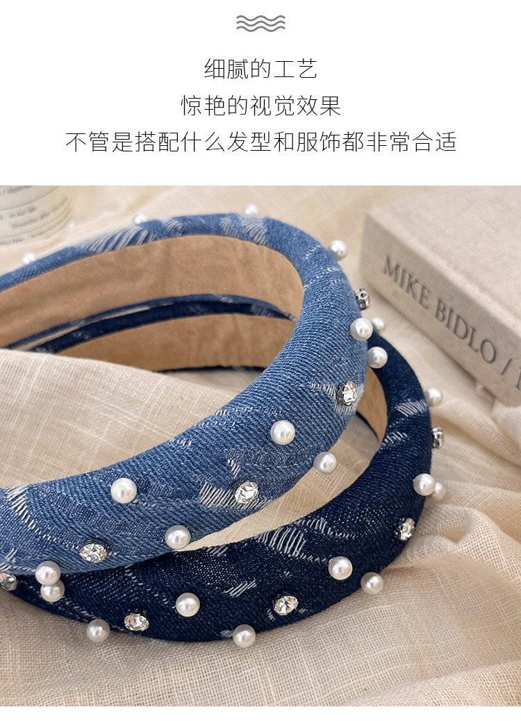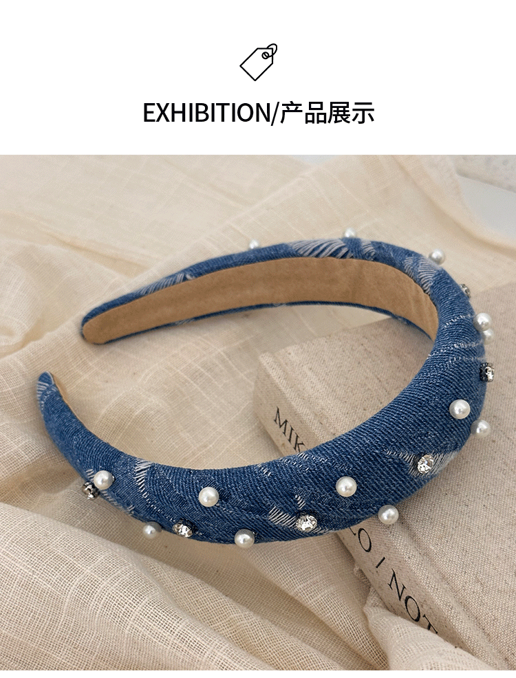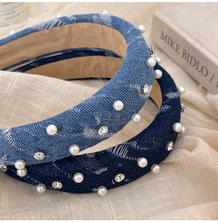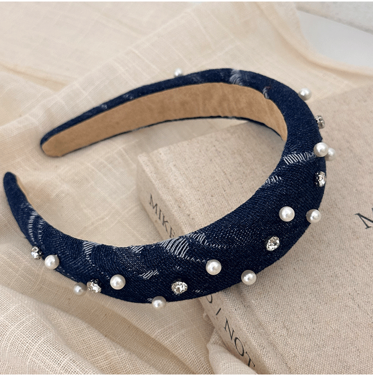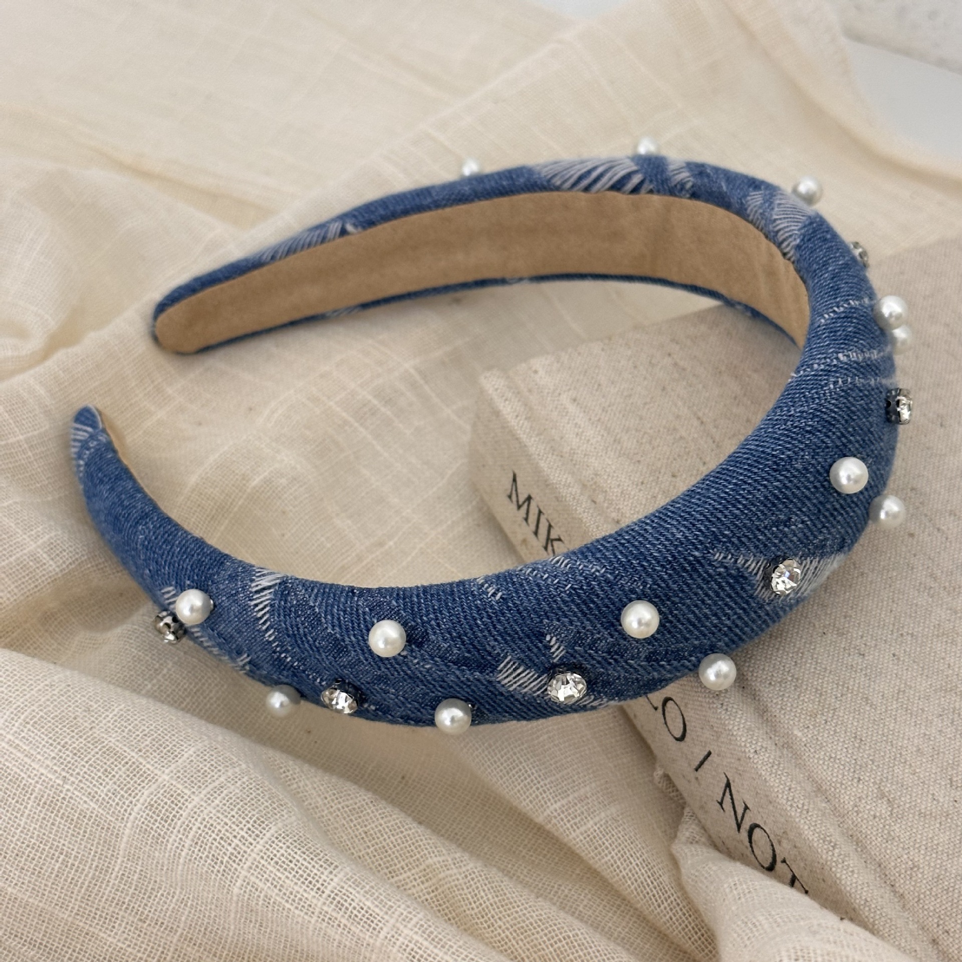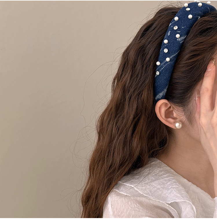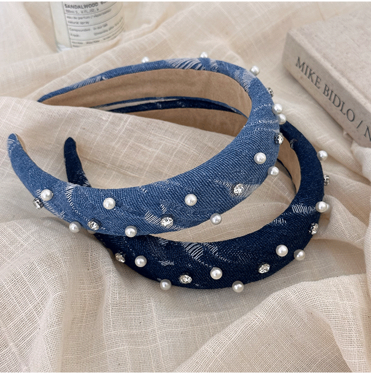 한국 스타일 간단한 구슬 데님 헤어 밴드 워시 페이스와 아웃 캐주얼 올 매치 헤어 액세서리 2024 여성을위한 하이 크랜얼 탑 헤어 밴드스토어 가기