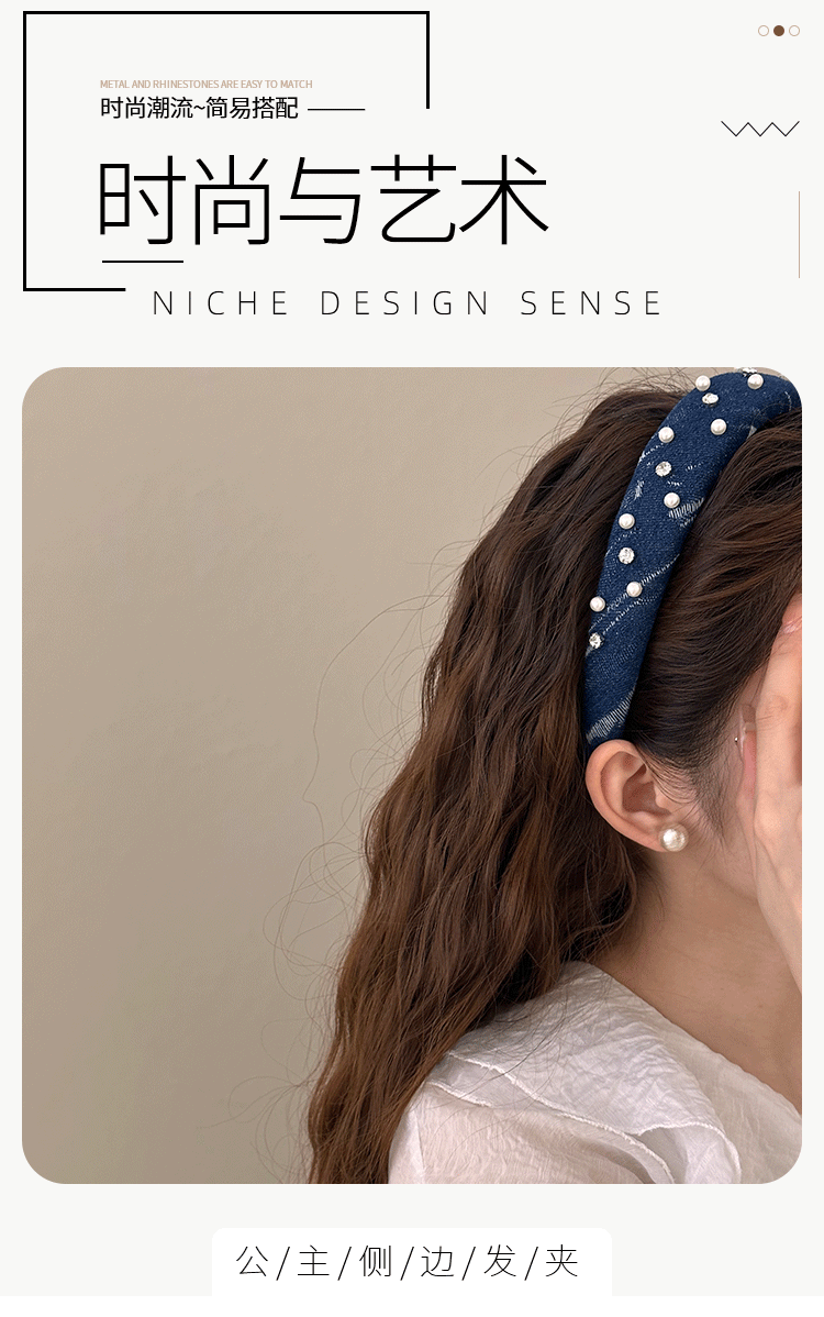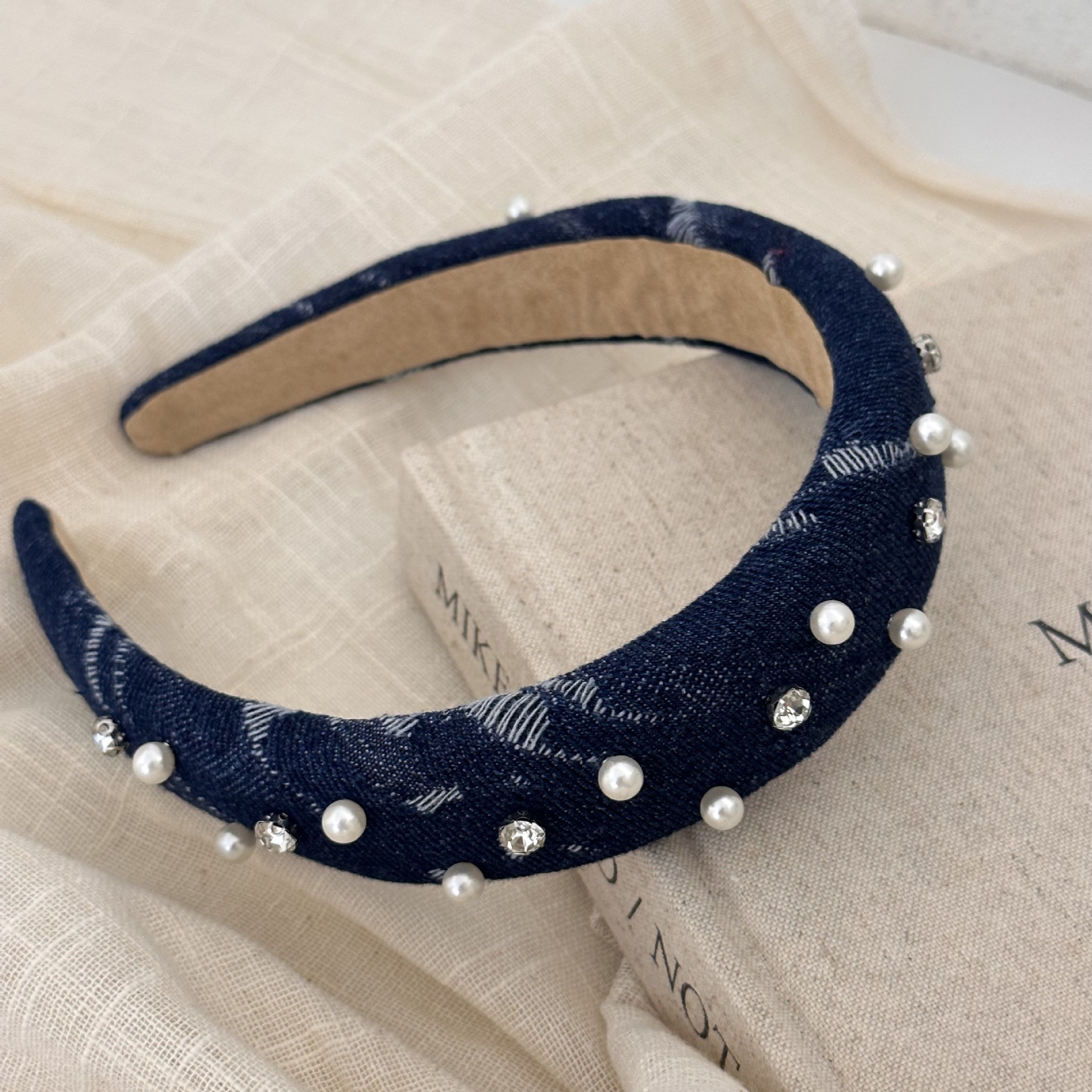 한국 스타일 간단한 구슬 데님 헤어 밴드 워시 페이스와 아웃 캐주얼 올 매치 헤어 액세서리 2024 여성을위한 하이 크랜얼 탑 헤어 밴드