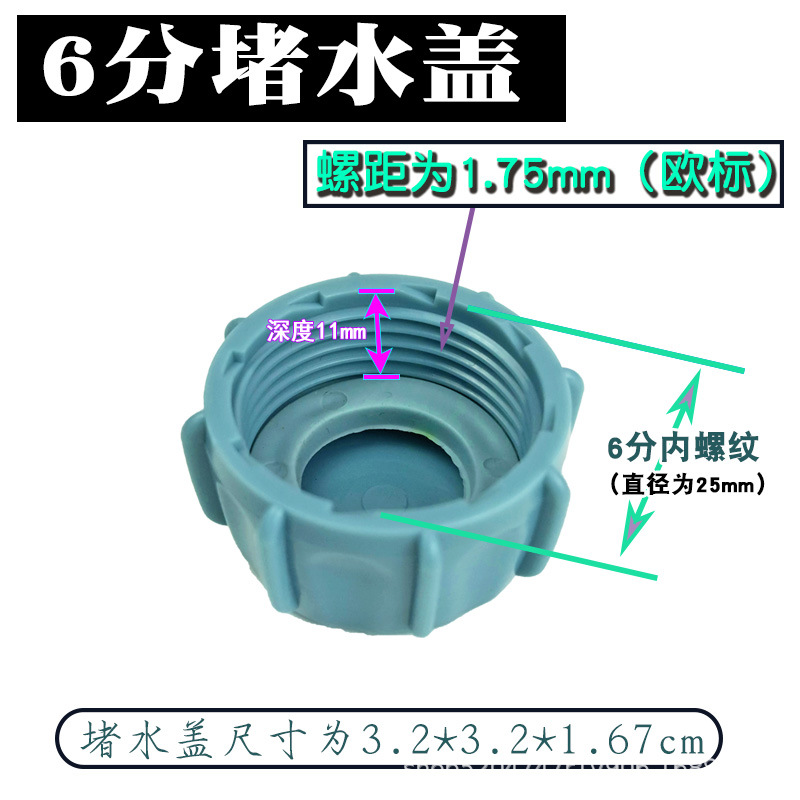 6分堵水盖,采用ABS材质,内含6分垫圈,防止漏水,内螺纹的公称直径为25mm,螺距1.75mm,净重5g,堵水盖尺寸为3*3*3.65cm。1.jpg
