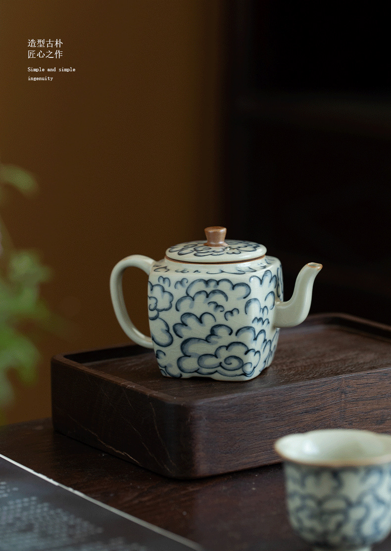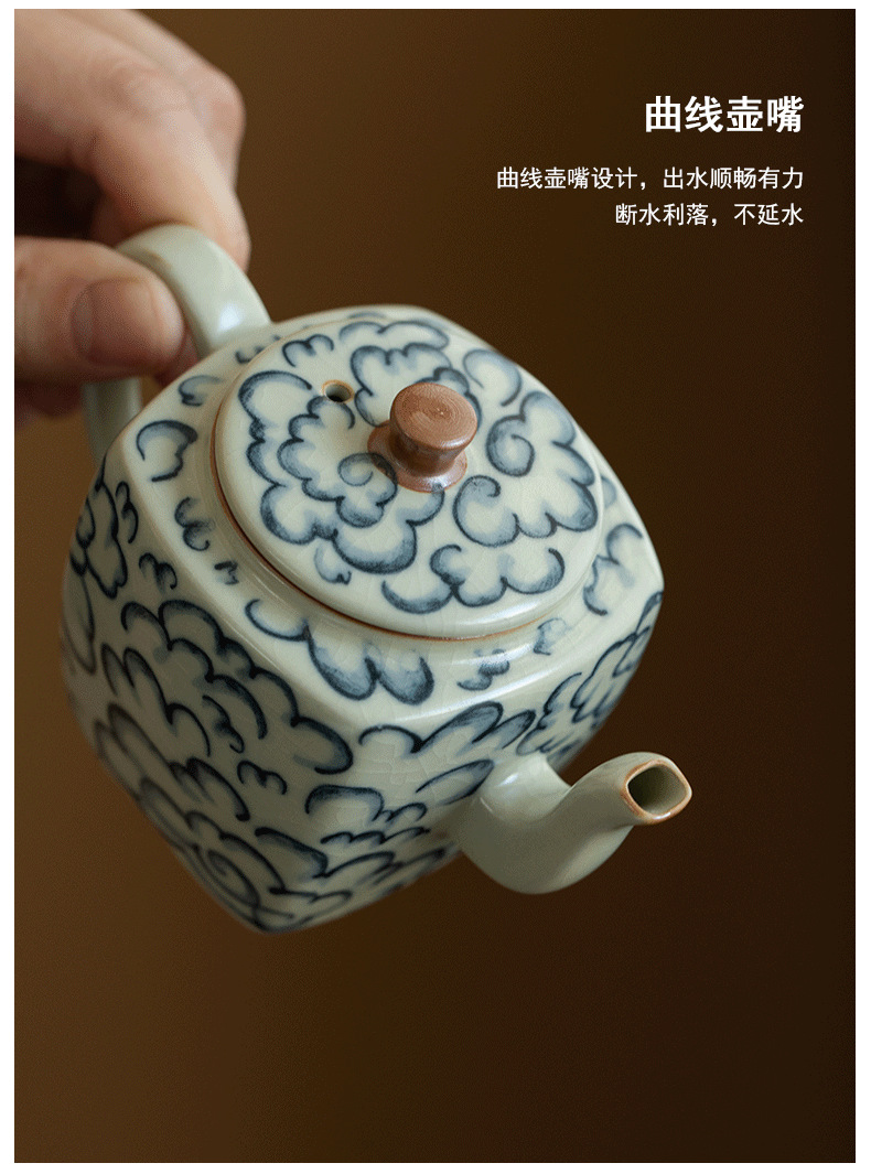 Ru Kiln 주전자 단일 작은 세라믹 쿵푸 차 세트 파란색과 흰색 도자기 오픈 조각은 Sifang 냄비 가정용 작은 차 메이커를 올릴 수 있습니다