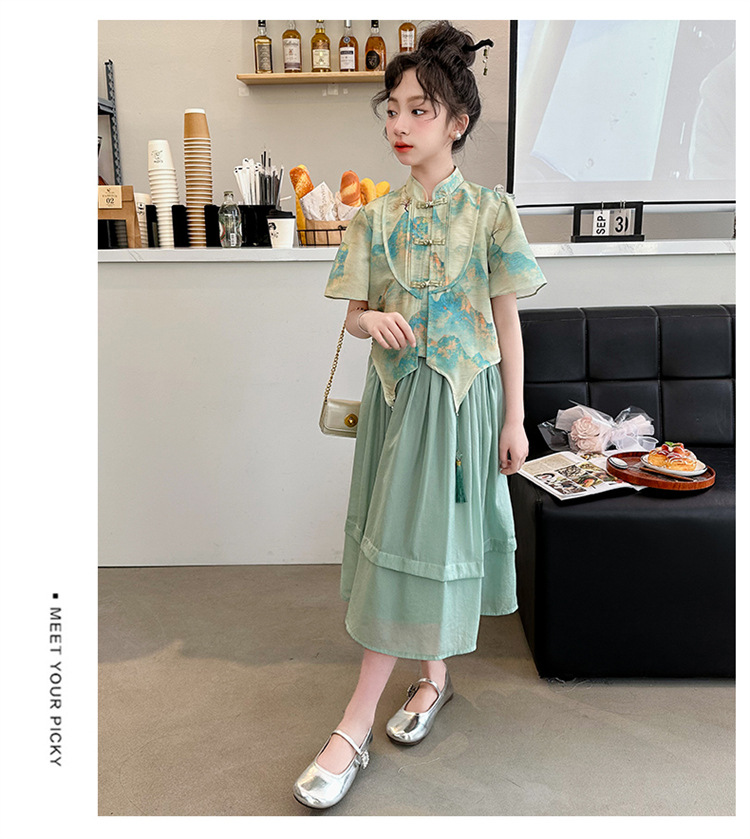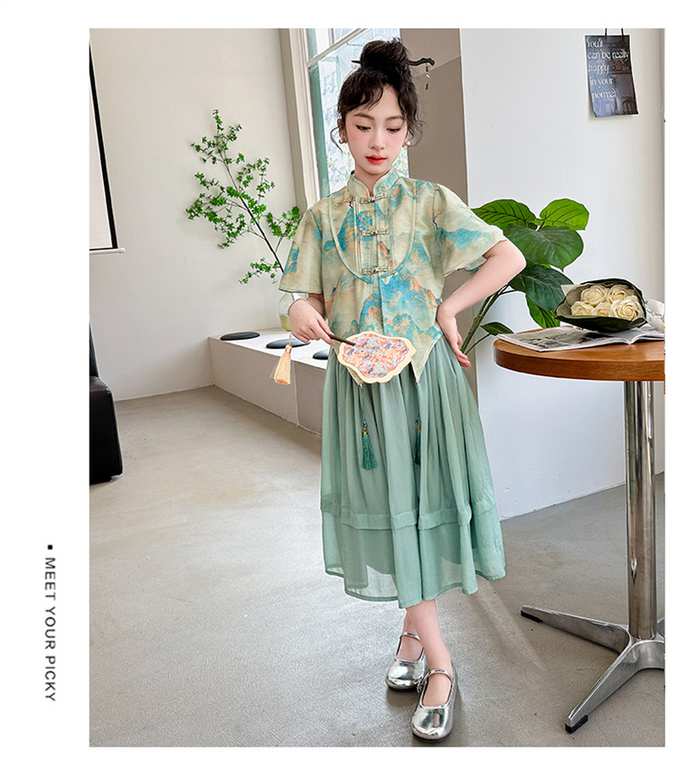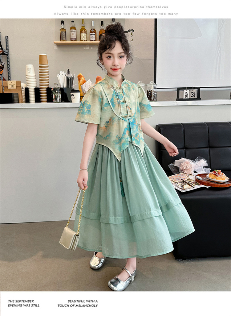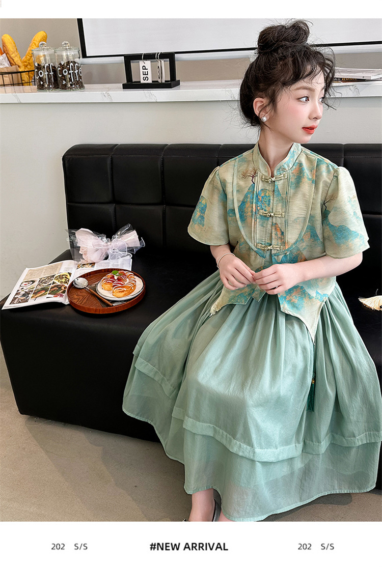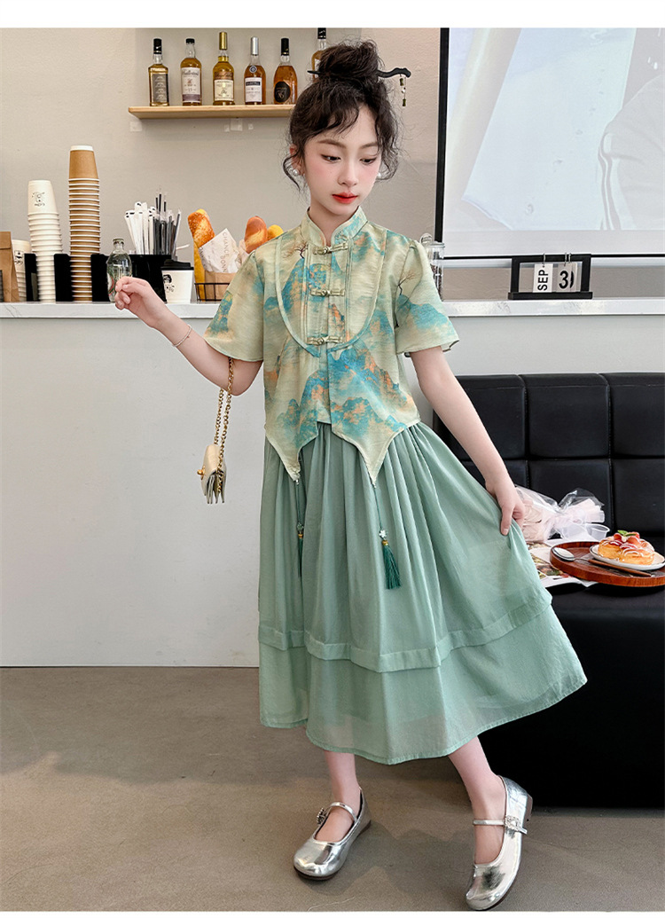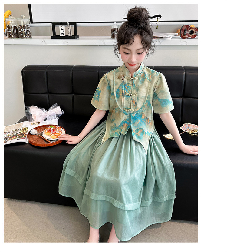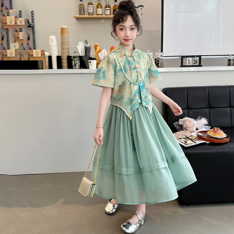 소녀의 큰 소년 한푸 세트 여름 2024 새로운 중국 스타일 개선 된 소녀의 레트로 탕 세트 새로운 중국 2 피스 세트