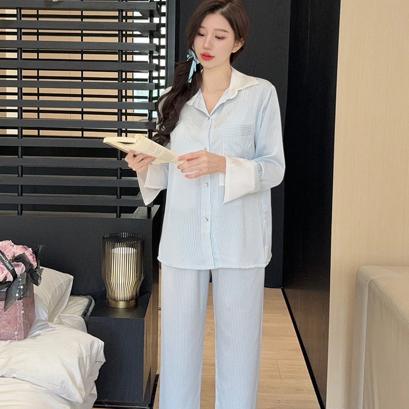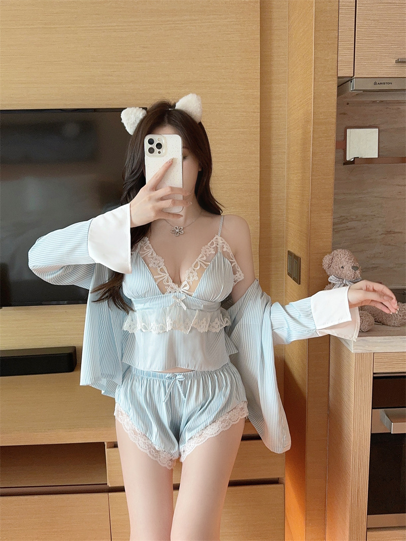 국경 간 순수한 욕망 줄무늬 아이스 실크 파자마 여성 세트 섹시한 서스펜더 반바지 가슴 패드가있는 4 피스 세트
