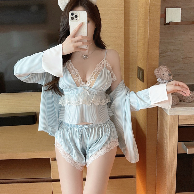 국경 간 순수한 욕망 줄무늬 아이스 실크 파자마 여성 세트 섹시한 서스펜더 반바지 가슴 패드가있는 4 피스 세트스토어 가기
