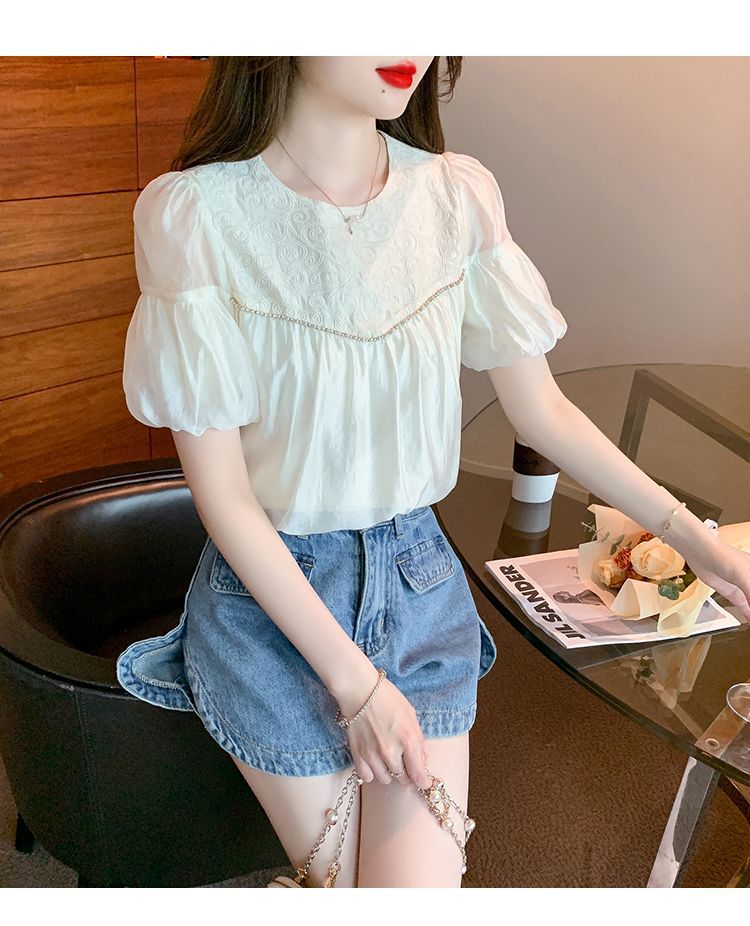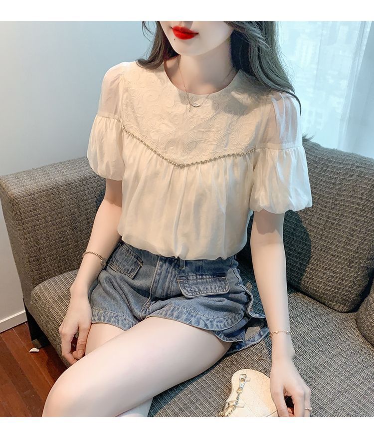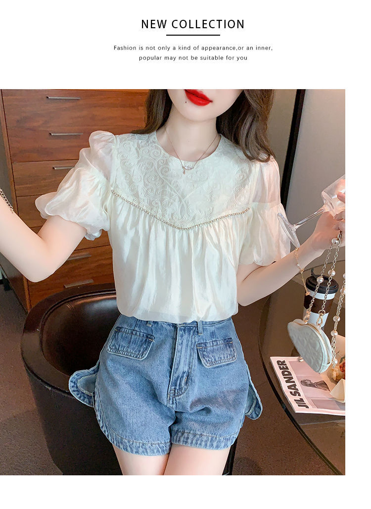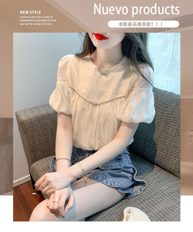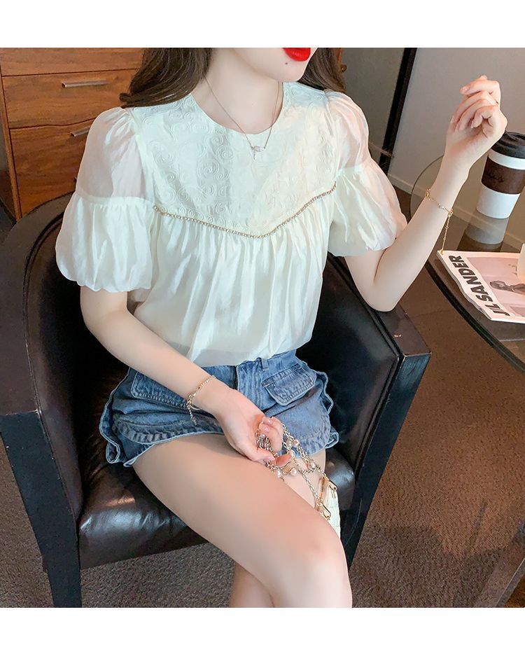 2024 여름 새로운 빈티지 버블 슬리브 쉬폰 셔츠 여성 디자인 센스 니쉬 외국식 시대 감소 셔츠 탑스토어 가기
