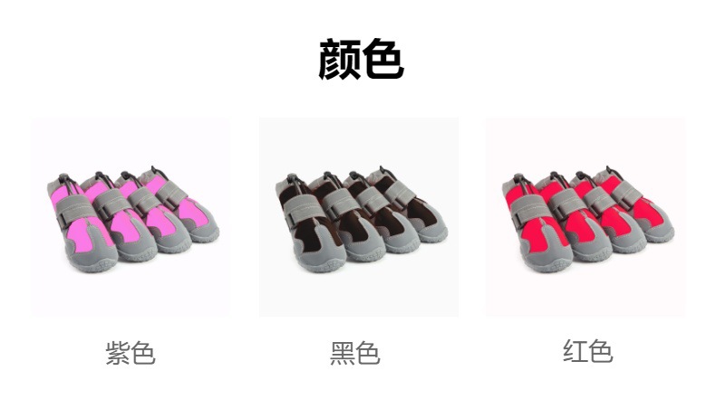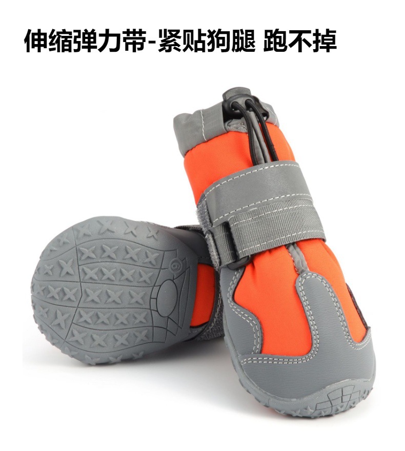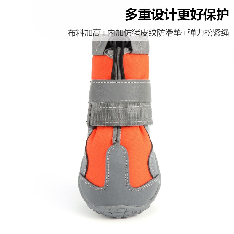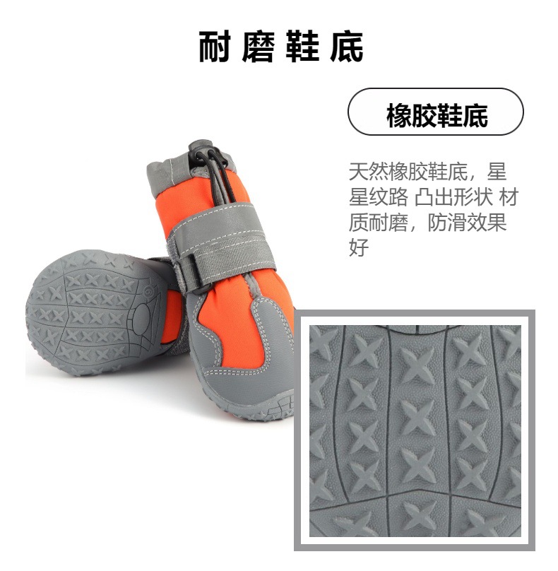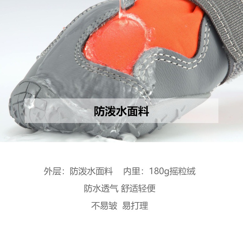 【本品特点】:本款鞋采用四面弹防泼水面料,透气,回弹效果好,外加反光条设计,狗狗脚穿柔软,舒服,具有比水分子密度小、比水蒸气密度大的功能,防闷、防臭、防泼水防雪的效果,橡胶耐磨防滑鞋底,狗狗穿着可以在雪地、冰川、丛林安全行走,是一双适合户外行动的宠物鞋!