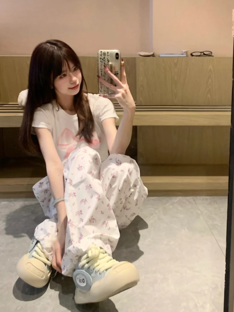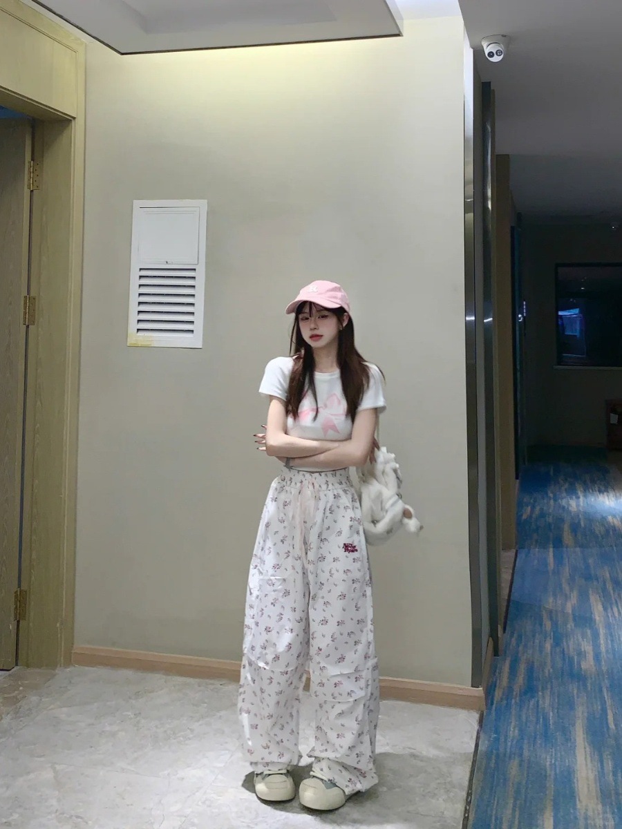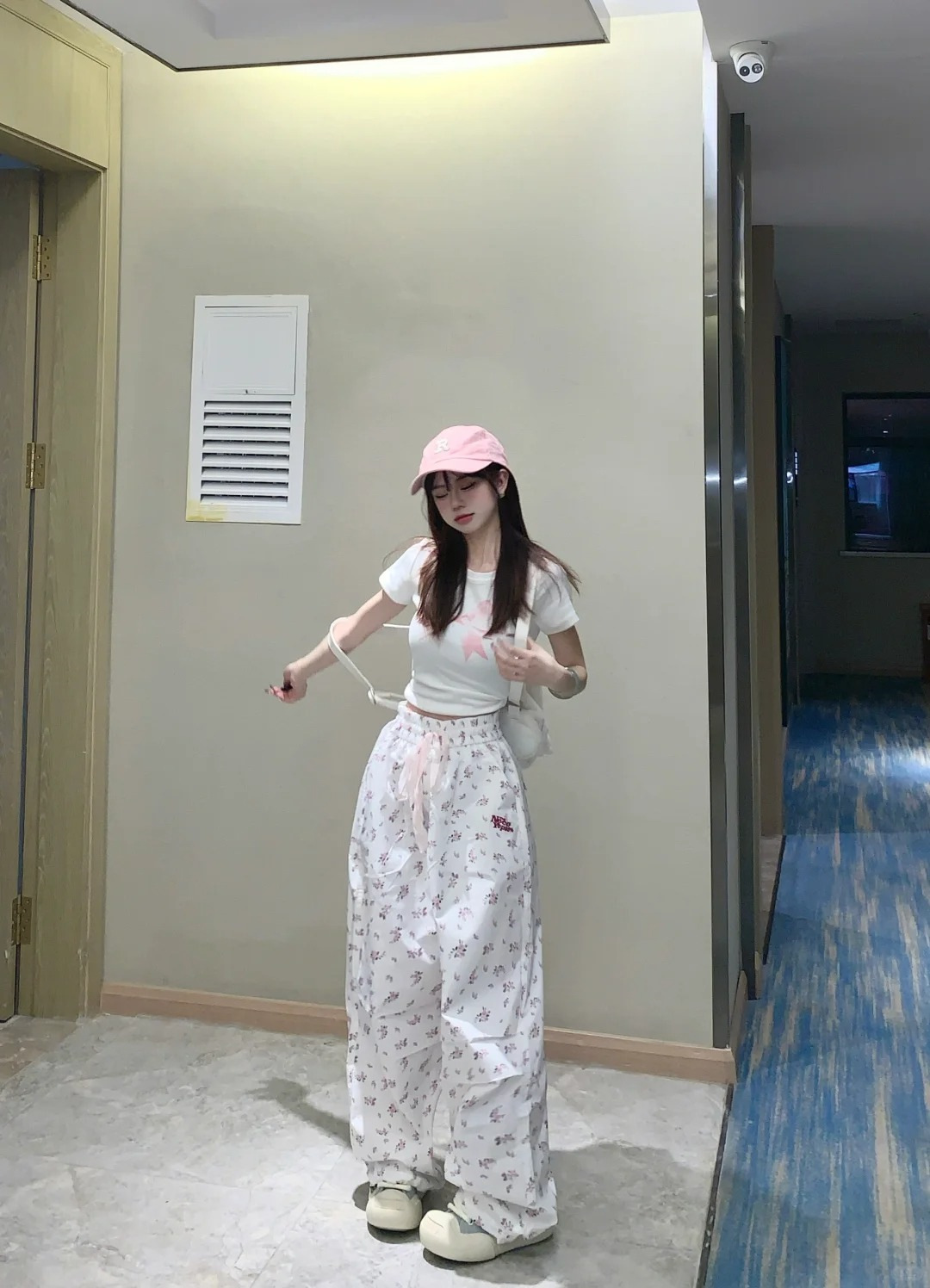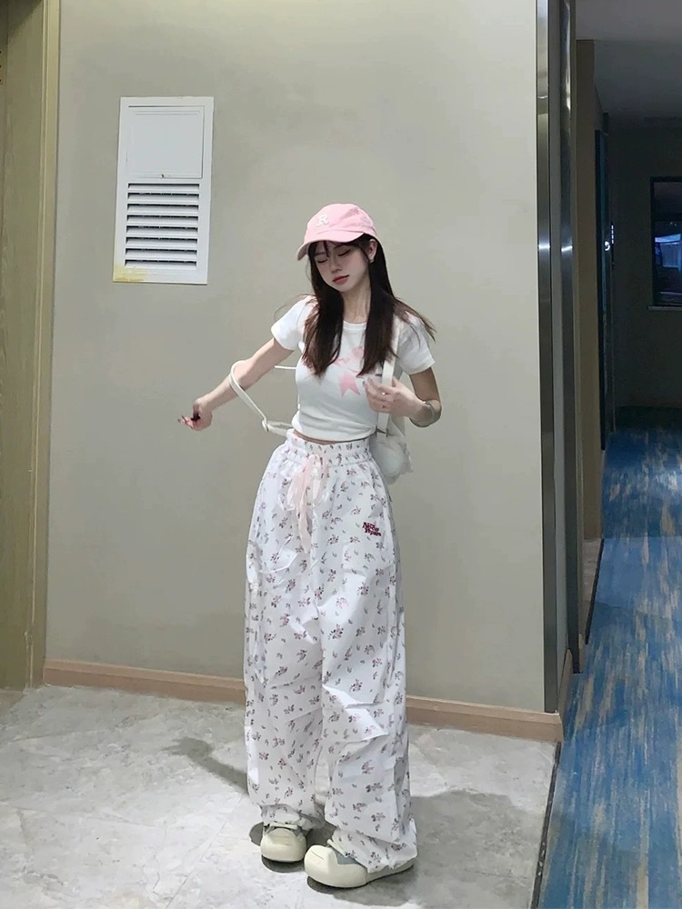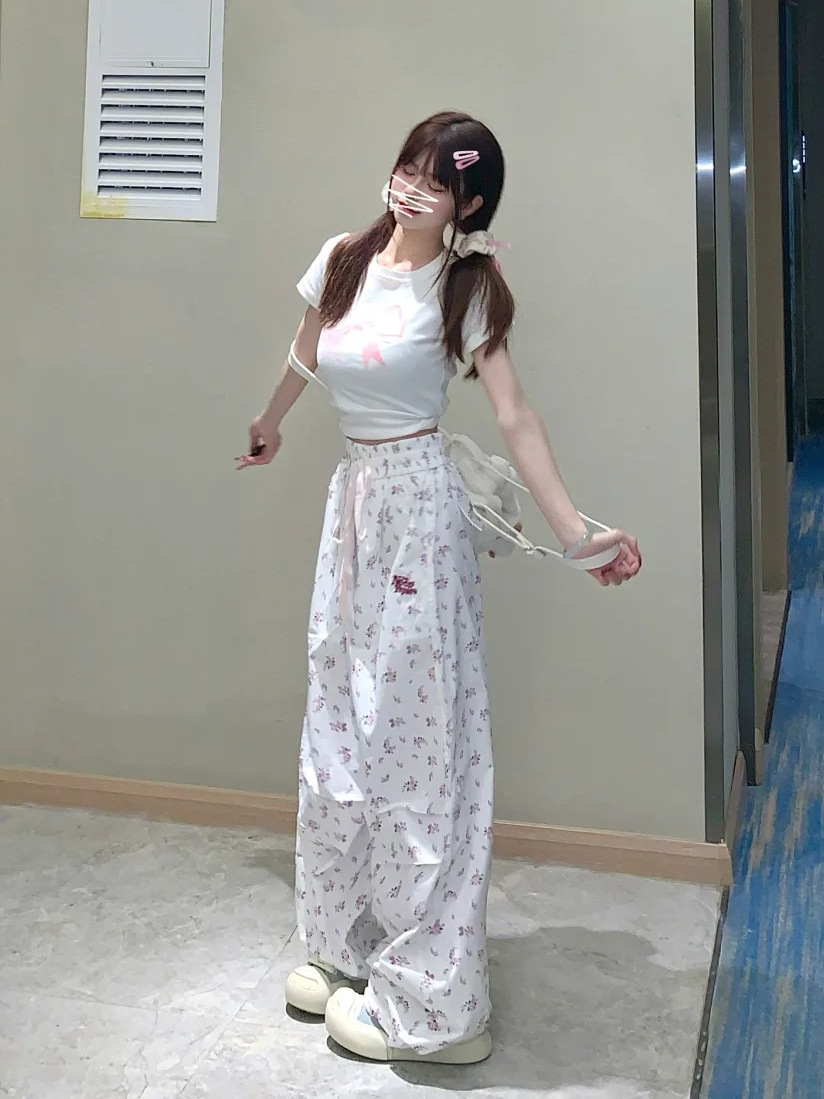 아메리칸 스타일 화이트 플로랄 높은 허리 넓은 다리 바지 여성용 여름 얇은 작은 느슨한 딥 긴 바지스토어 가기