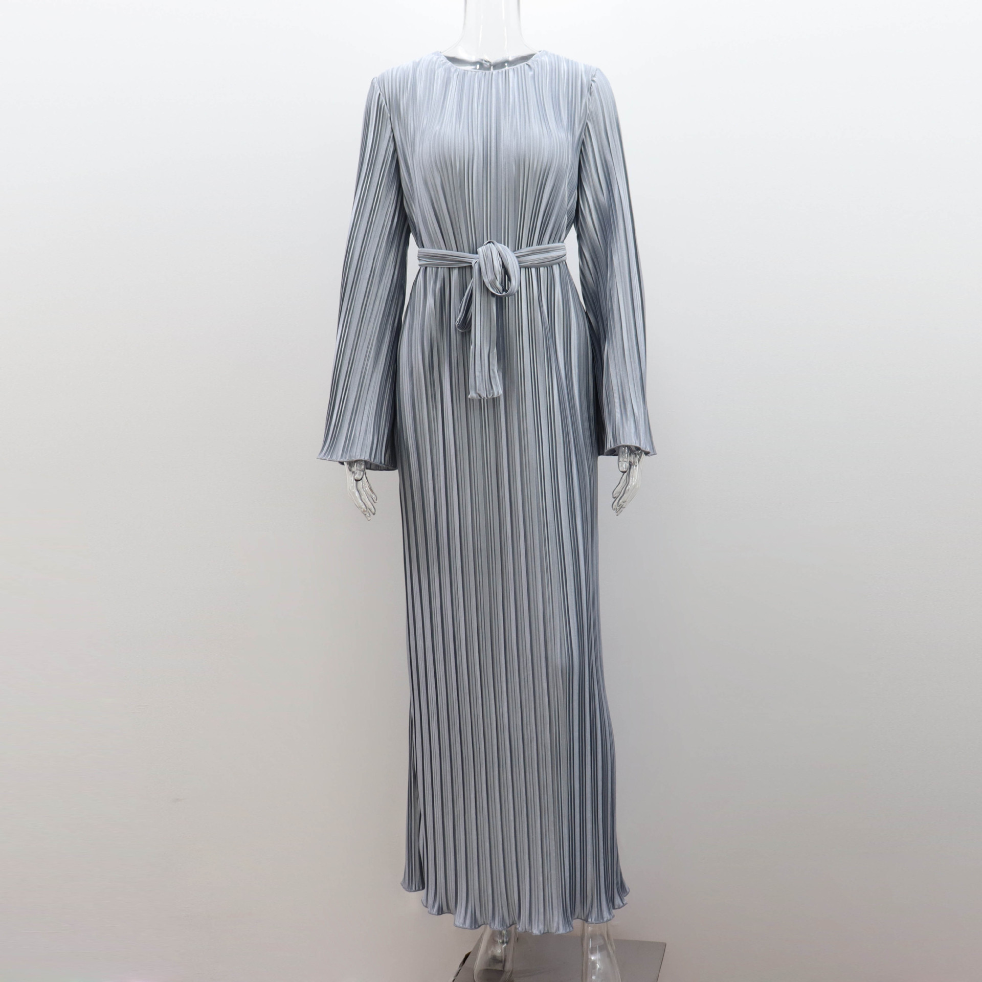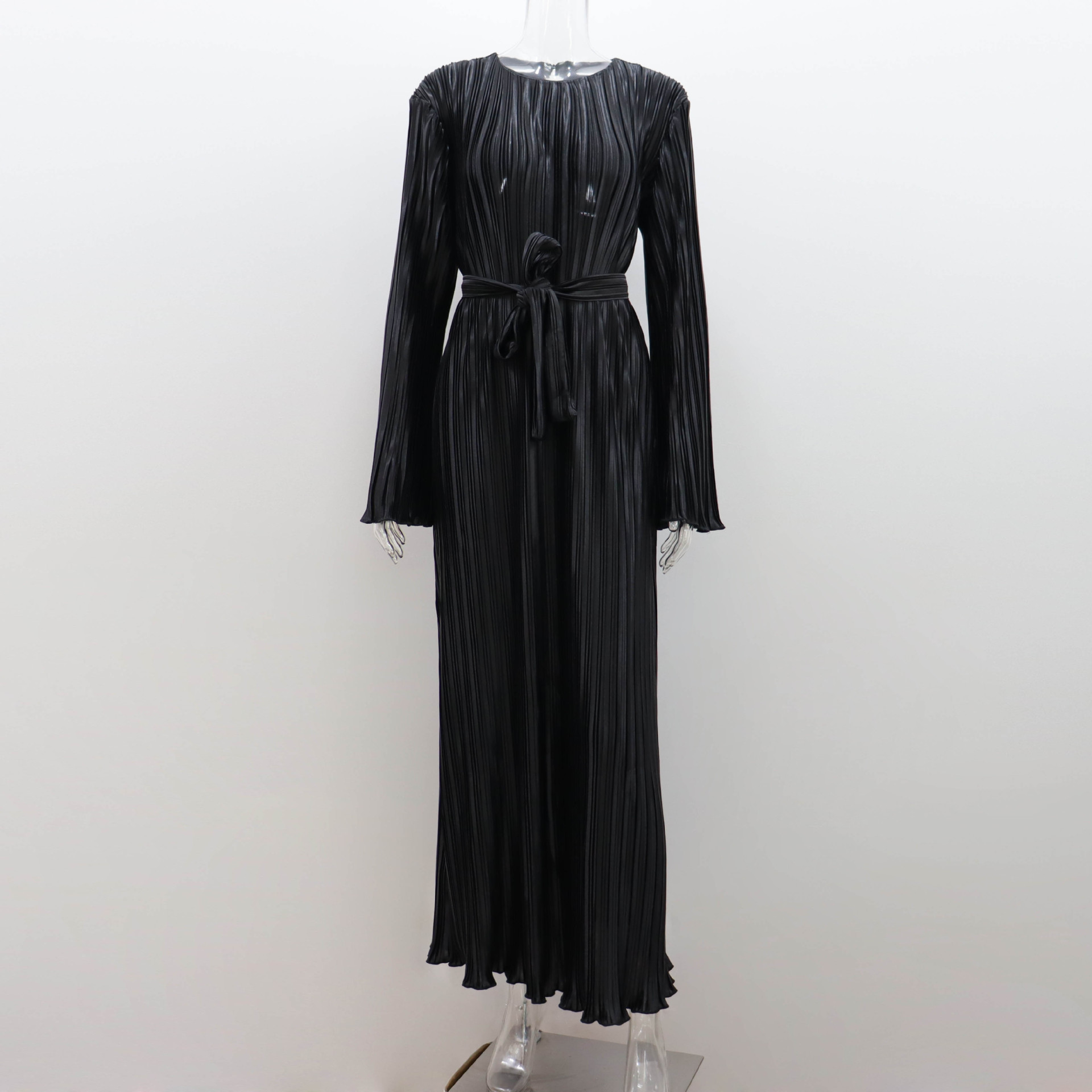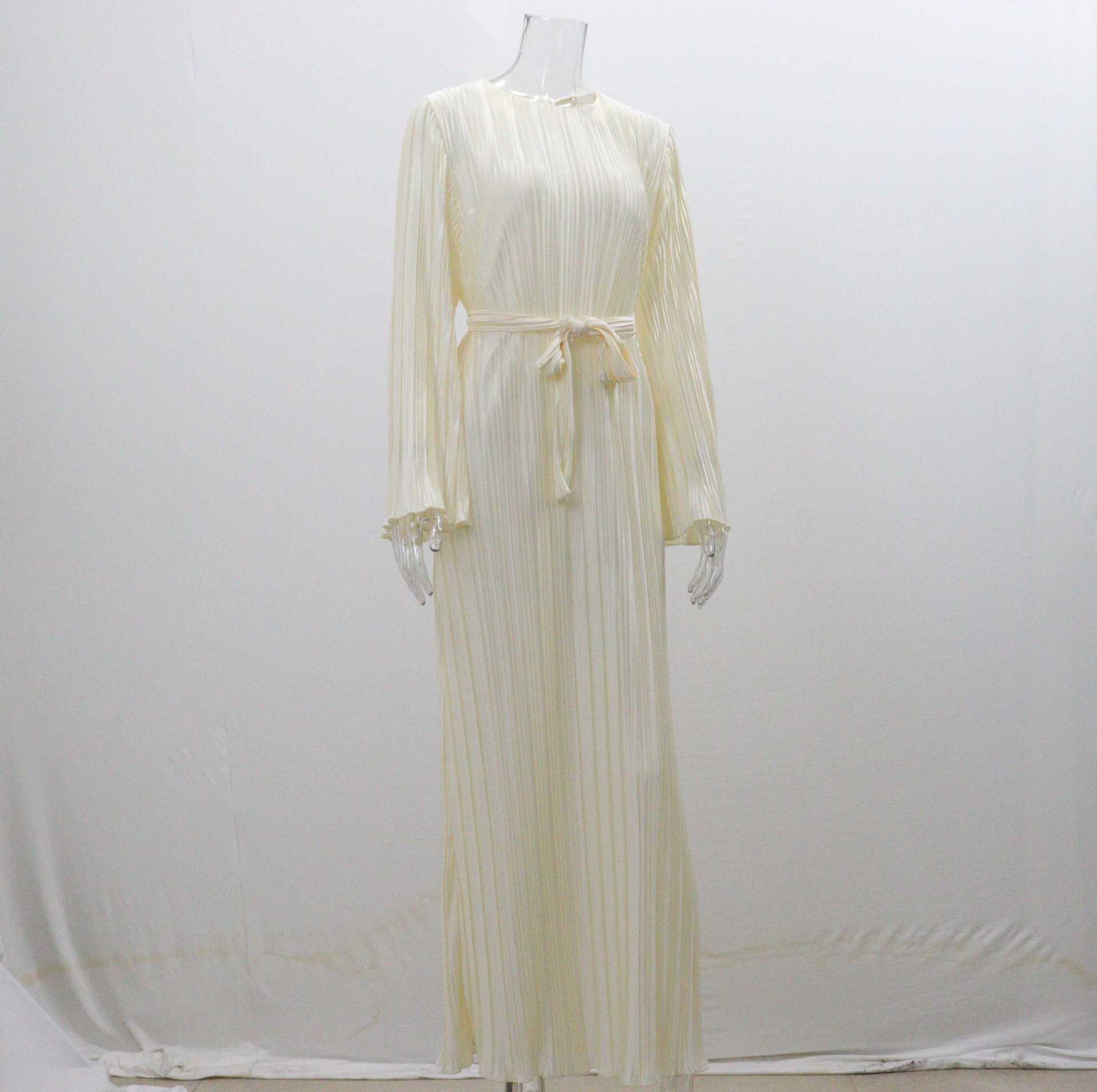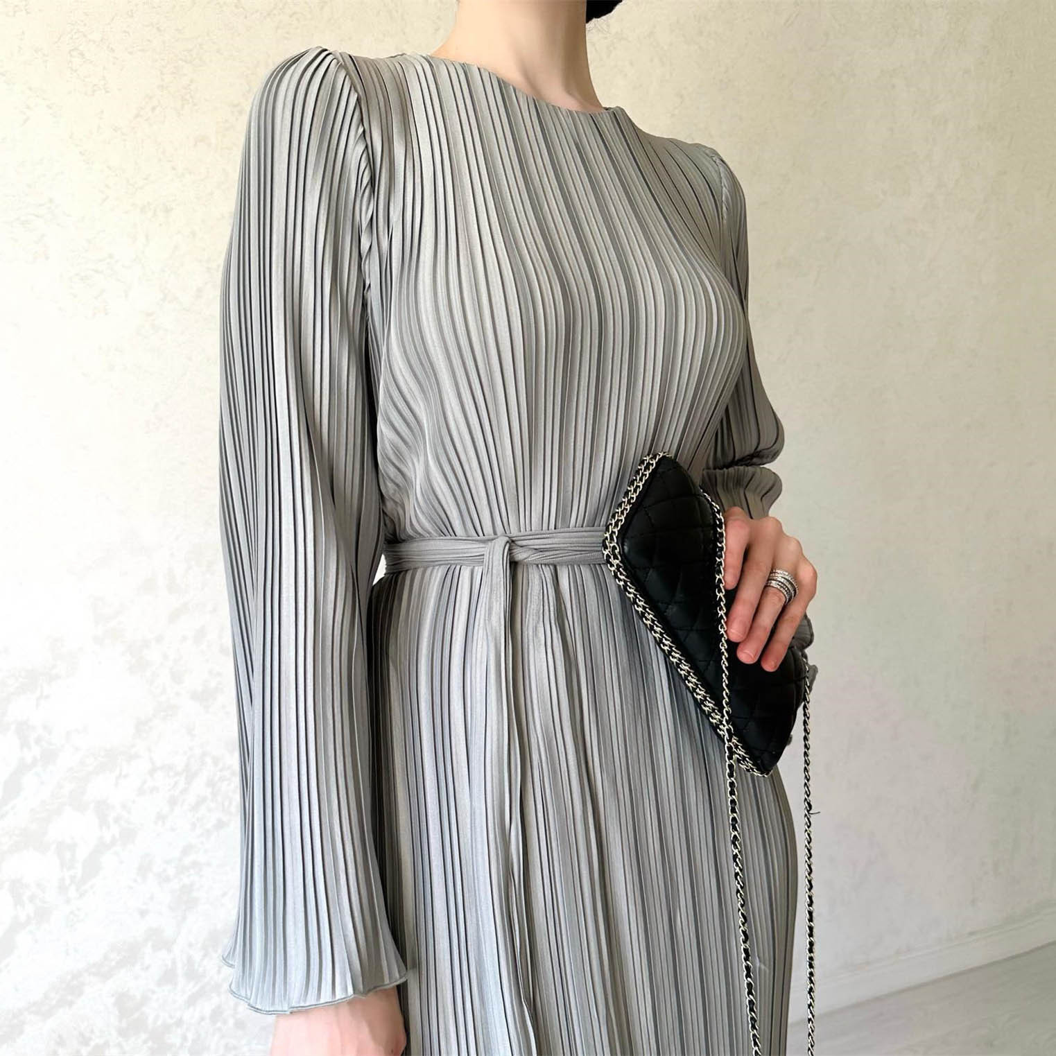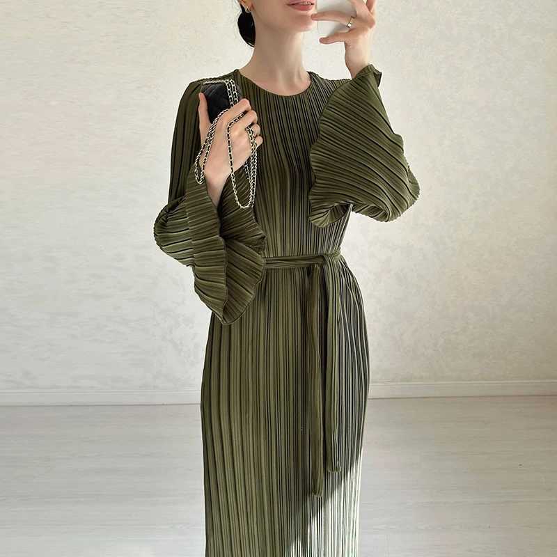 유럽과 미국 스타일 여성의 2024 봄과 가을 새로운 패션 원피스 여성의 캐주얼 단색 둥근 목 뿔 소매 주름 원피스