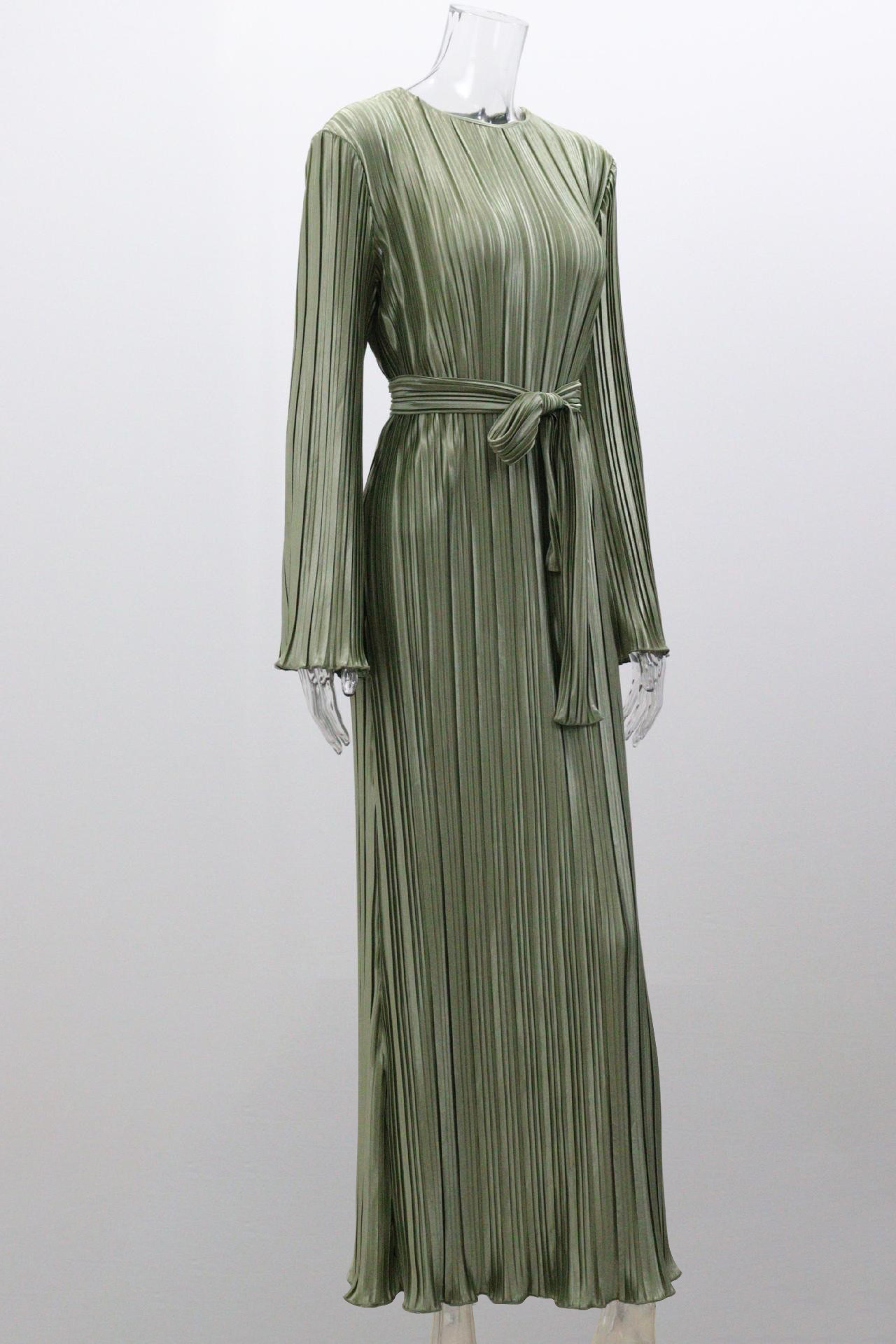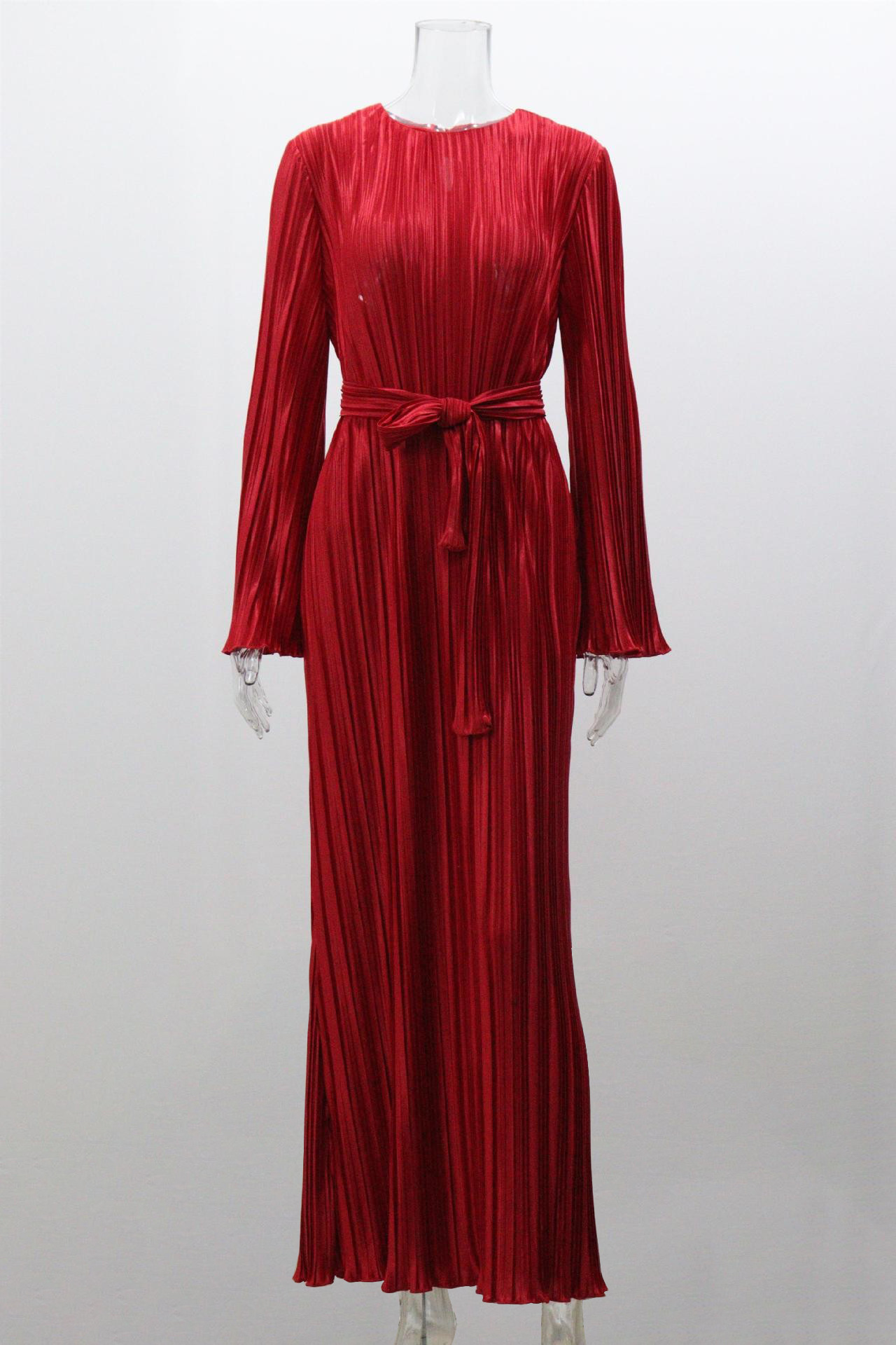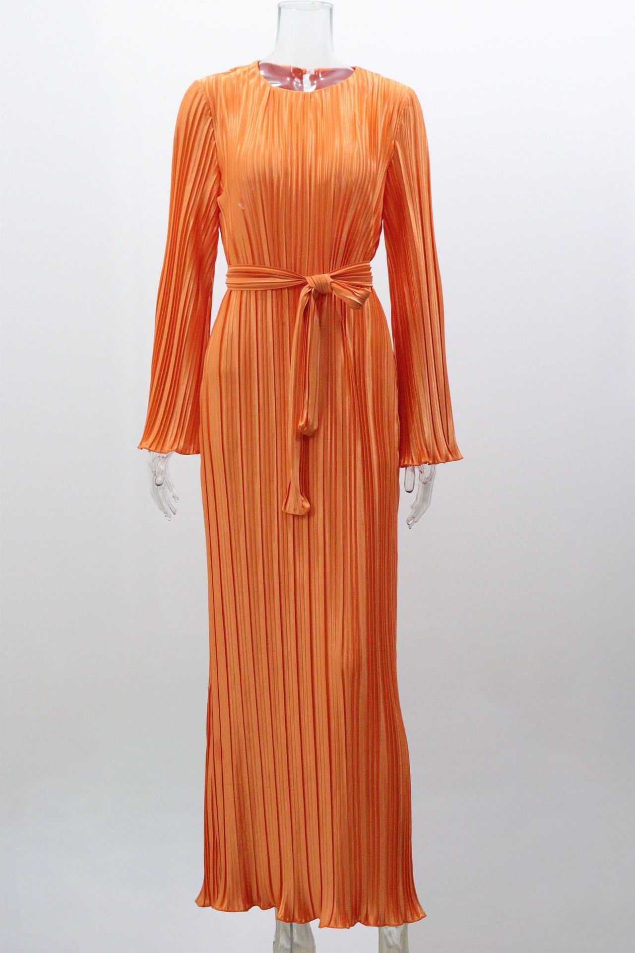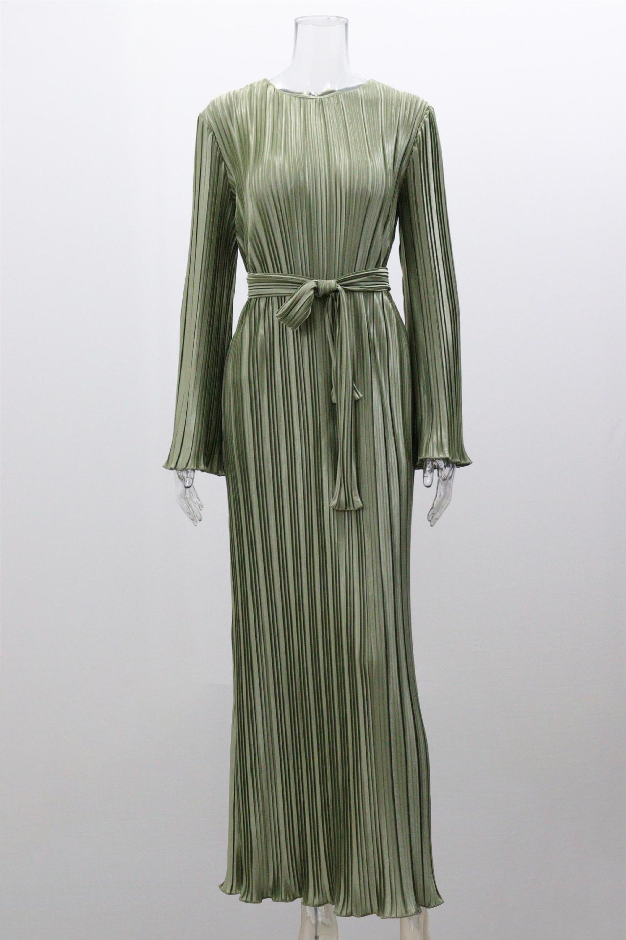 유럽과 미국 스타일 여성의 2024 봄과 가을 새로운 패션 원피스 여성의 캐주얼 단색 둥근 목 뿔 소매 주름 원피스