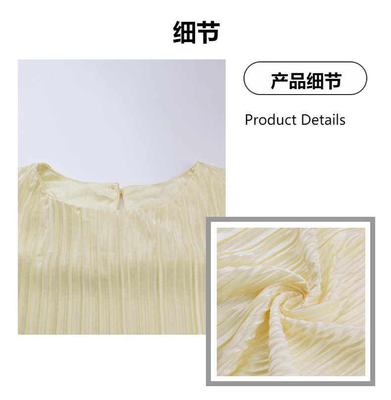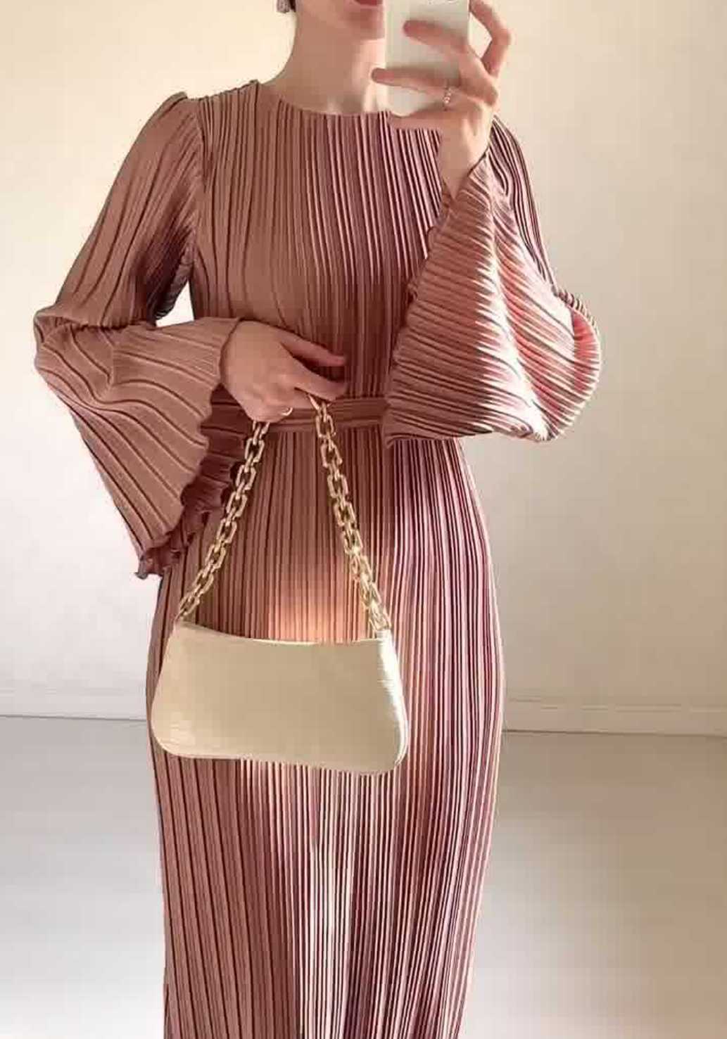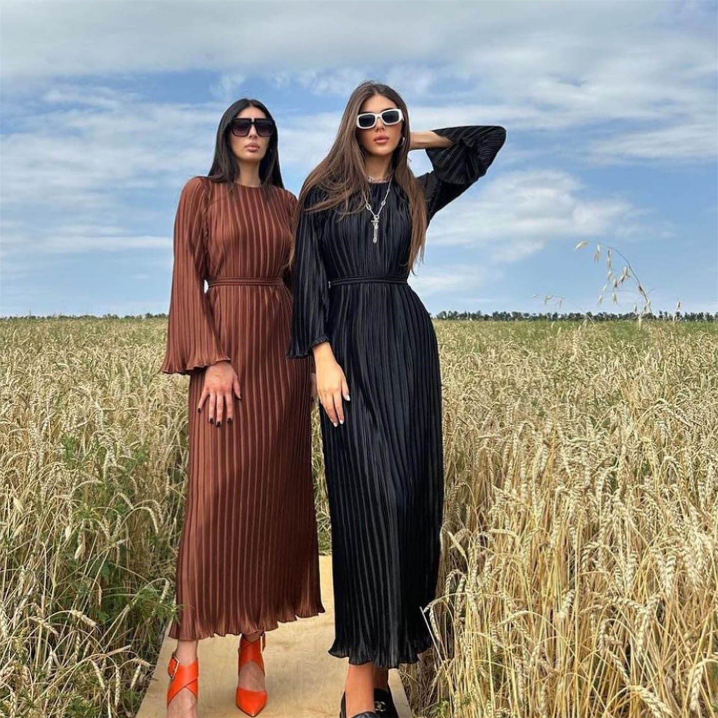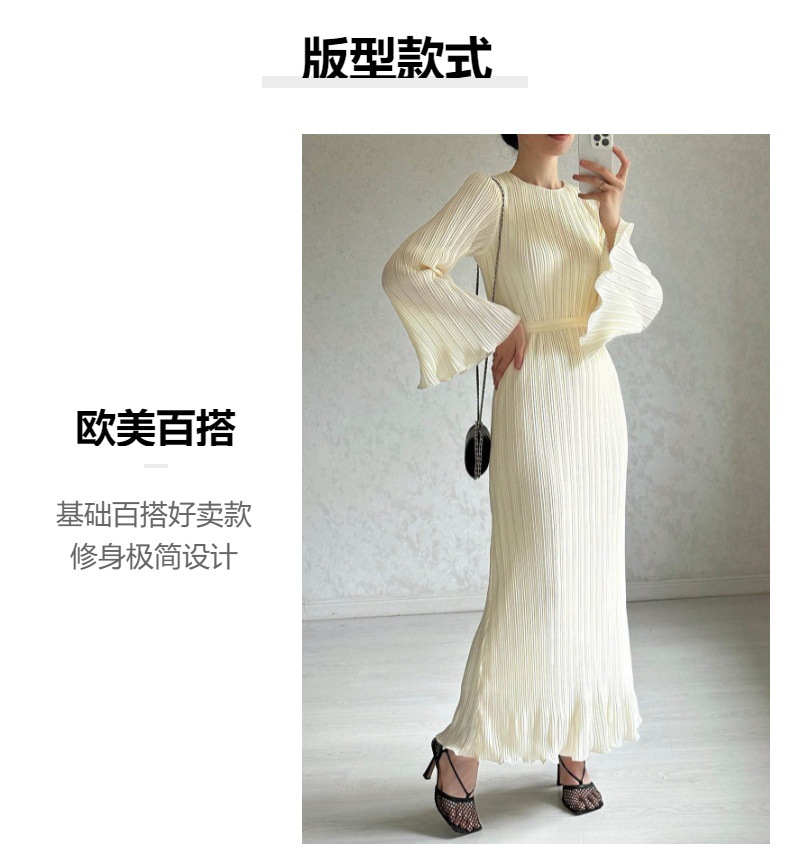 유럽과 미국 스타일 여성의 2024 봄과 가을 새로운 패션 원피스 여성의 캐주얼 단색 둥근 목 뿔 소매 주름 원피스스토어 가기