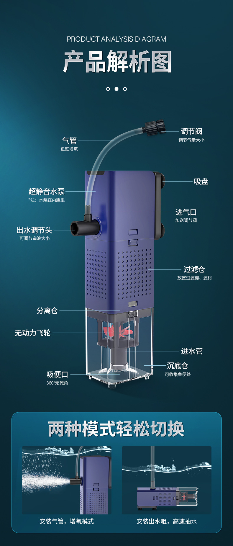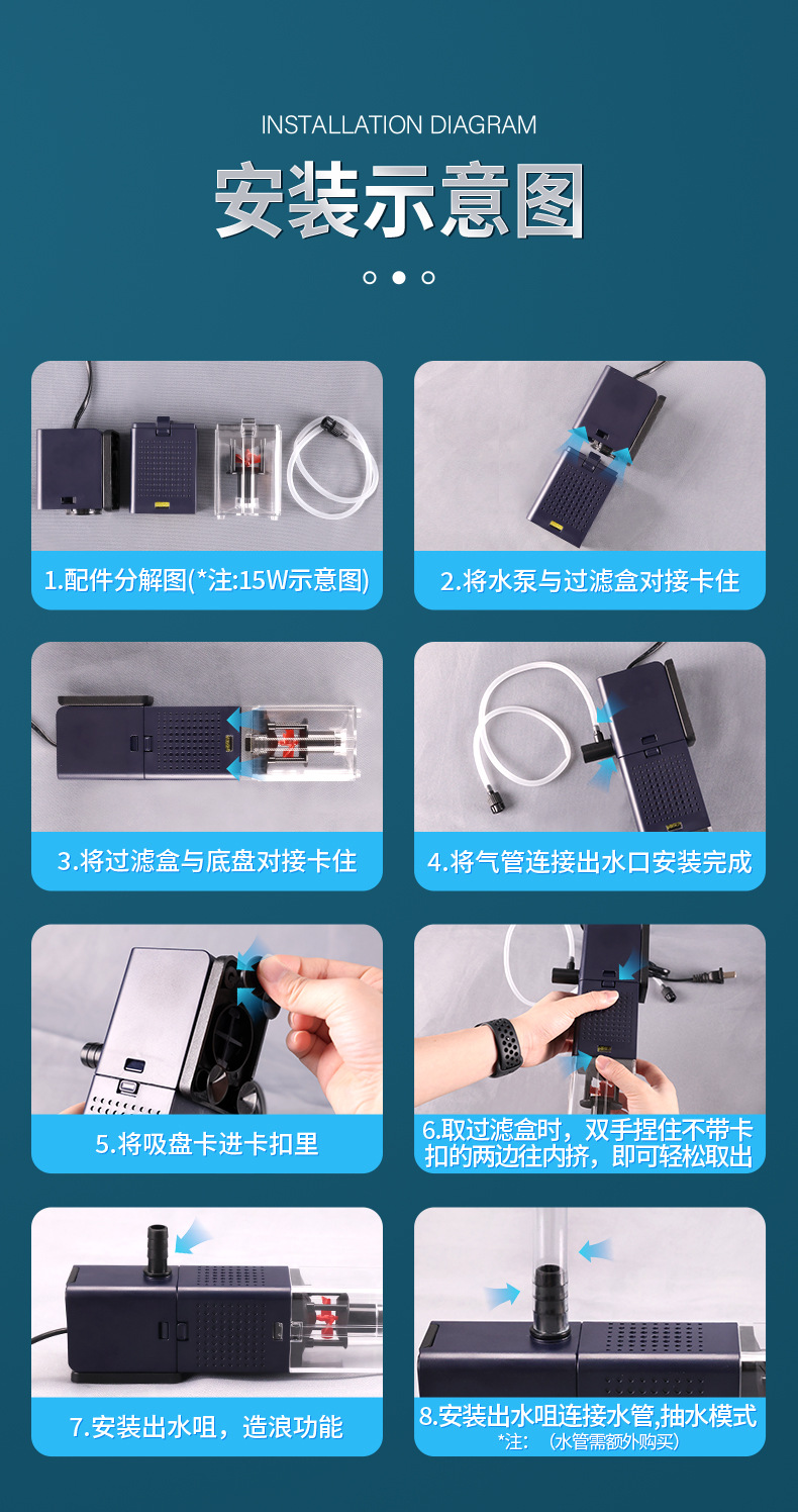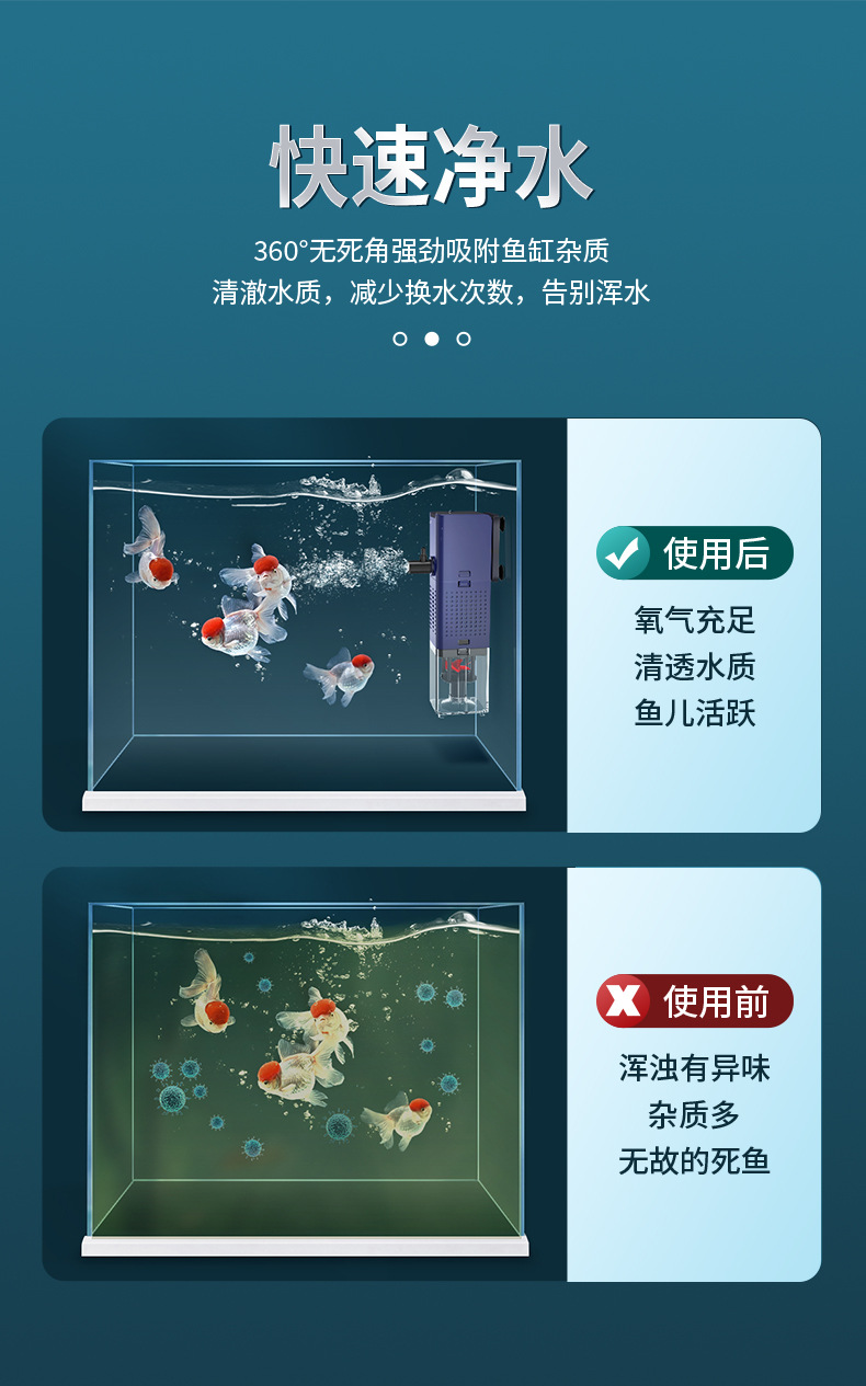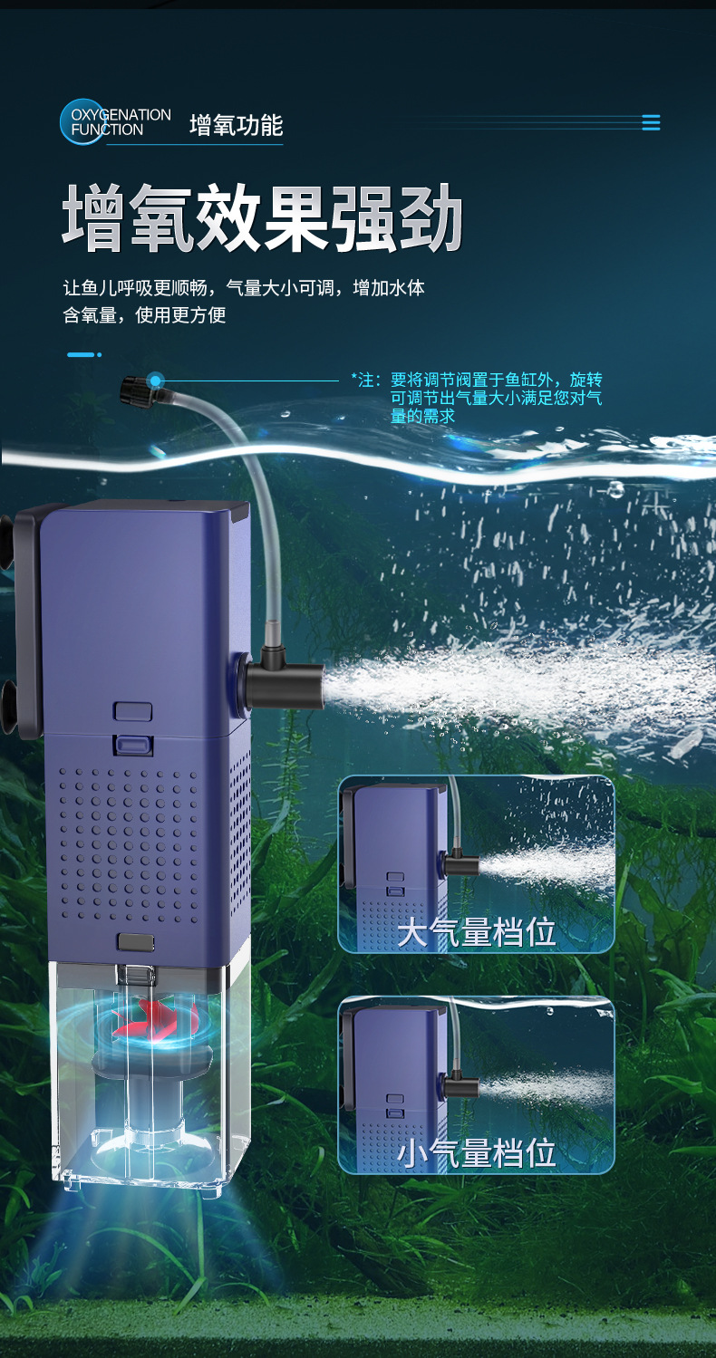 鱼缸有小鱼苗,请将鱼苗隔离开或者过滤器紧贴缸底再使用,避免鱼苗吸入过滤器