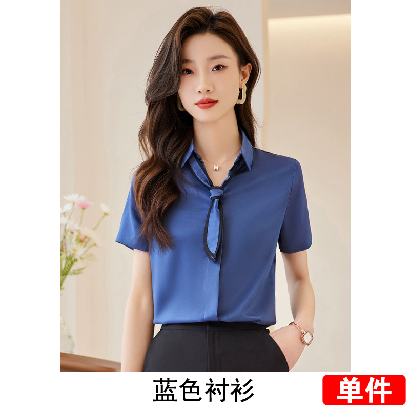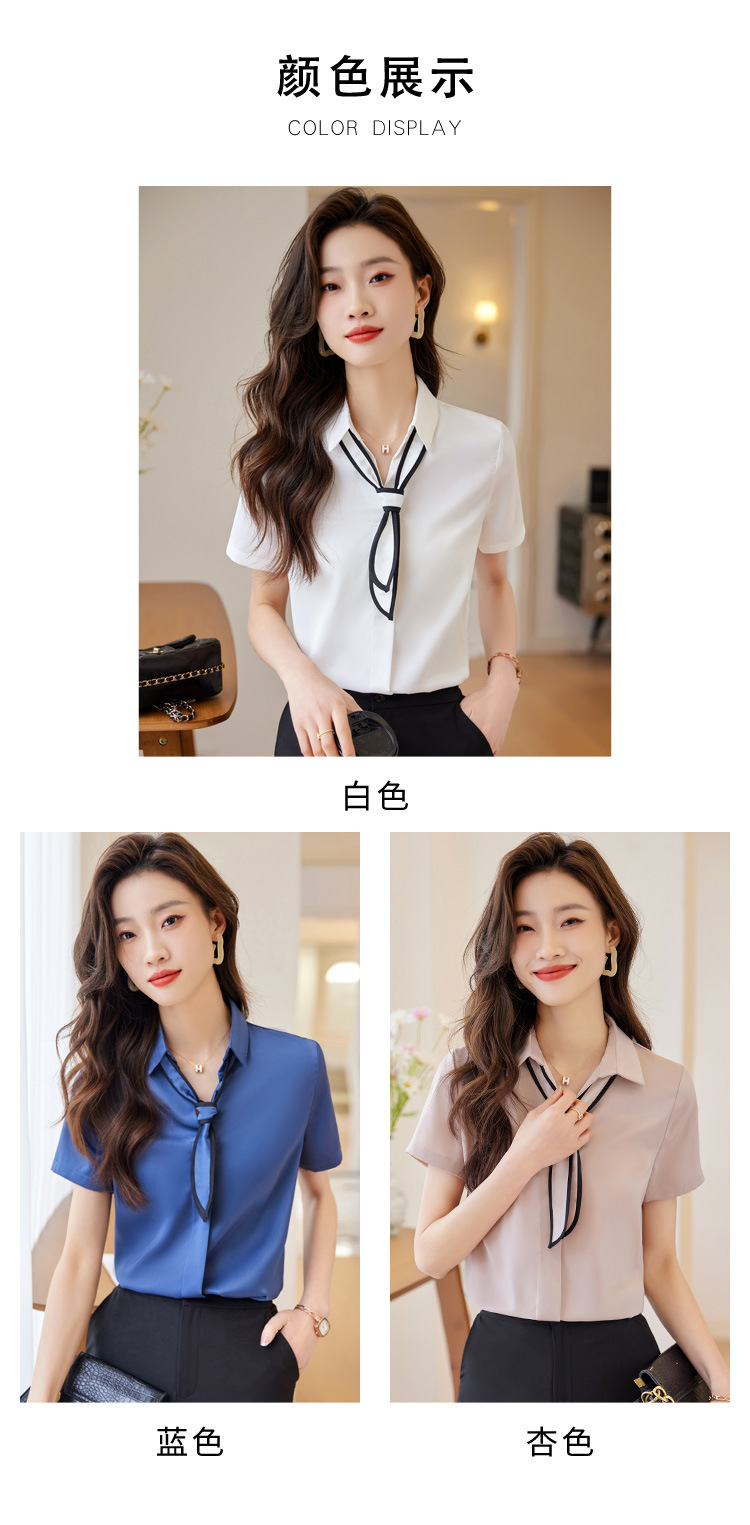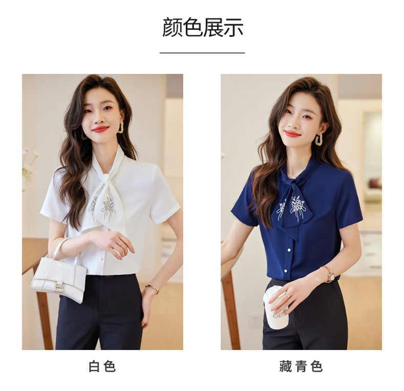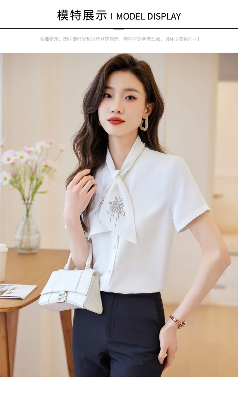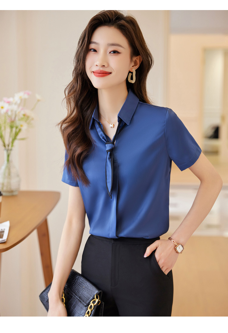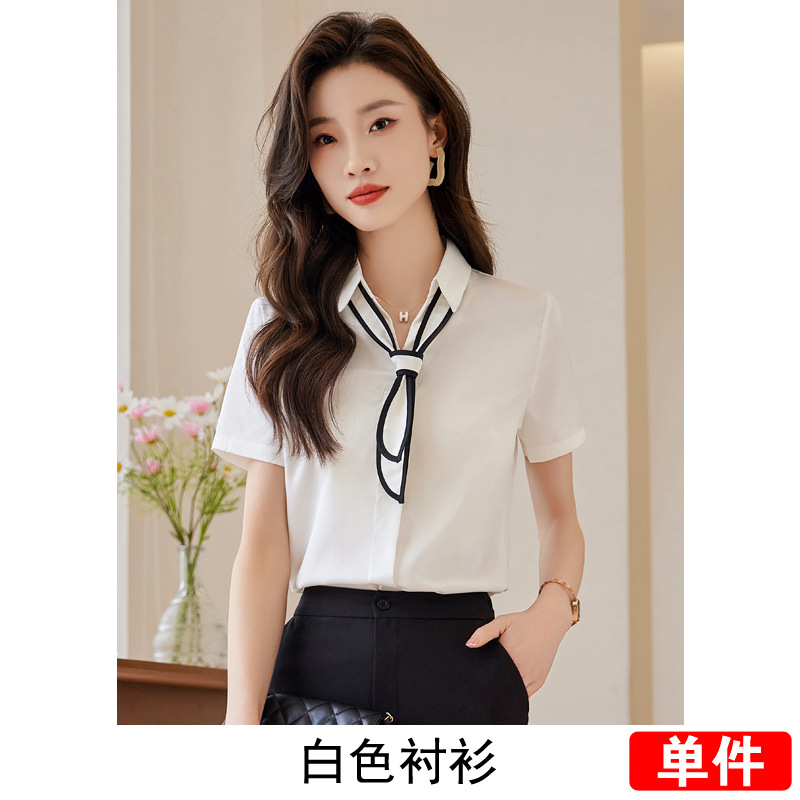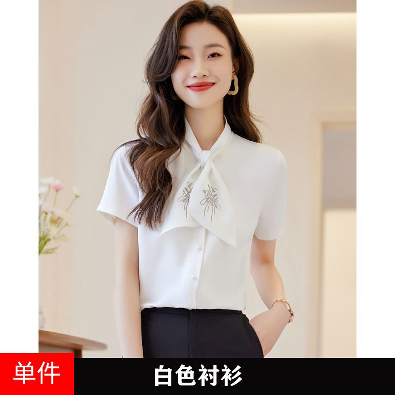 Acetic Acid Satin White 셔츠 여성용 반팔 최고 여름 얇은 활 넥타이 새로운 스타일 우아한 작업 셔츠 작업 옷스토어 가기