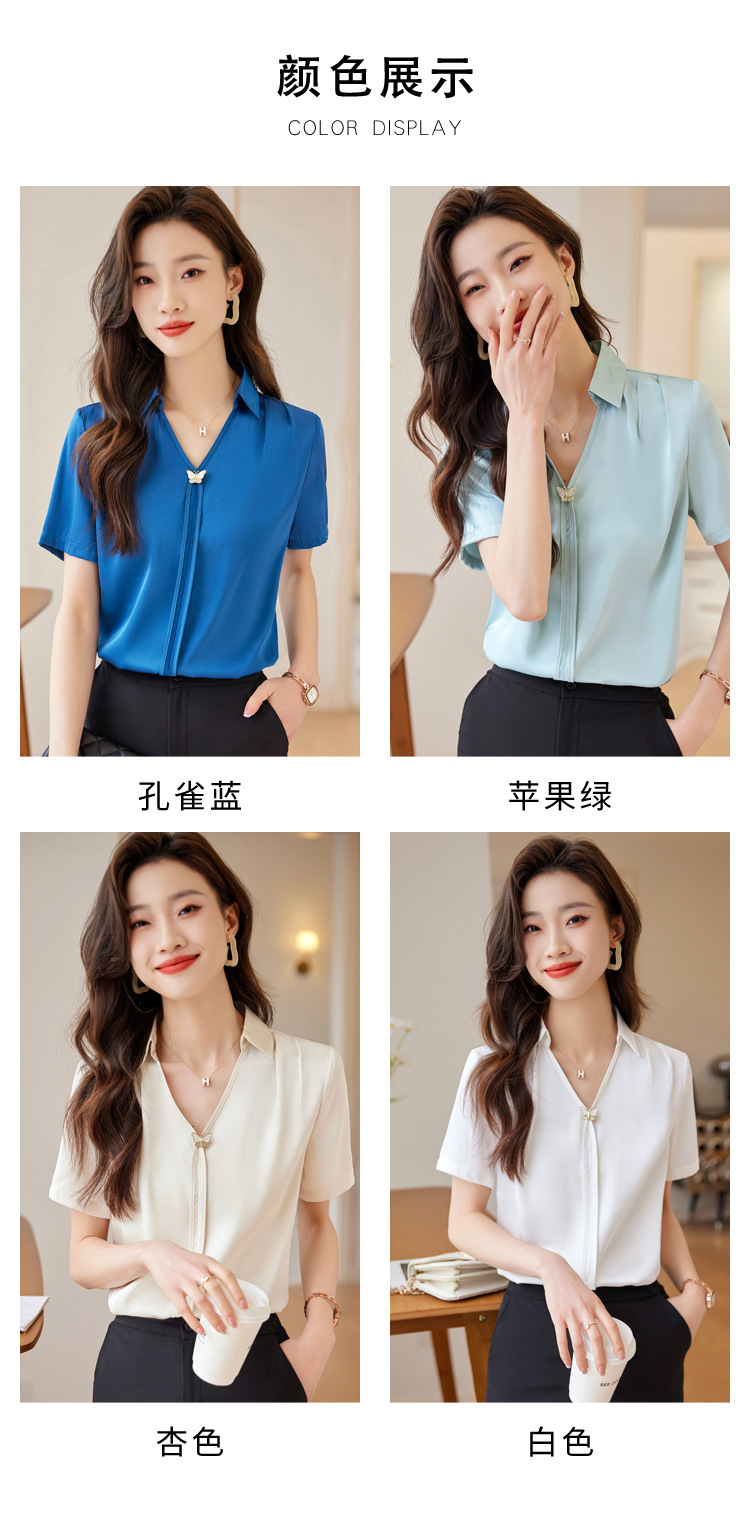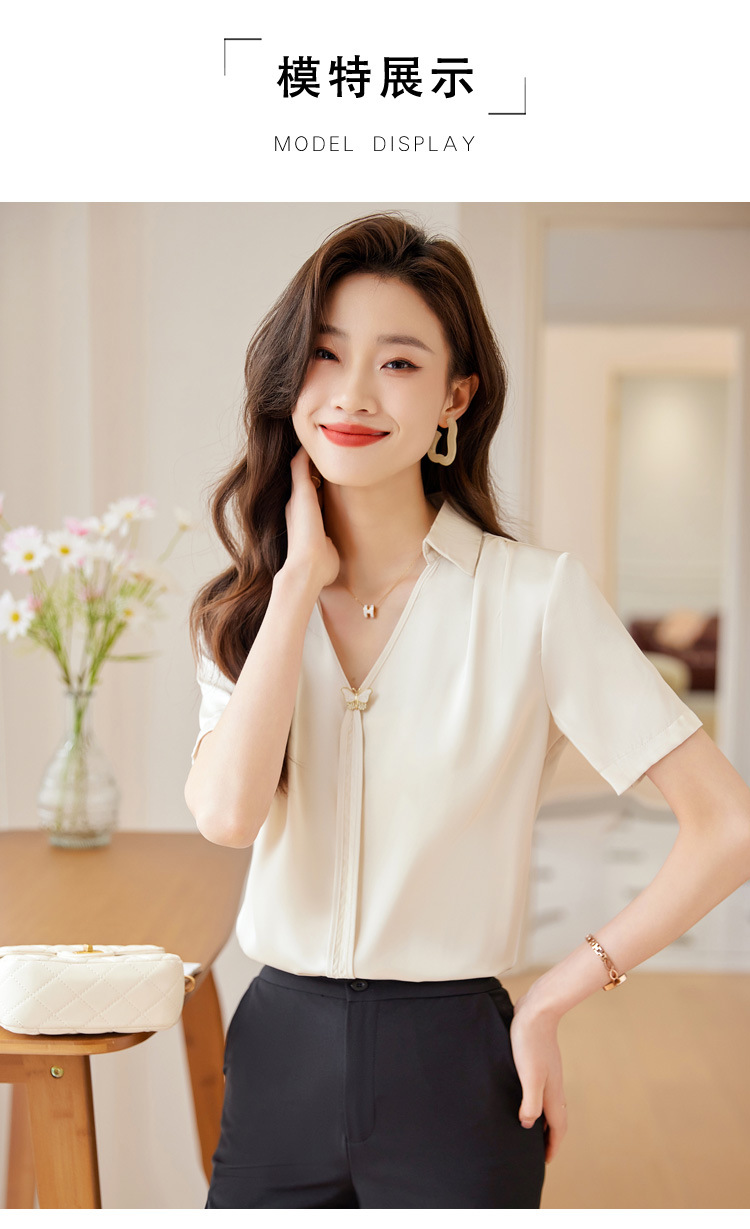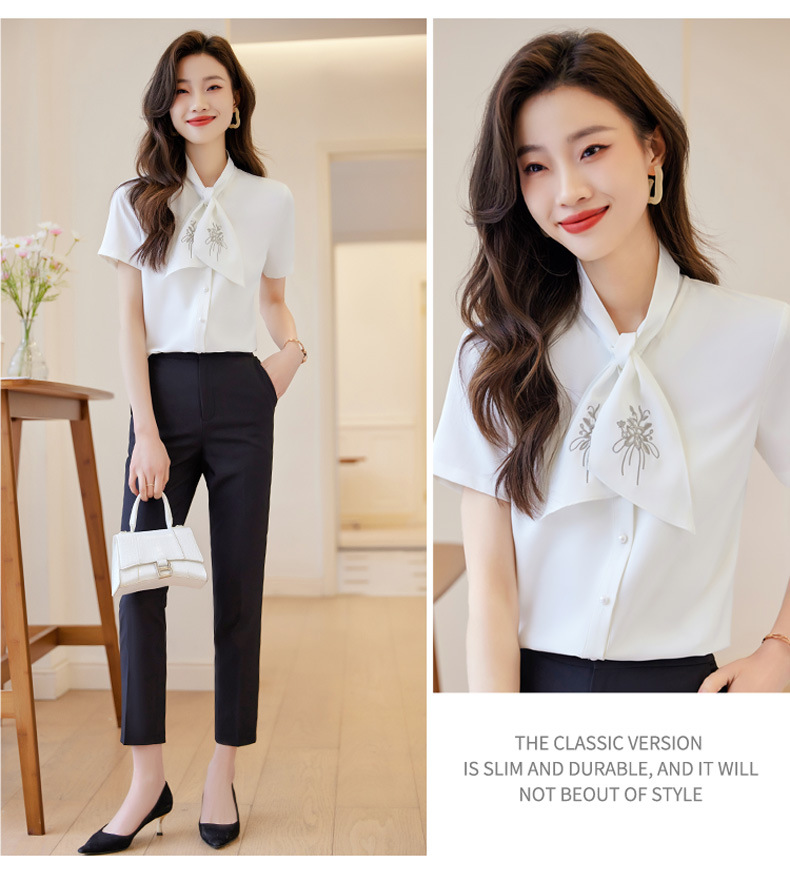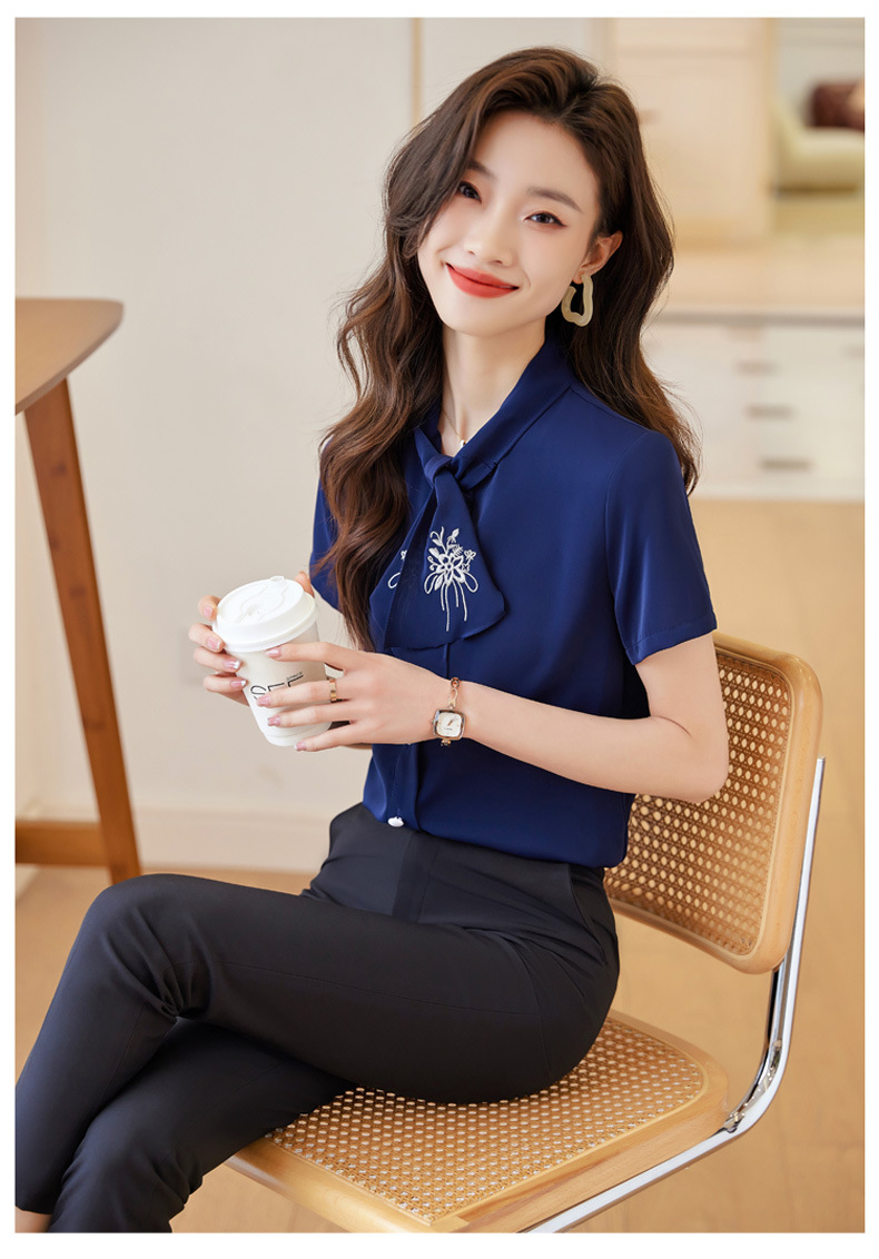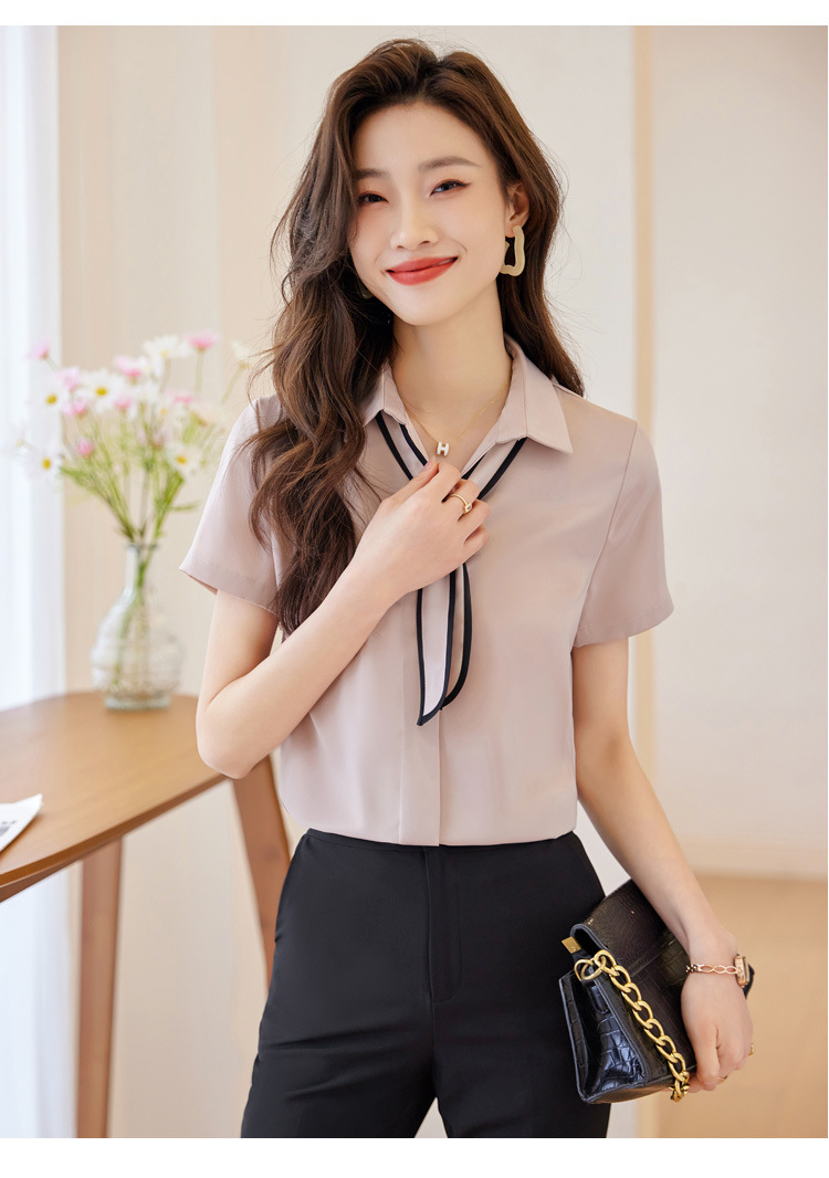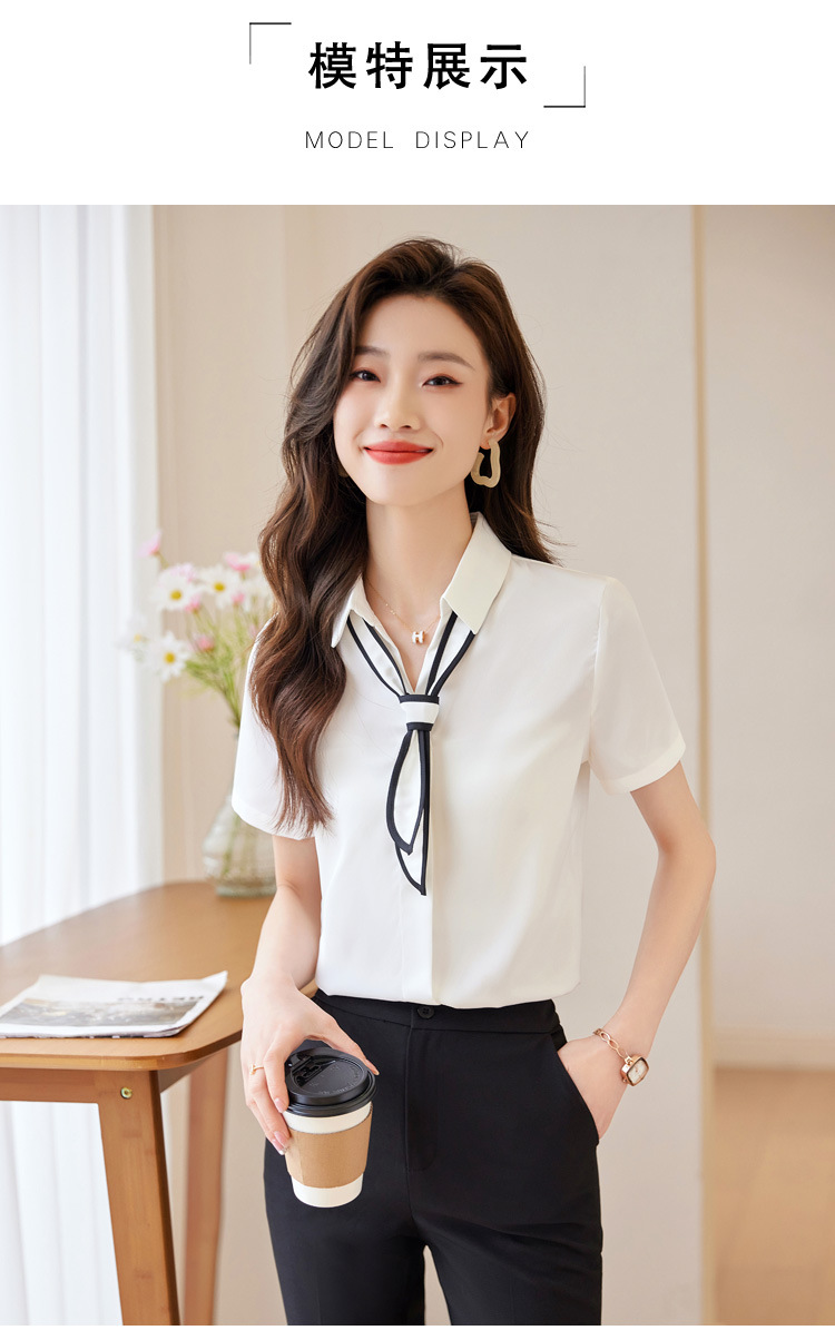 Acetic Acid Satin White 셔츠 여성용 반팔 최고 여름 얇은 활 넥타이 새로운 스타일 우아한 작업 셔츠 작업 옷스토어 가기