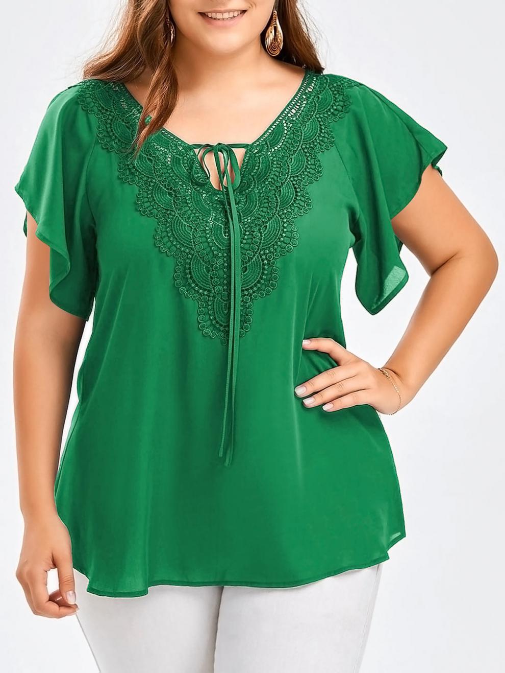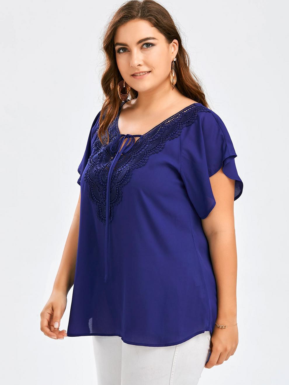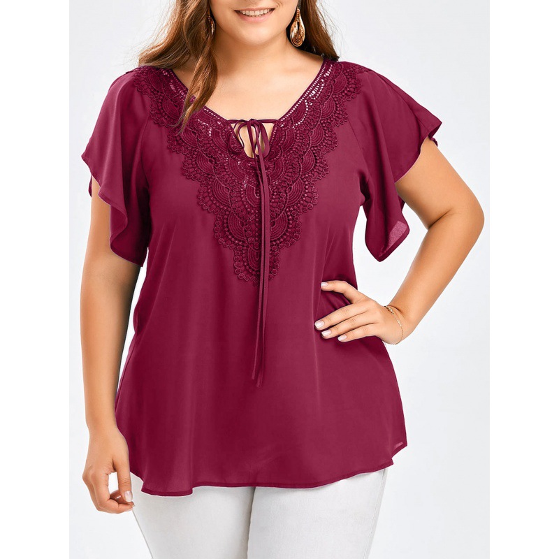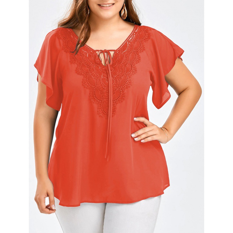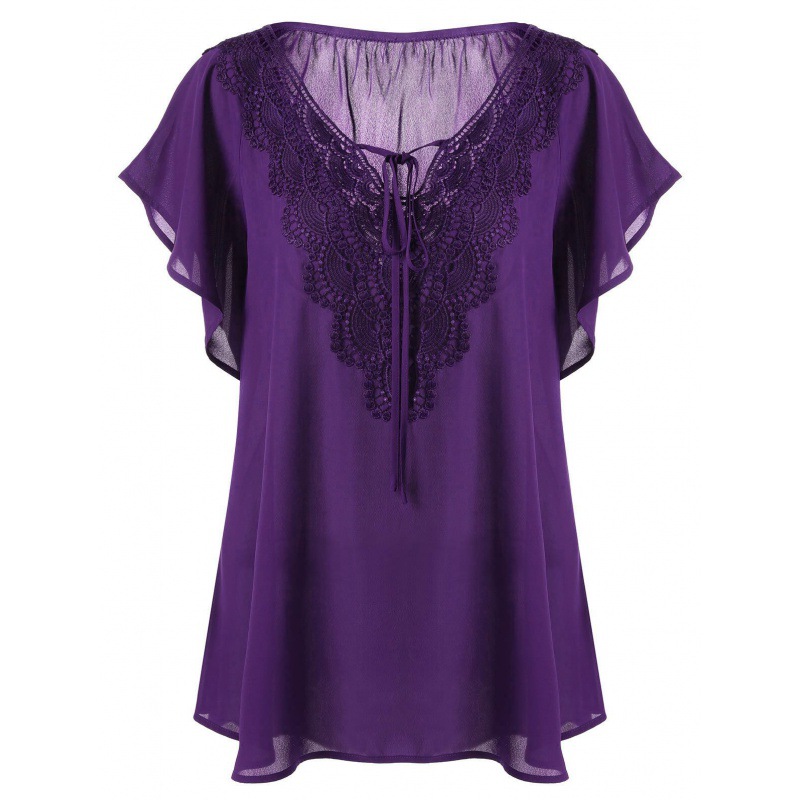 아마존 폭발 여성 뿔 소매 짧은 소매 티셔츠 레이스 스티칭 탑 플러스 사이즈 여성 의류