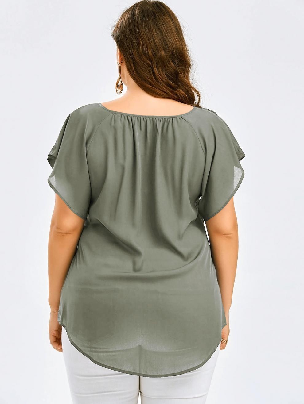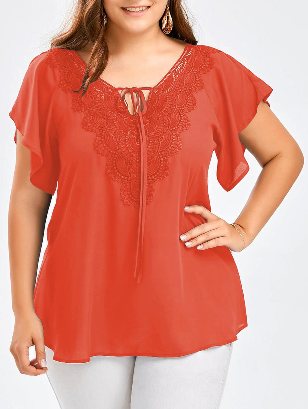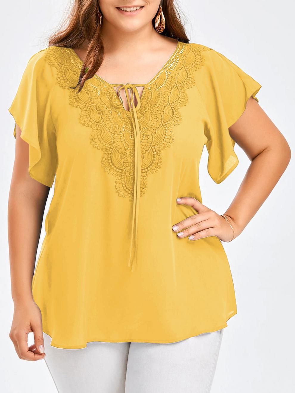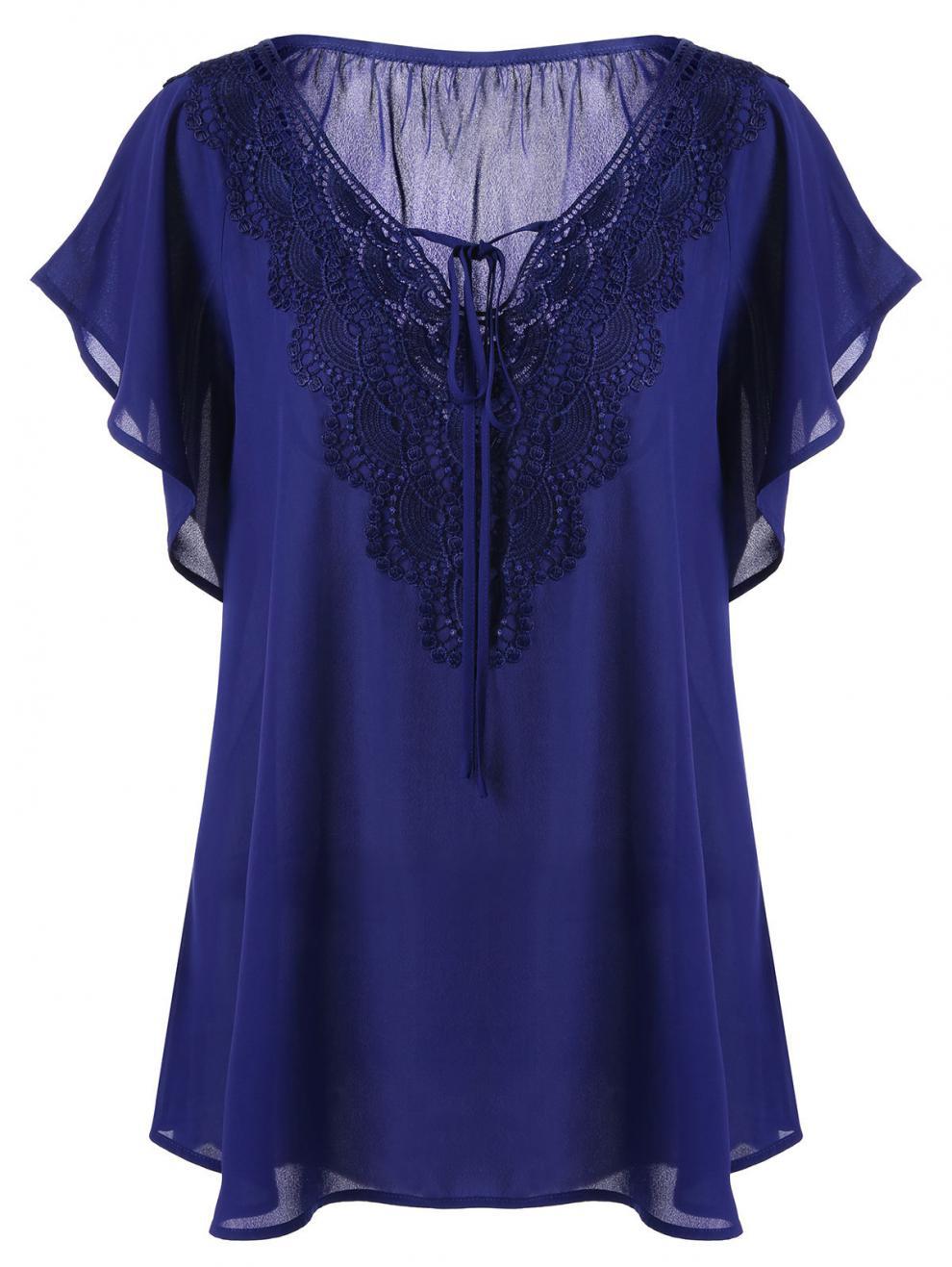 아마존 폭발 여성 뿔 소매 짧은 소매 티셔츠 레이스 스티칭 탑 플러스 사이즈 여성 의류