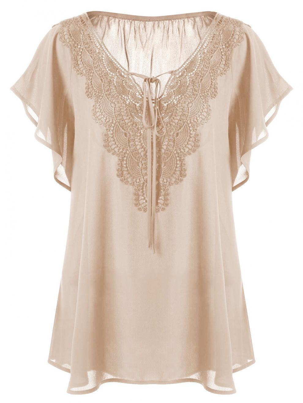 아마존 폭발 여성 뿔 소매 짧은 소매 티셔츠 레이스 스티칭 탑 플러스 사이즈 여성 의류스토어 가기