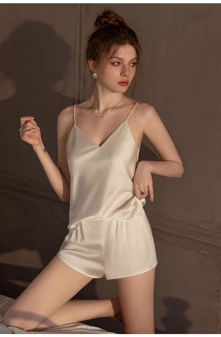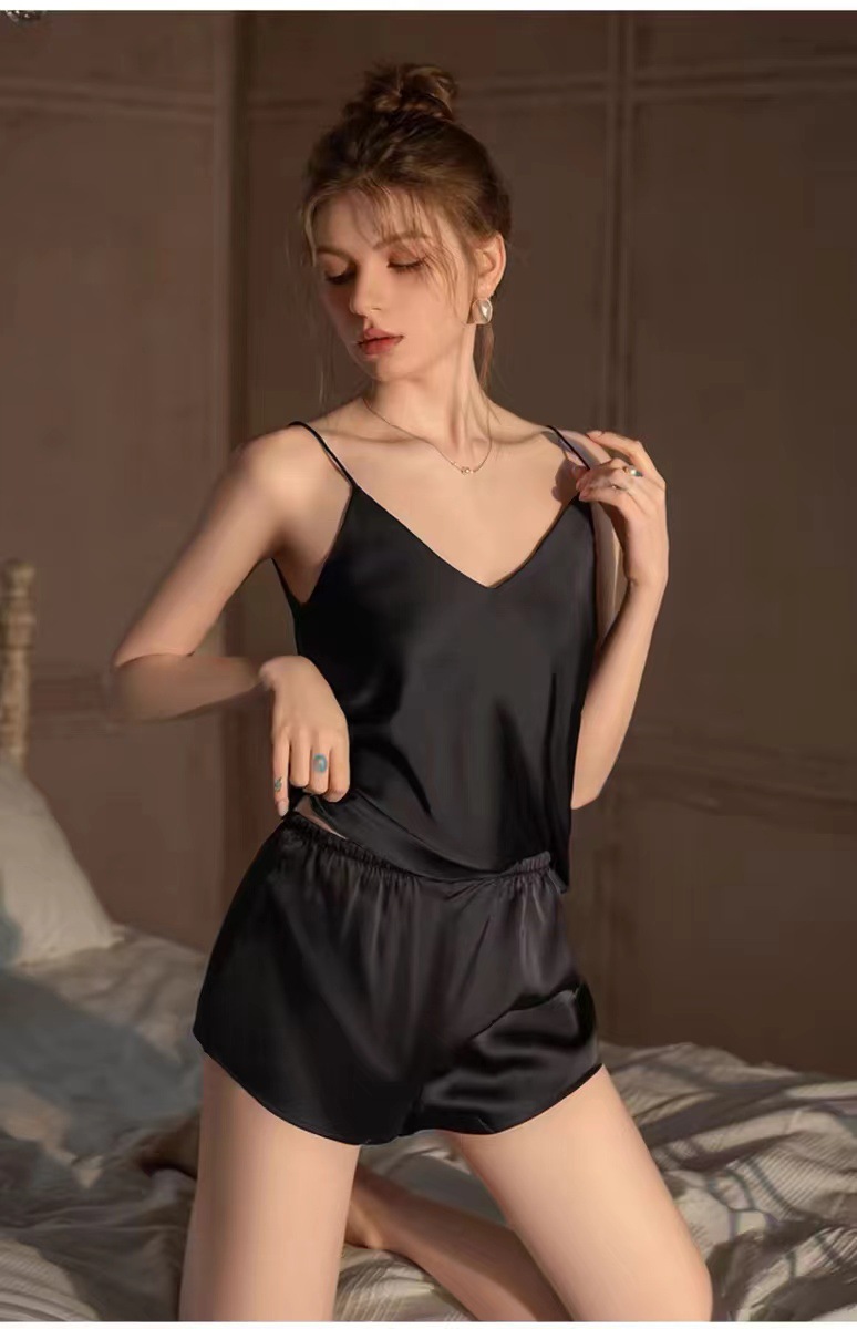 2025 여성을위한 새로운 잠옷 여름 얼음 실크 솔리드 컬러 대형 서스펜더 반바지 정장 봄, 가을 하이 엔드 홈웨어스토어 가기