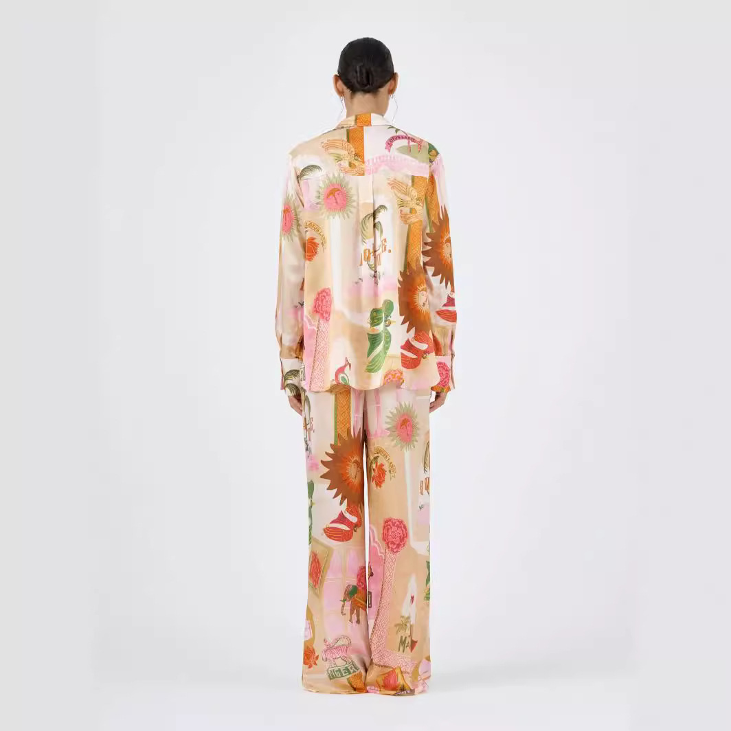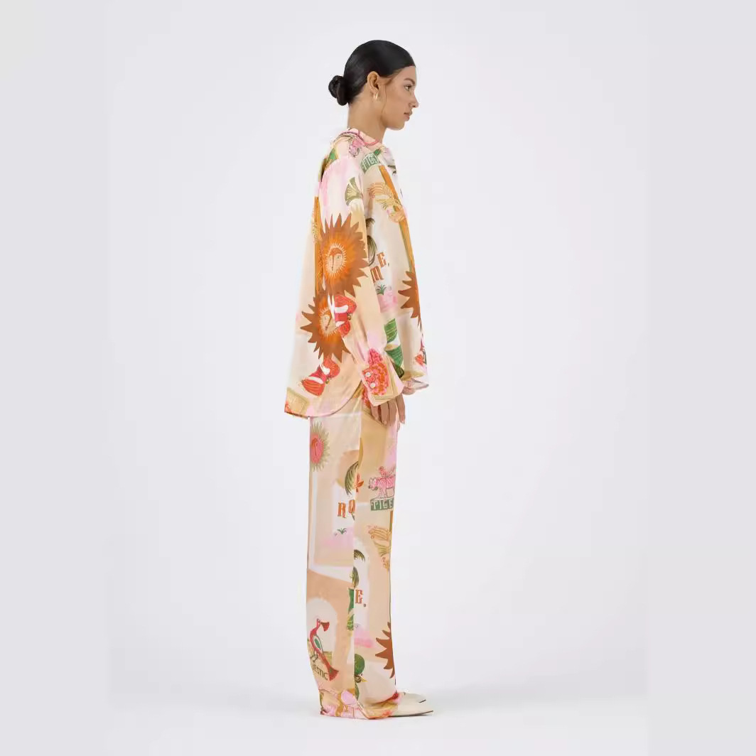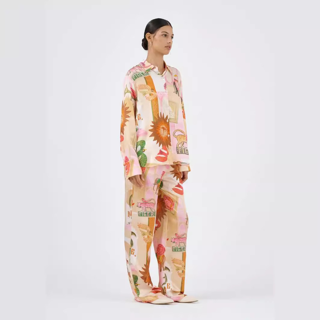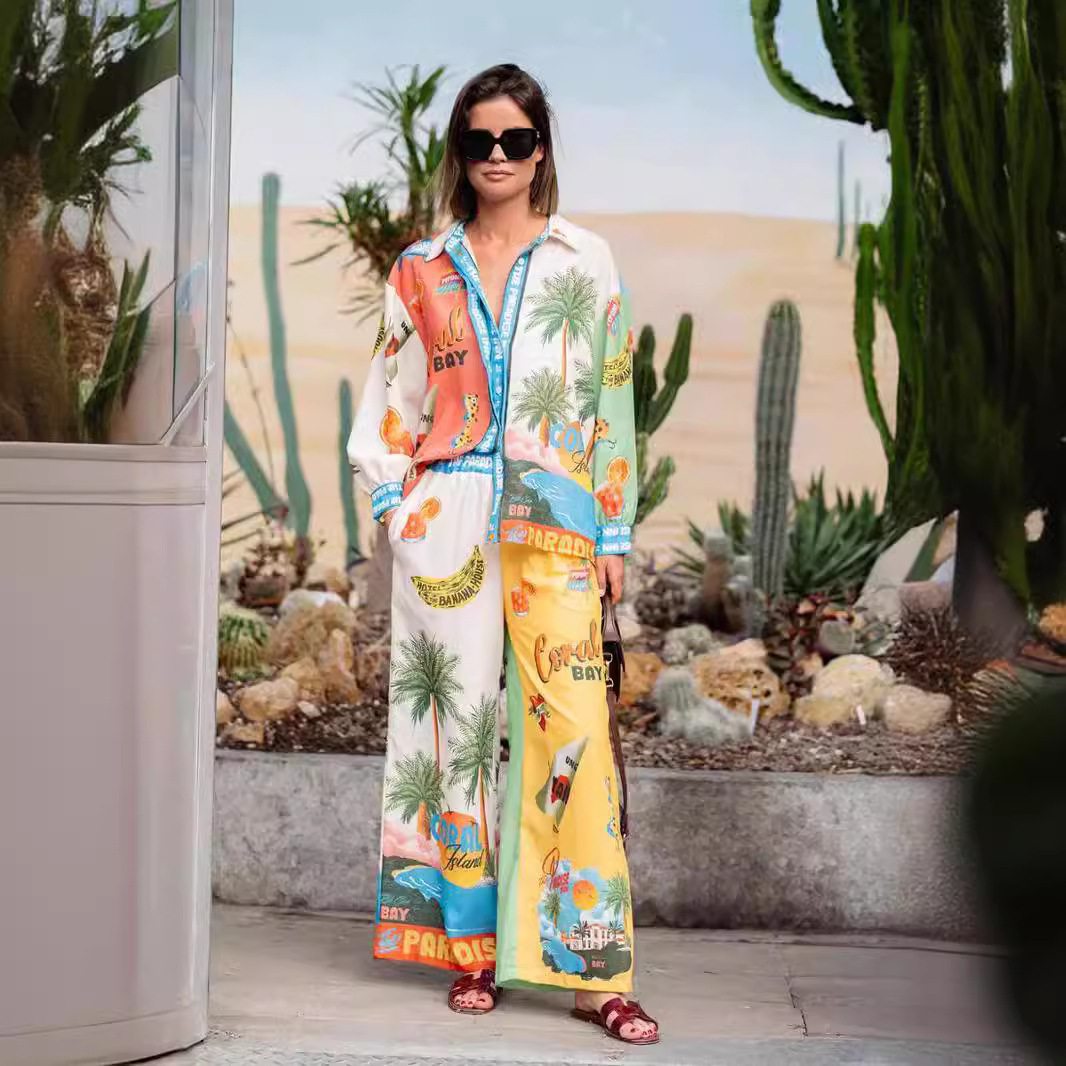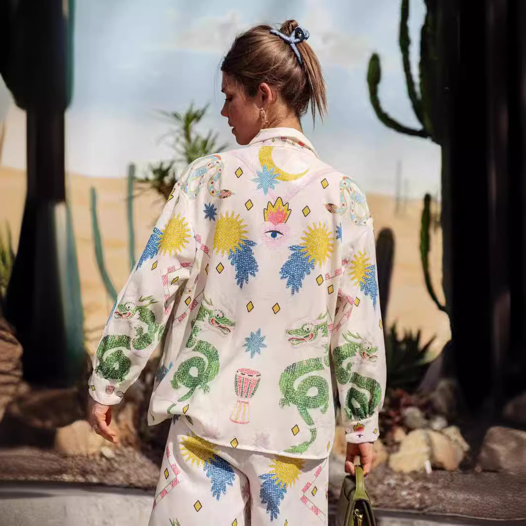 유럽과 미국 국경 2025 새로운 독립 방송국 AliExpress 패션 성격 인쇄 마카롱 리넨 긴 소매 셔츠 세트