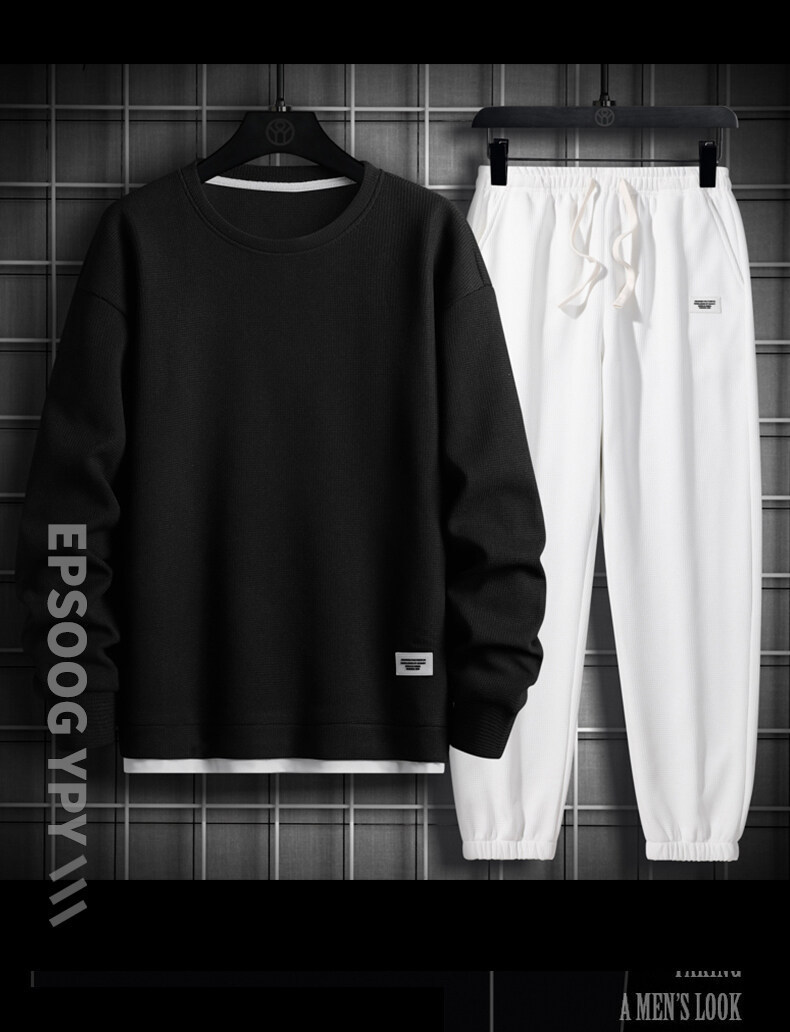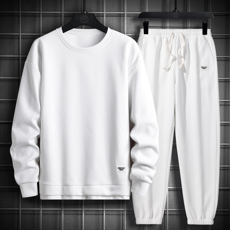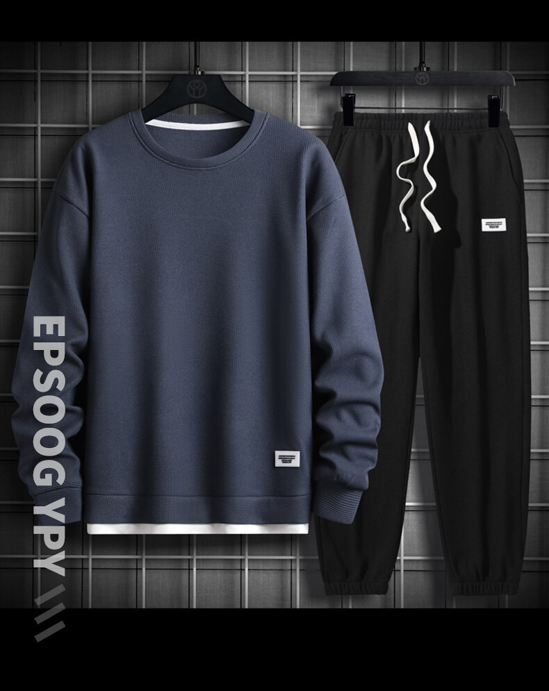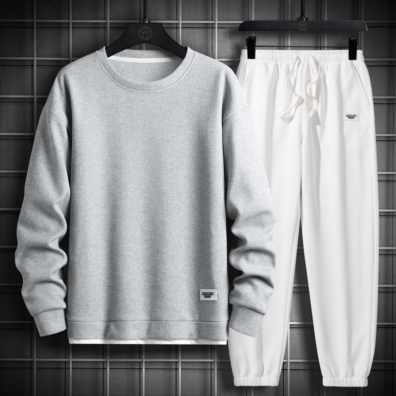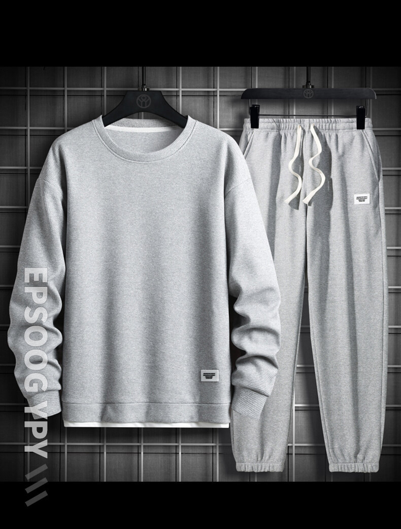 남성용 가을 패션 와플 솔리드 컬러 라운드넥 스웨트셔츠와 루즈한 9부 팬츠로 구성된 크로스보더 남성 캐주얼 스포츠 슈트