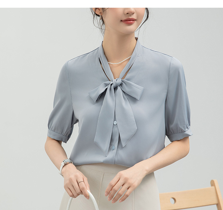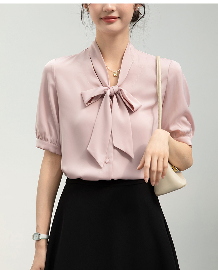 2025 Real Shot New White Bow 셔츠 여성용 프렌치 퍼프 슬리브 작은 인터뷰 새틴 짧은 소매 셔츠