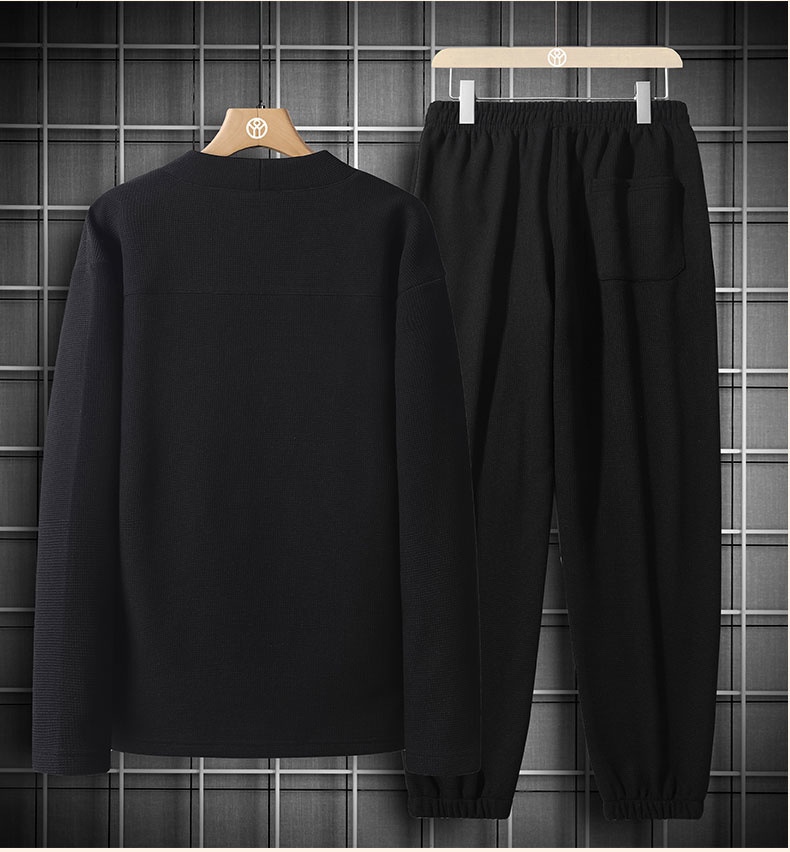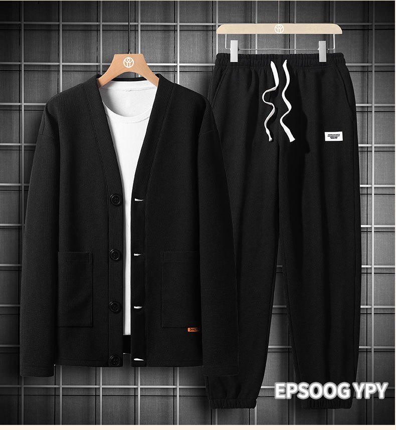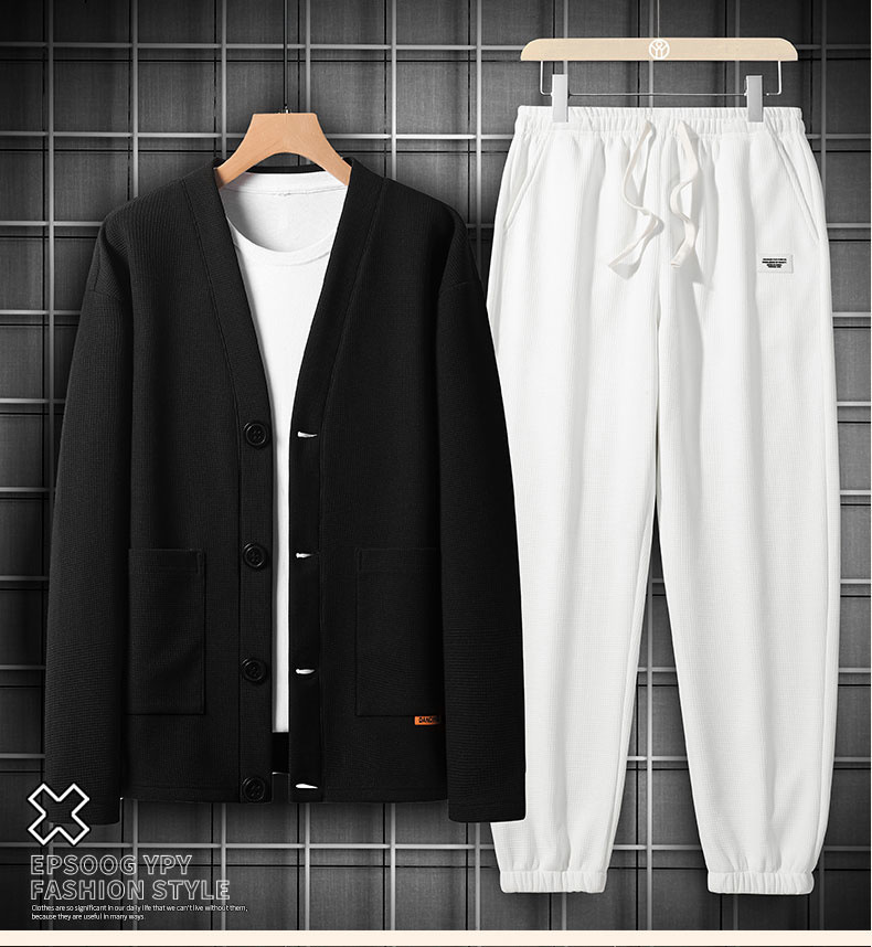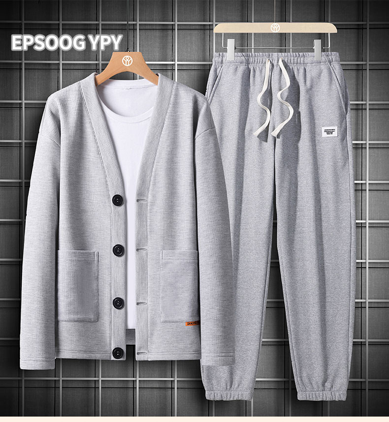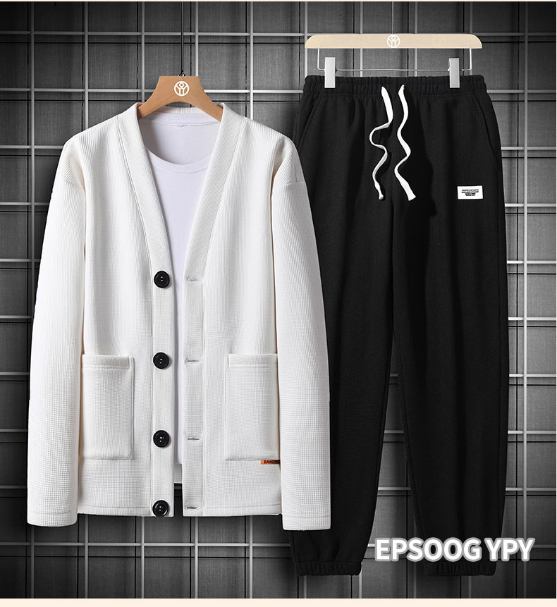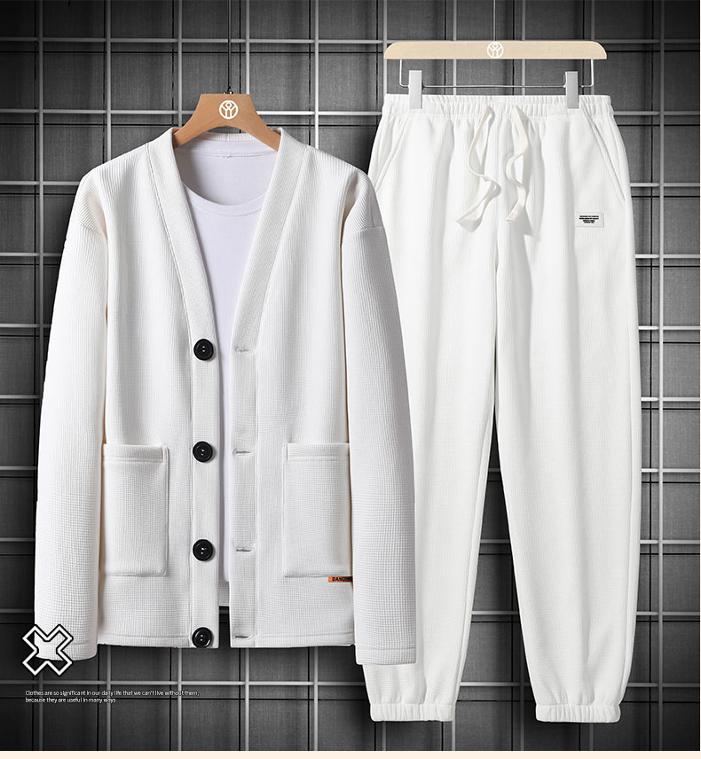 2024 봄과 가을 단색 와플 한국 스타일 Ins 스웨터 세트 싱글 브레스트 카디건 스포츠 세트 남성복