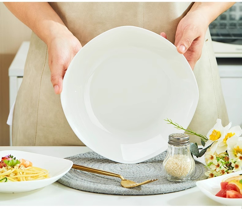 Jingdezhen 순수한 흰색 뼈 중국 플레이트 세트 가정용 세라믹 플레이트 간단한 불규칙한 사각형 플레이트 언더 유약 컬러 수프 플레이트