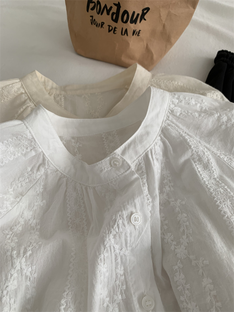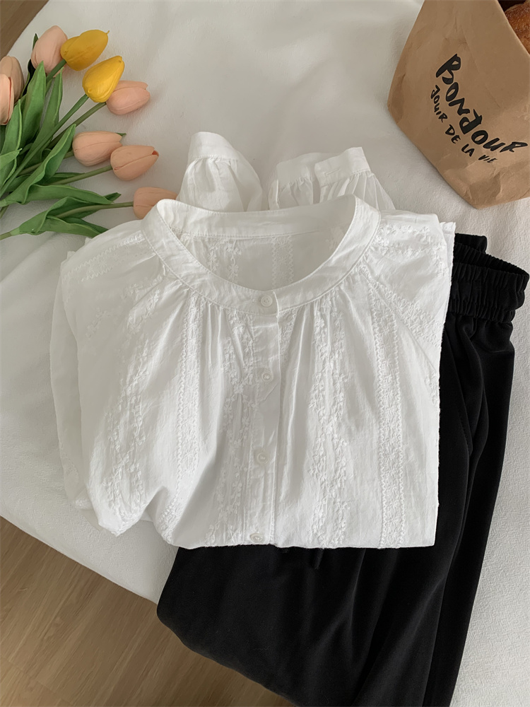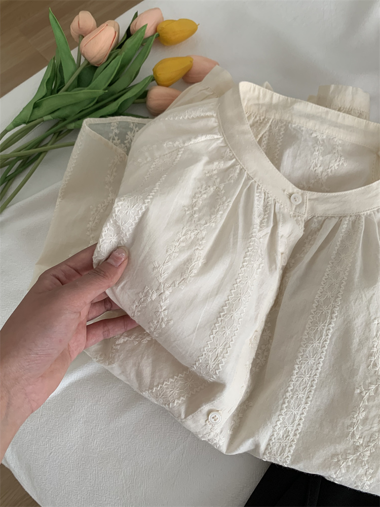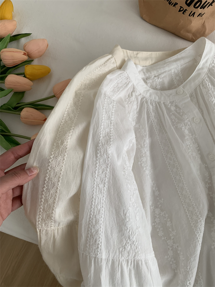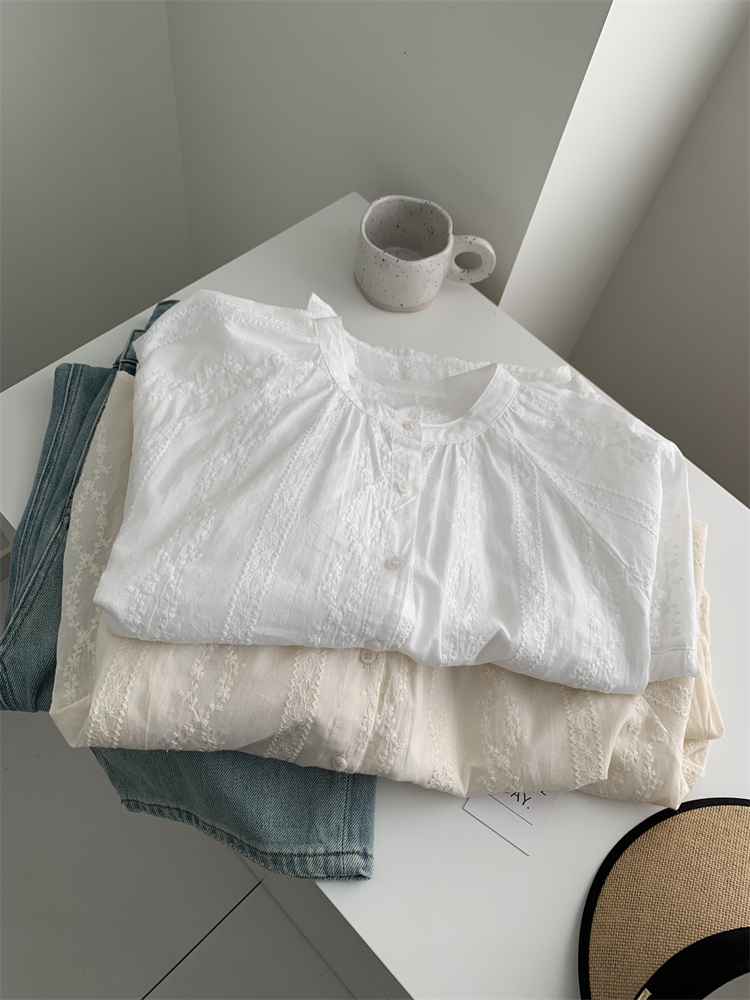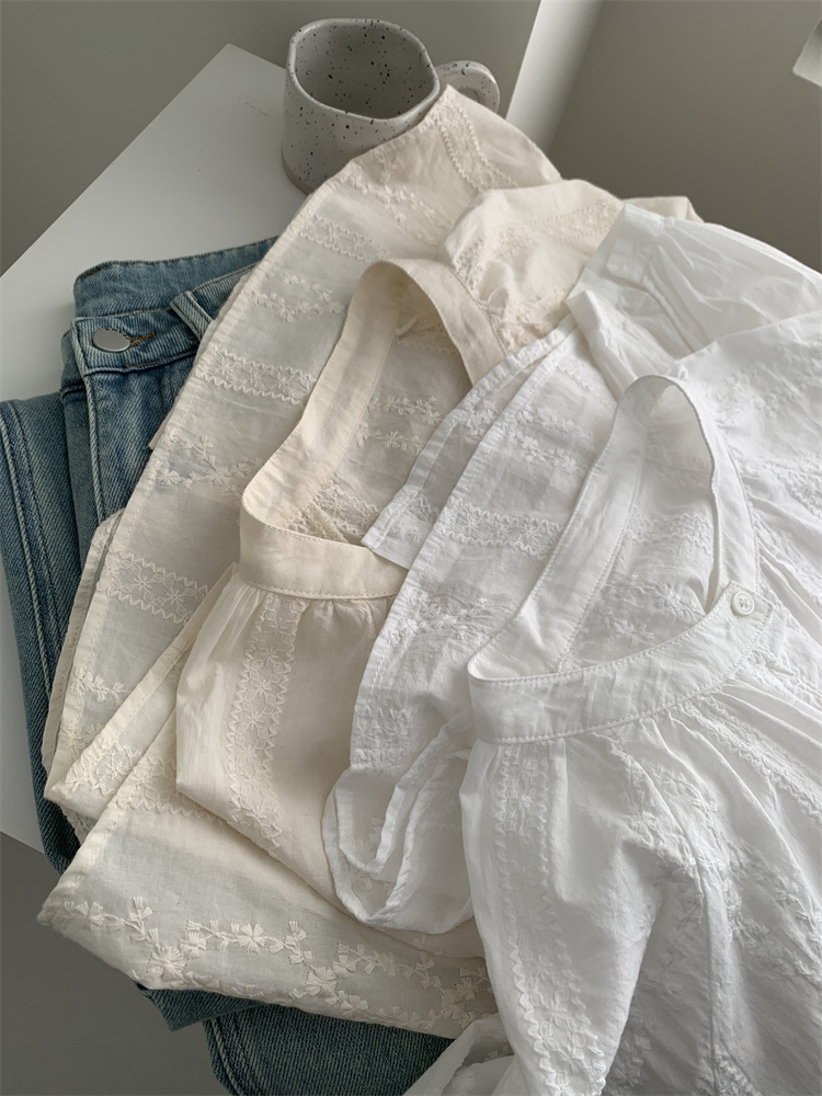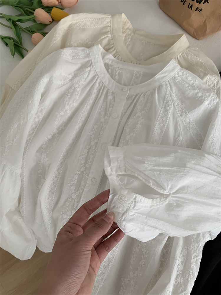프랑스 복고풍 자카드 수놓은 둥근 목 셔츠 여성용 봄과 여름 새로운 디자인 센스 바느질 랜턴 슬리브 연령 감소 인형 셔츠