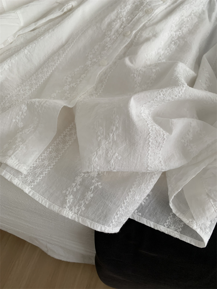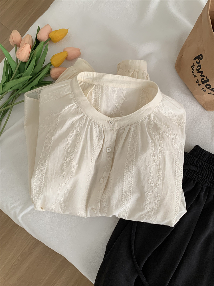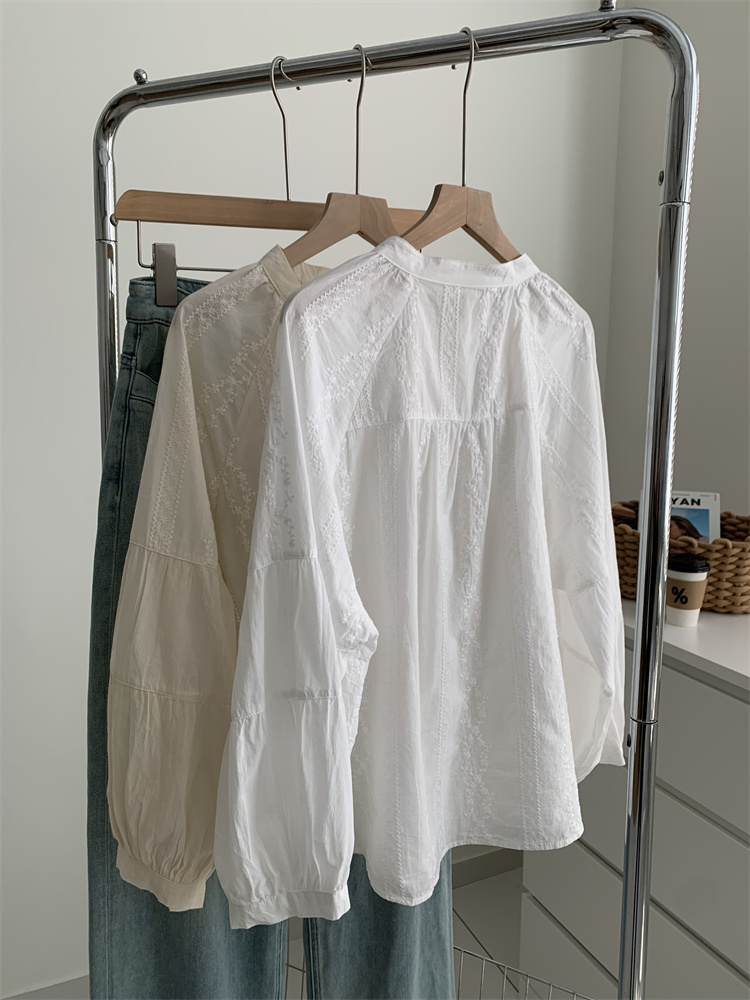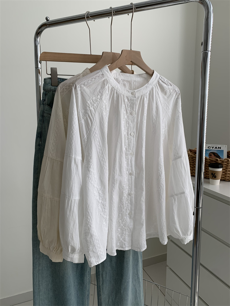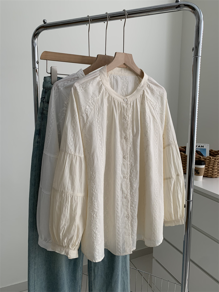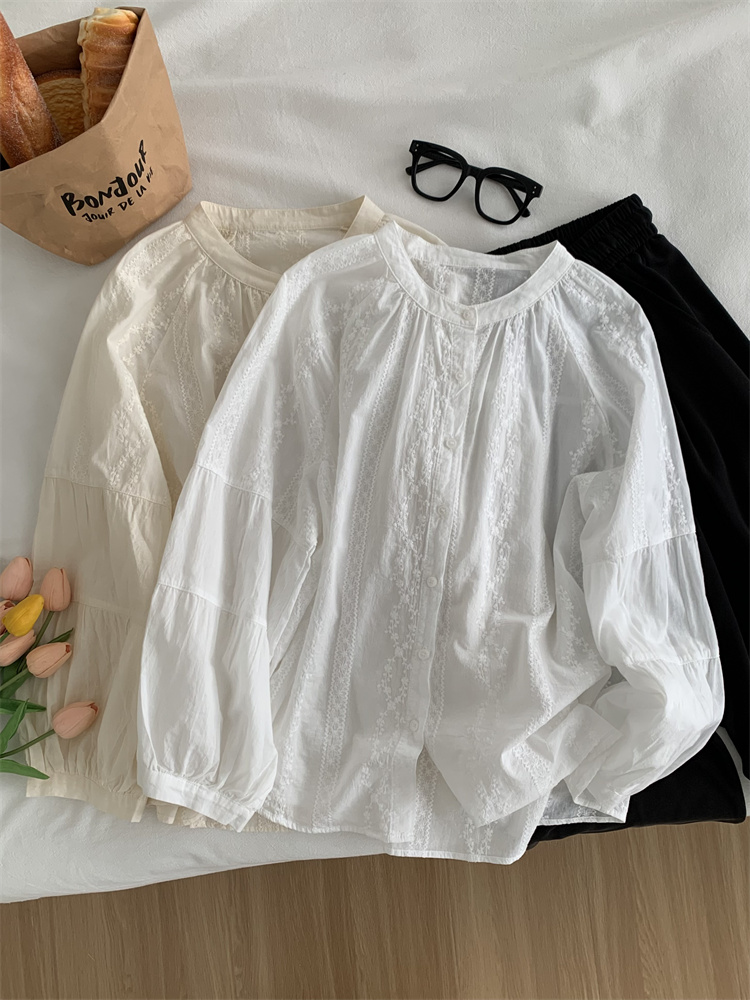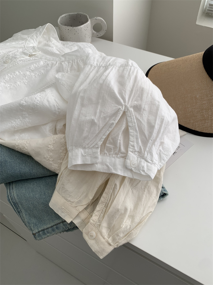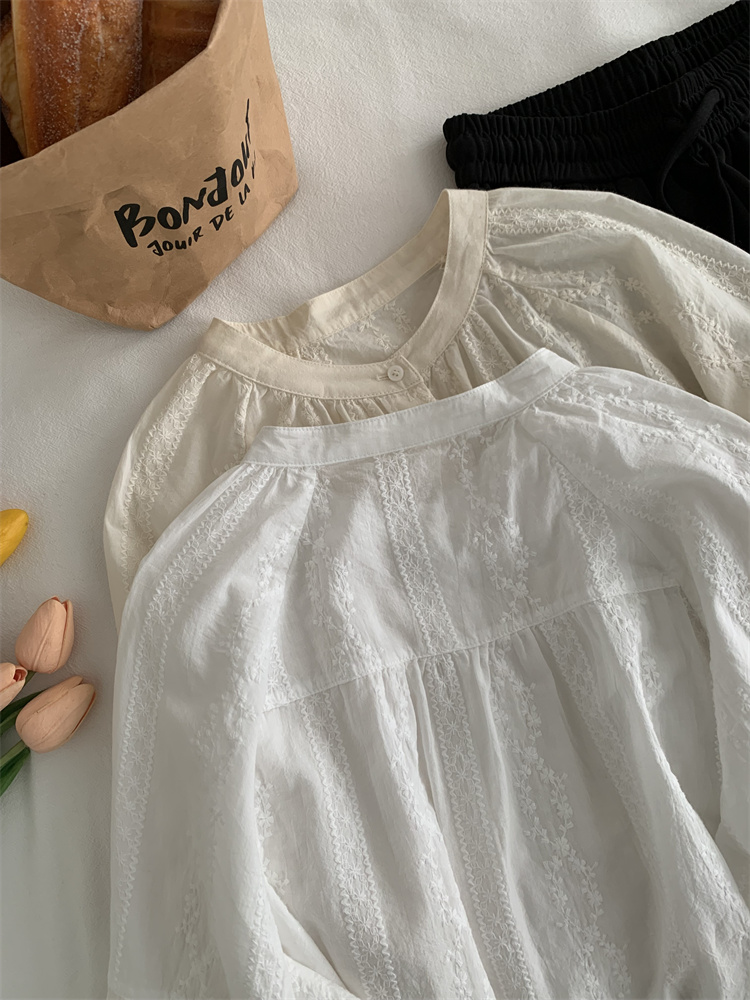 프랑스 복고풍 자카드 수놓은 둥근 목 셔츠 여성용 봄과 여름 새로운 디자인 센스 바느질 랜턴 슬리브 연령 감소 인형 셔츠