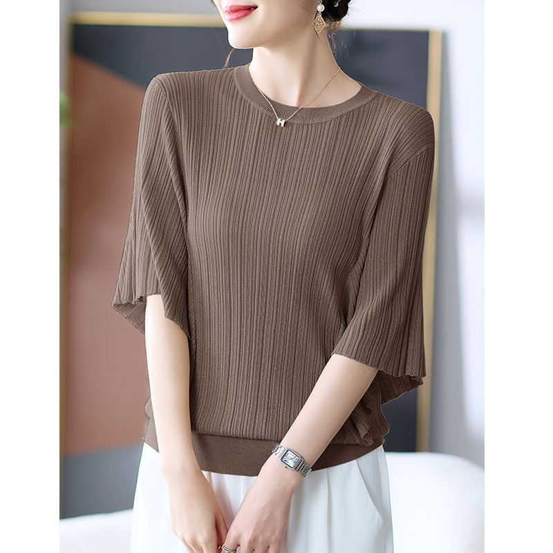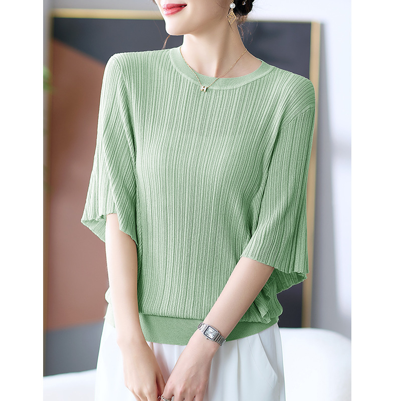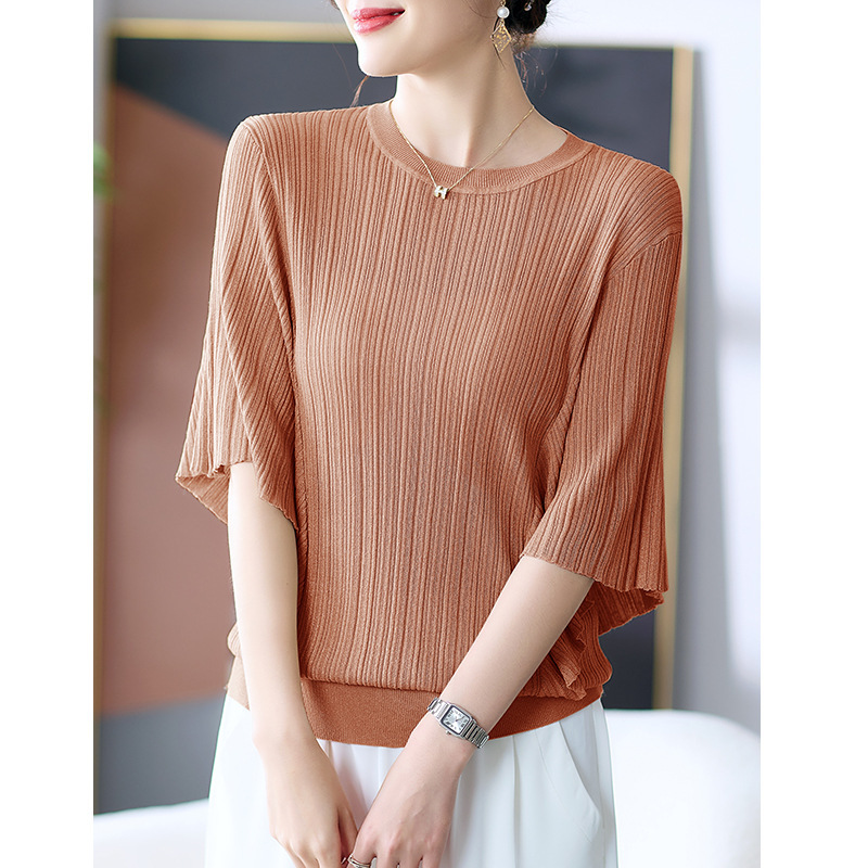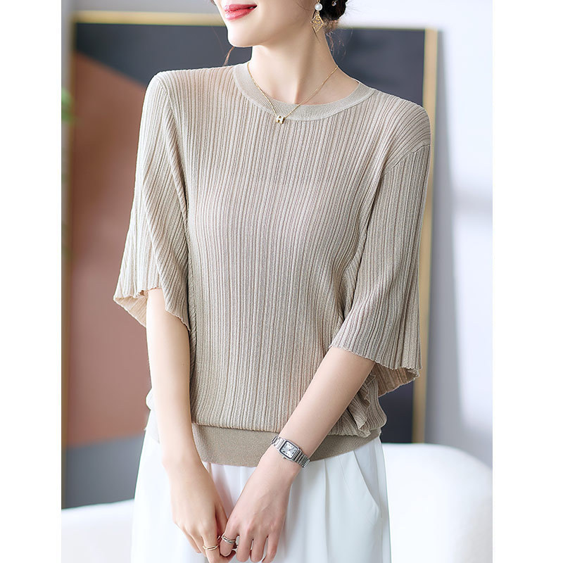 2024 봄과 여름 새로운 여성 반팔 티셔츠 니트 배꼽 커버 탑 서양식 시대 감소 슬리밍 티셔츠스토어 가기