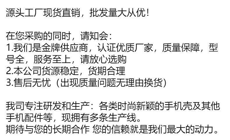 Our company focuses on research and production of various fashionable and innovative phone cases and other phone accessories, and currently has multiple production lines. Looking forward to long-term cooperation with you. Your trust is our greatest motivation