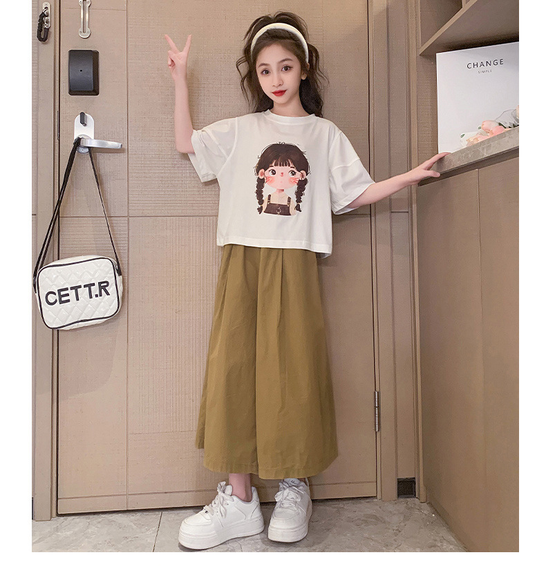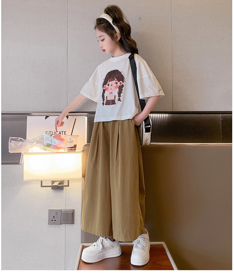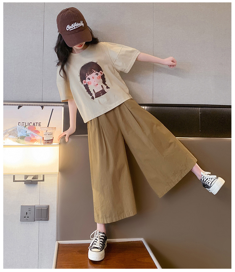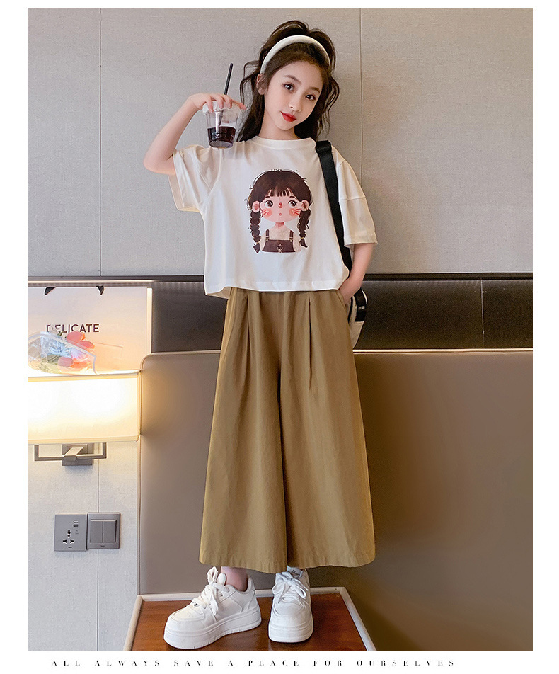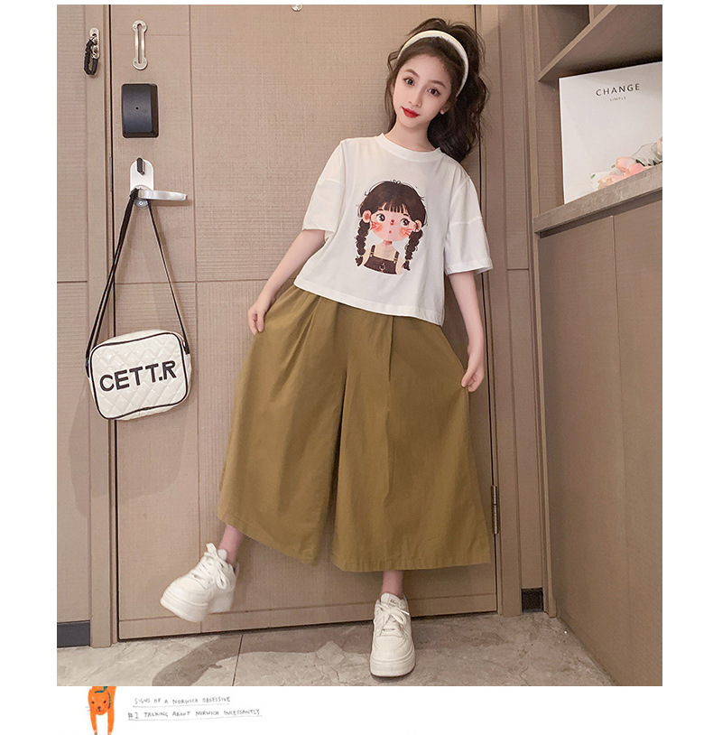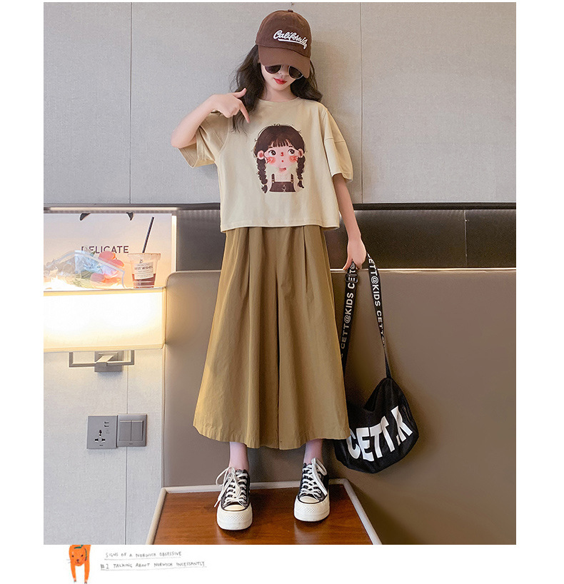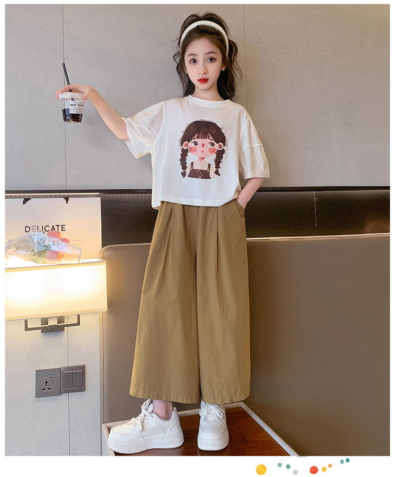 소녀의 패션 여름 투피스 세트 2024 새로운 고등학교 만화 소녀의 중학생을위한 반팔 와이드 레그 바지 세트