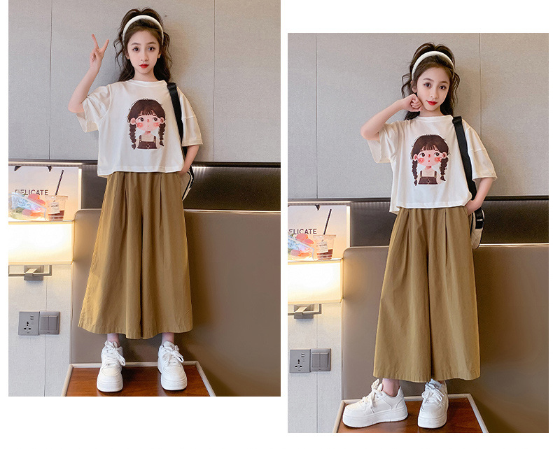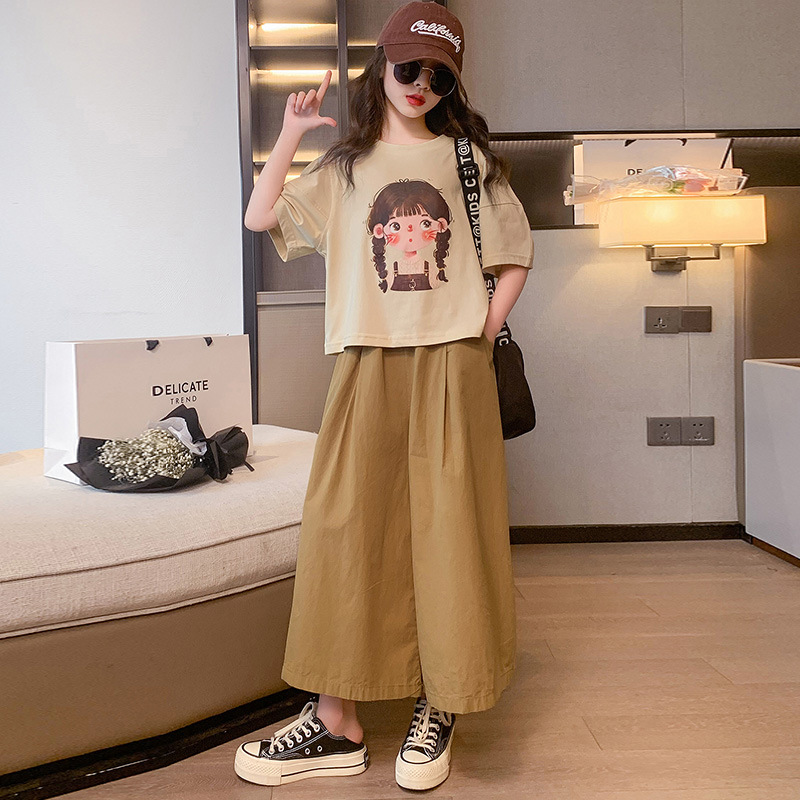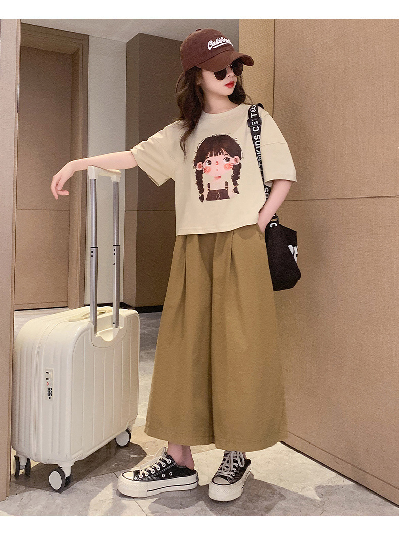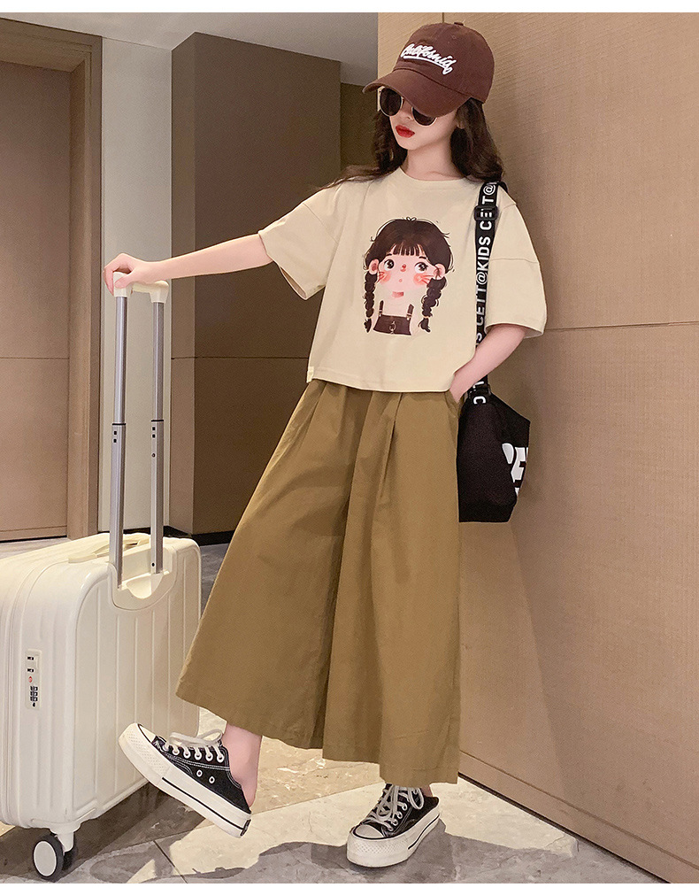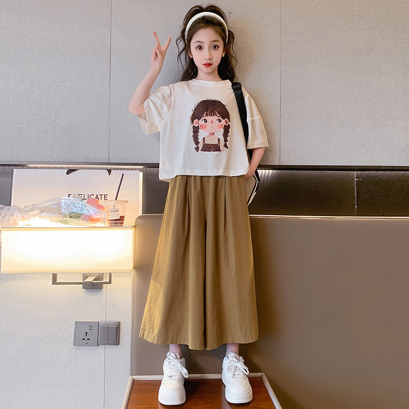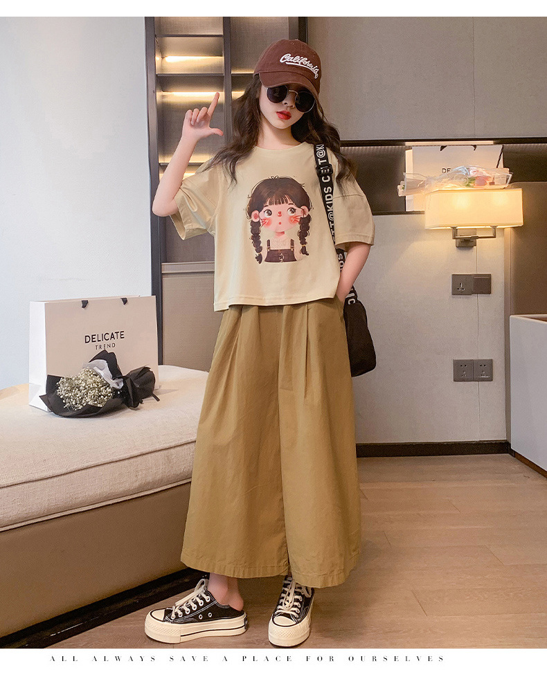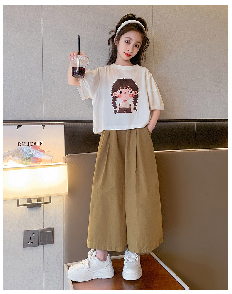 소녀의 패션 여름 투피스 세트 2024 새로운 고등학교 만화 소녀의 중학생을위한 반팔 와이드 레그 바지 세트