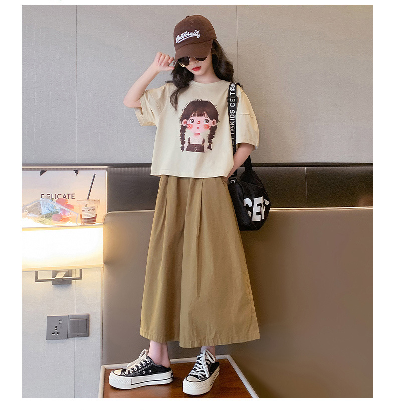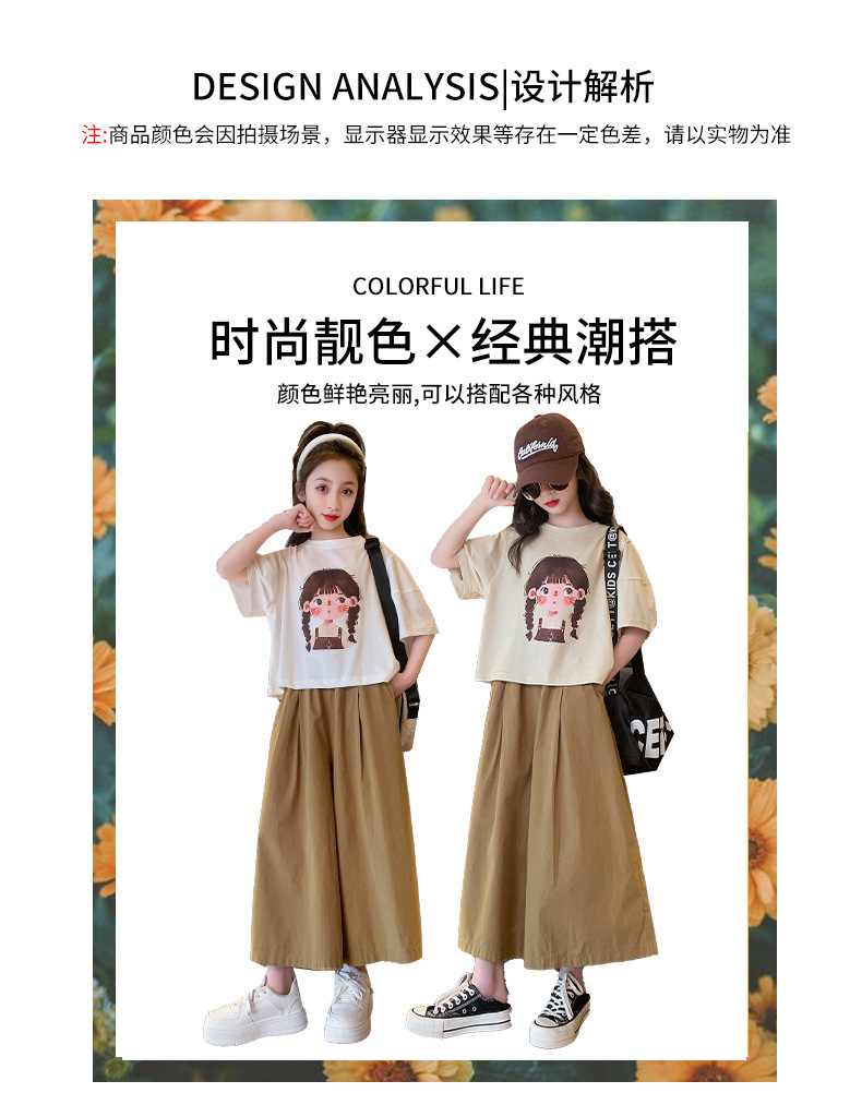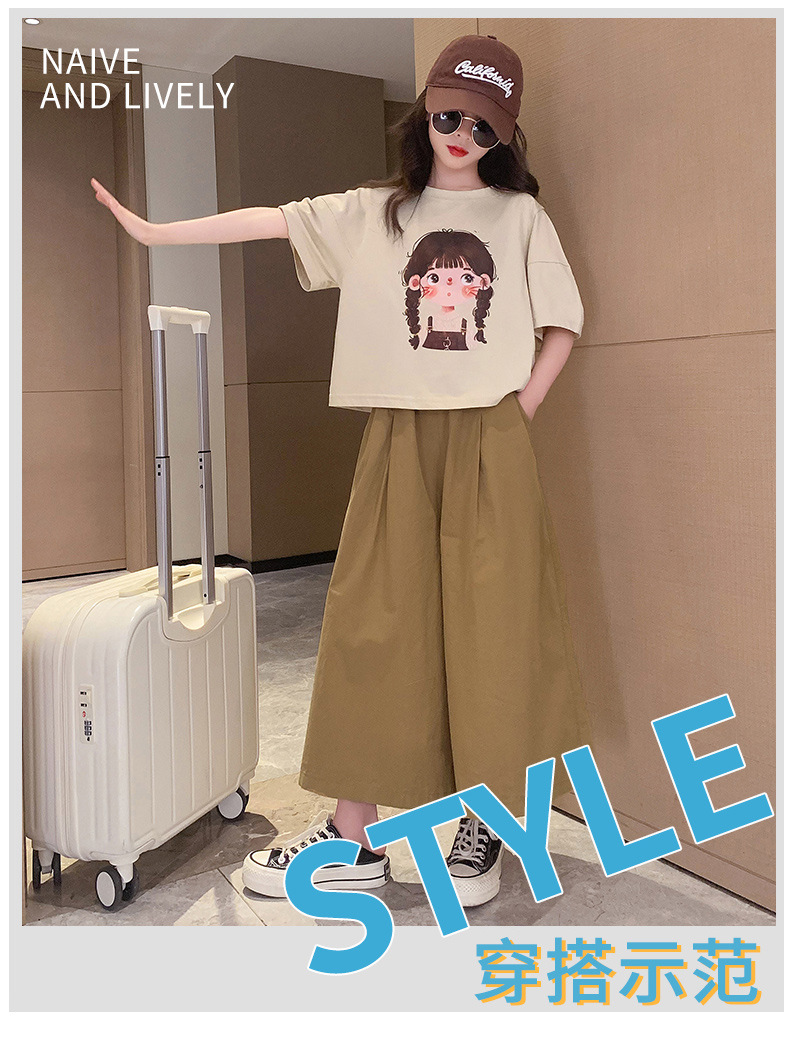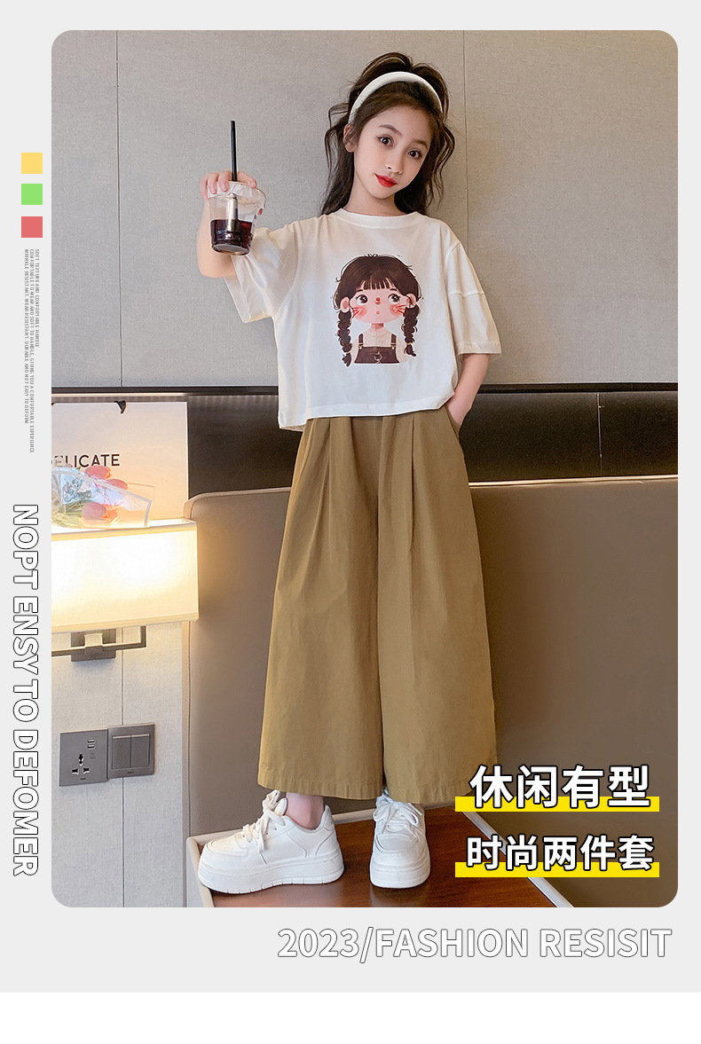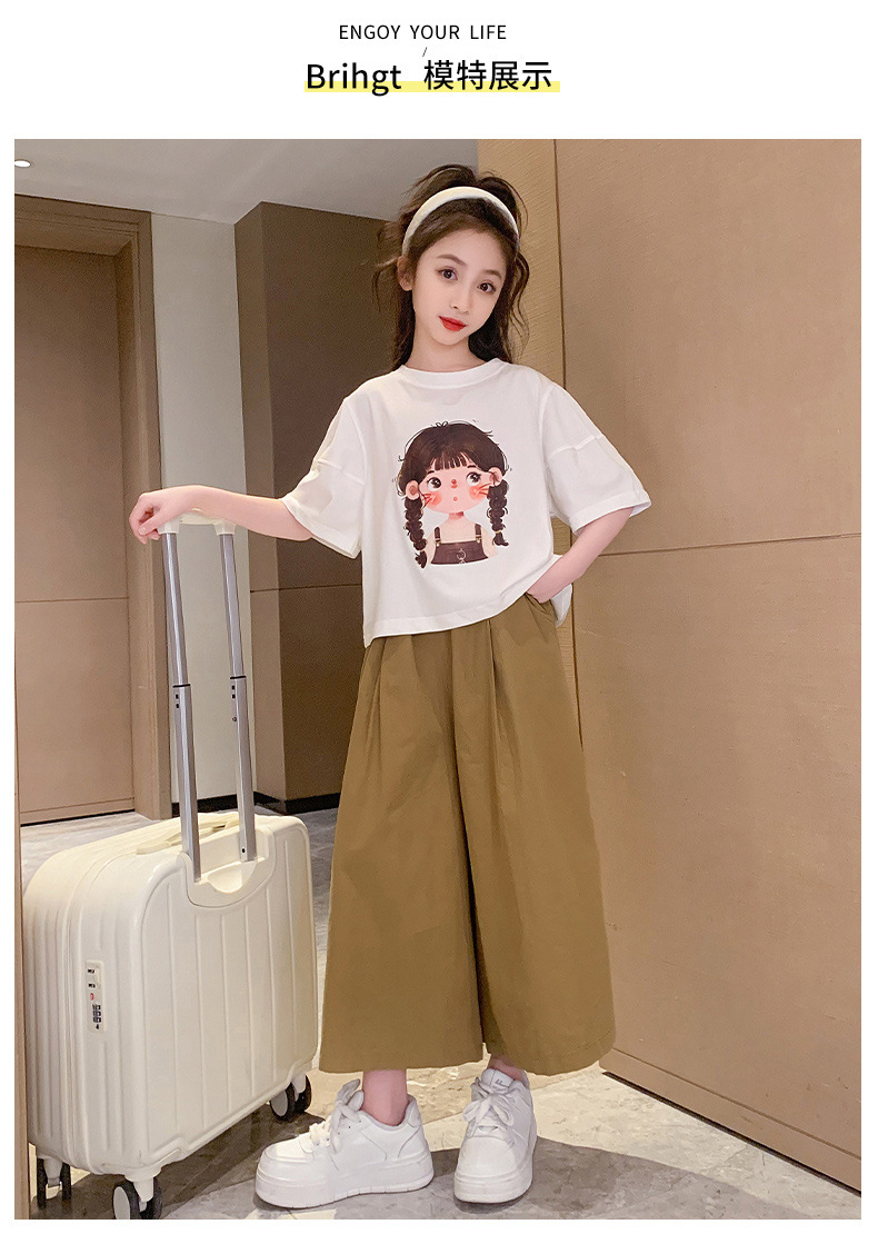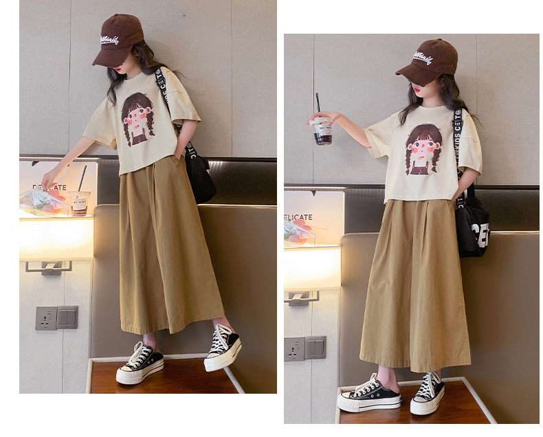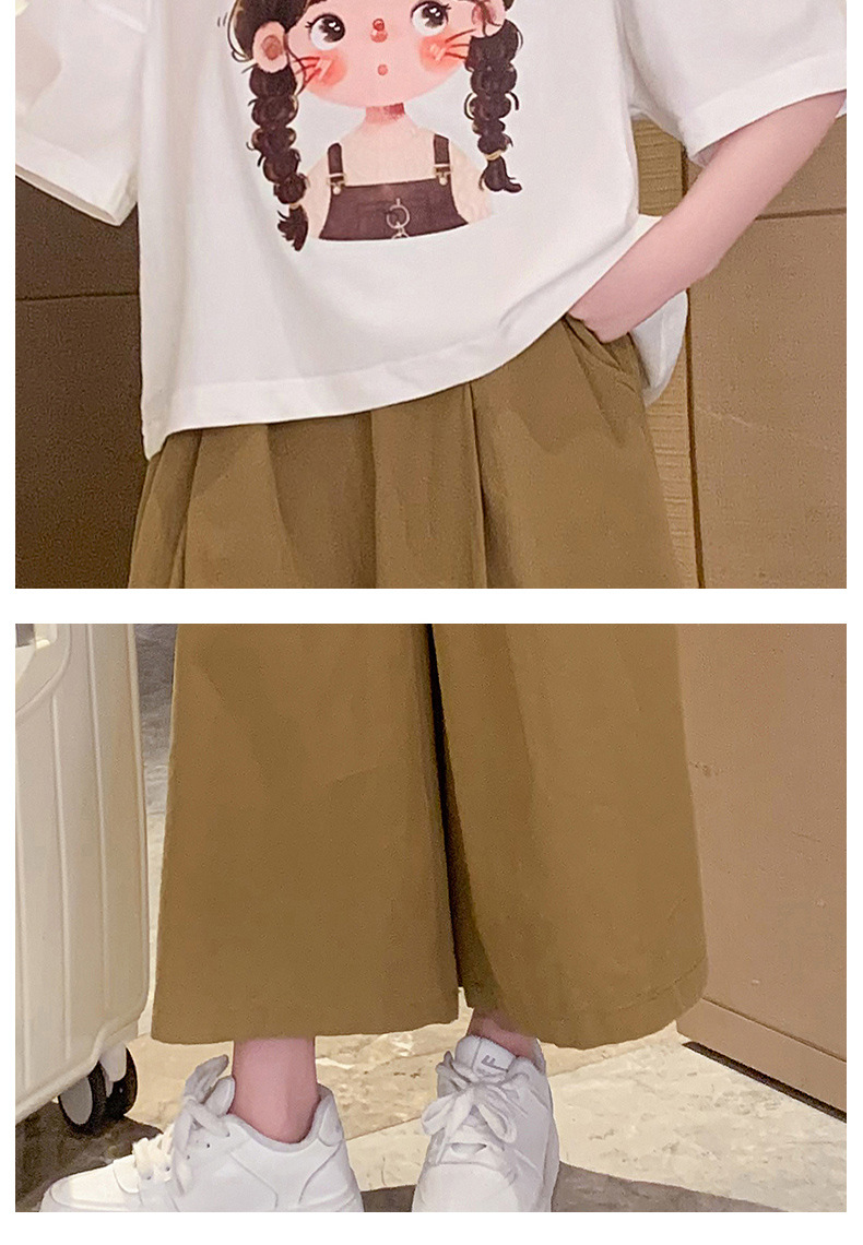 소녀의 패션 여름 투피스 세트 2024 새로운 고등학교 만화 소녀의 중학생을위한 반팔 와이드 레그 바지 세트