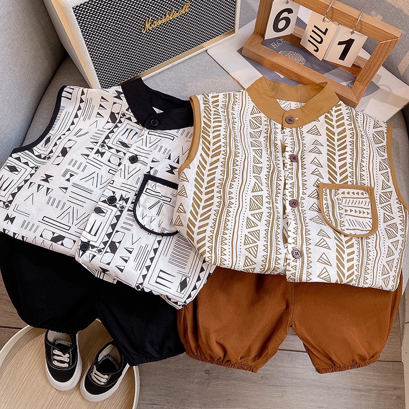 소년 조끼 반소매 여름 세트 여름 새로운 패션 중소 어린이 아기 전체 인쇄 삼각형 조끼 세트