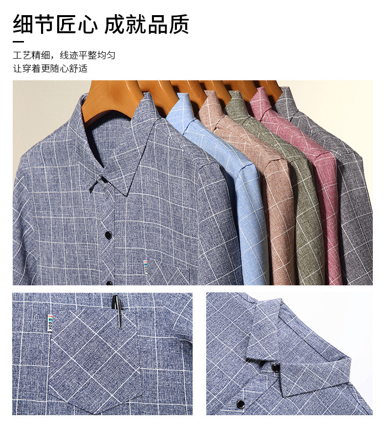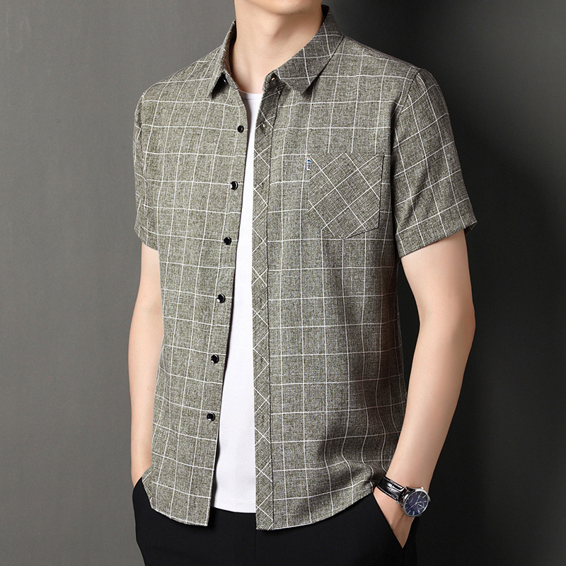 2024夏季新款中年男士棉麻衬衫轻商务翻领休闲时尚格子短袖开衫男
