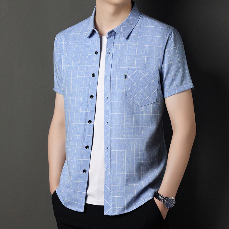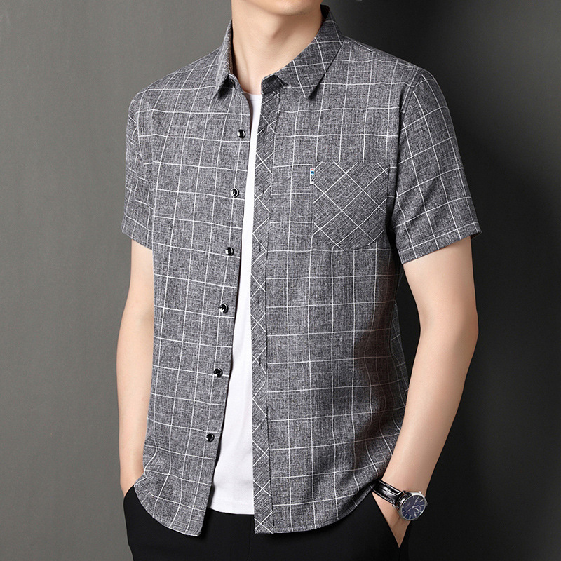 2024 여름 새로운 중년 남성면 및 린넨 셔츠 가벼운 비즈니스 옷깃 캐주얼 패션 체크 무늬 반팔 카디건 남성스토어 가기