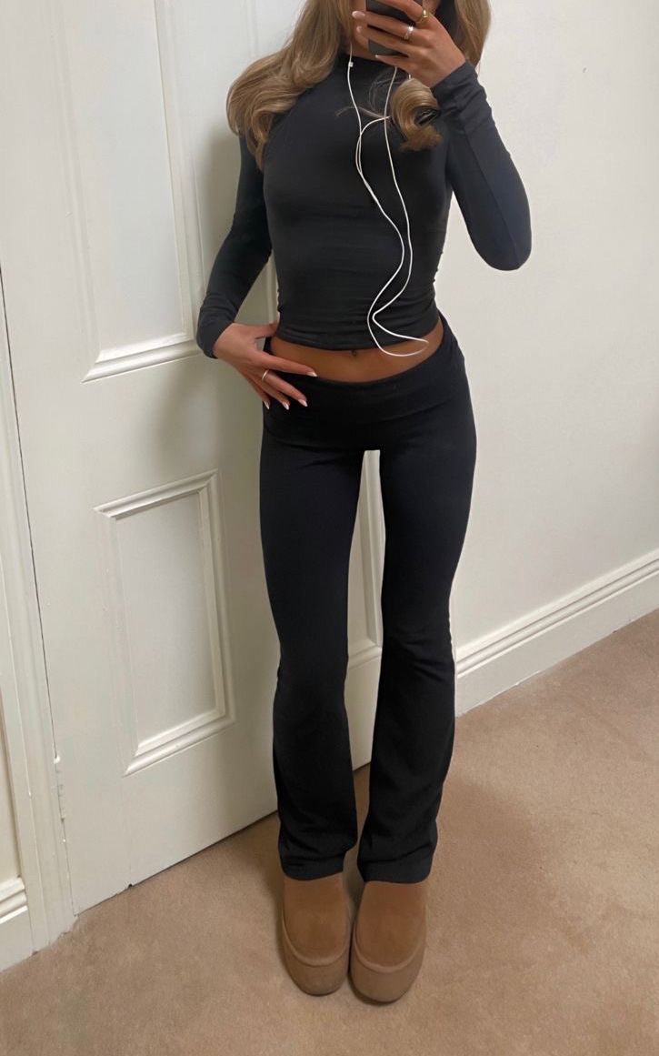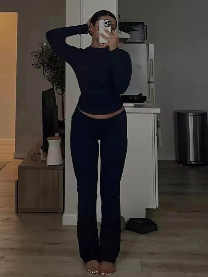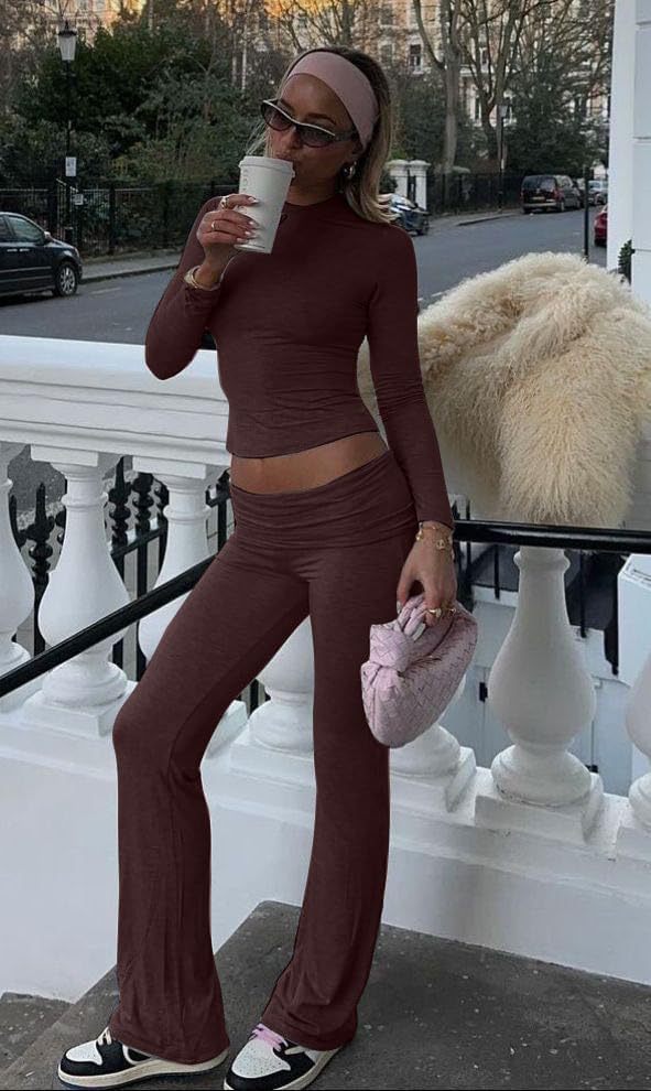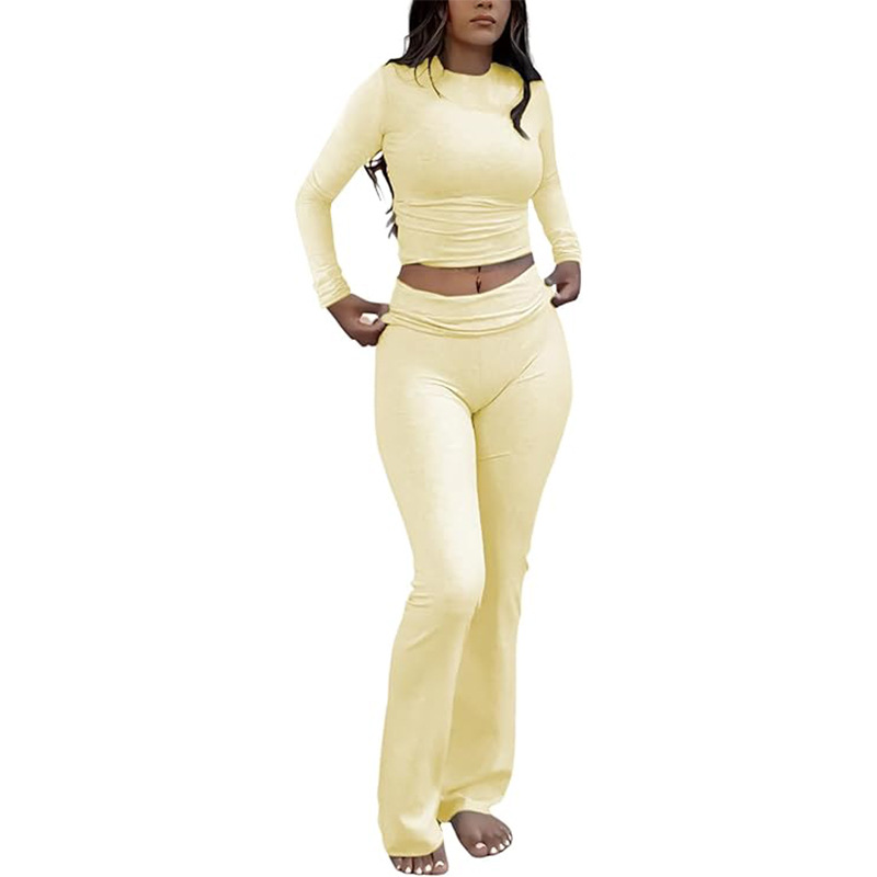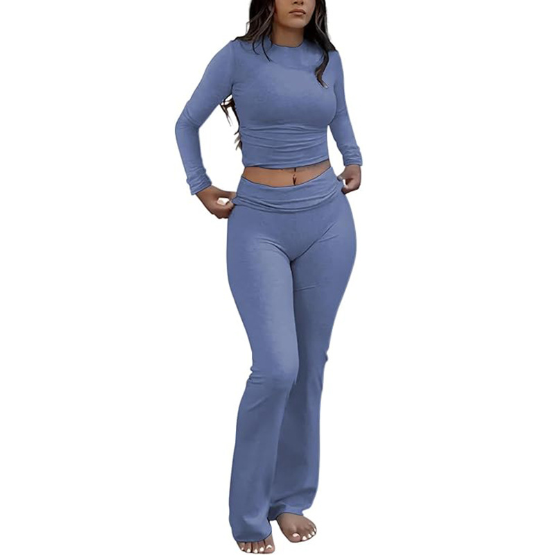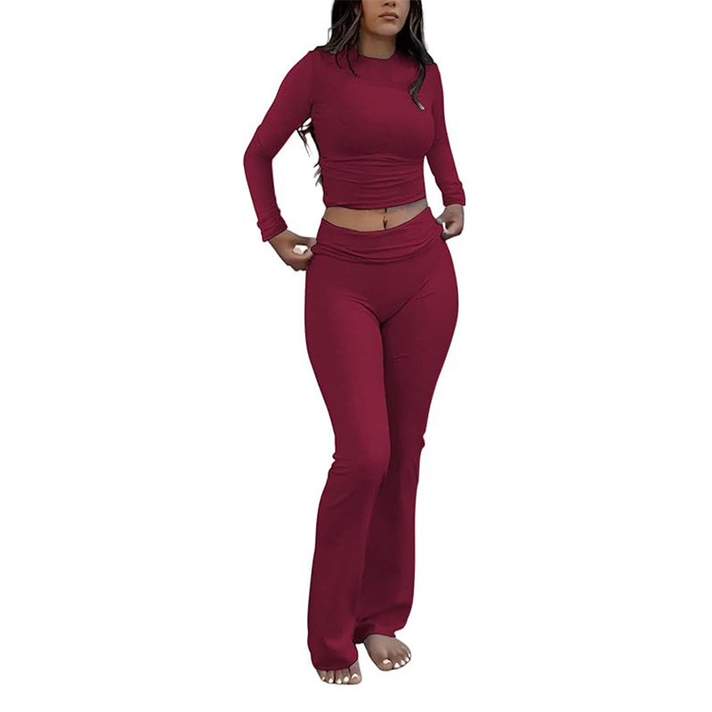 대외 무역 레저 운동 여성 투피스 크루 넥 긴 소매 낮은 허리 플레어 팬츠 스포츠웨어 세트 도매 투피스 세트스토어 가기